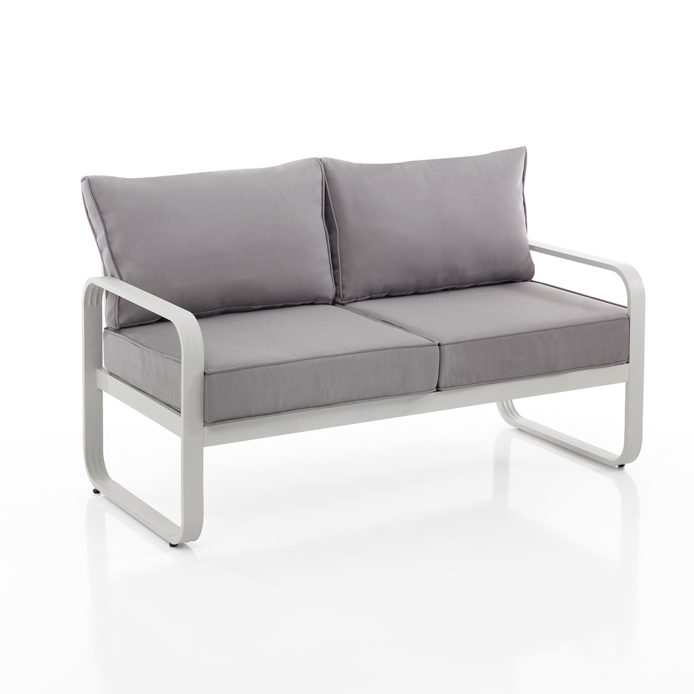 Este sofá de dois lugares é o emblema do conforto minimalista para espaços exteriores . As suas linhas limpas e estrutura em alumínio oferecem uma estética moderna e cativante que se adapta com versatilidade tanto a jardins modernos como a terraços de estilo mais clássico.