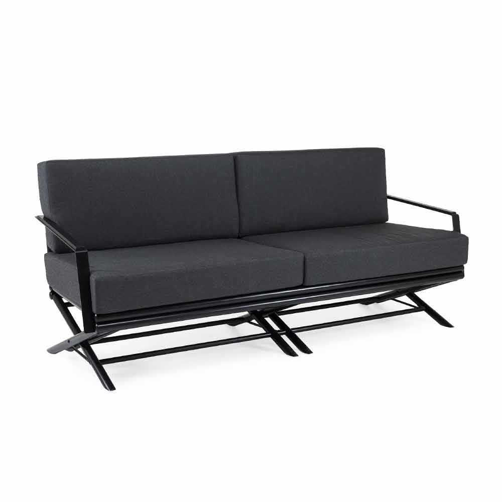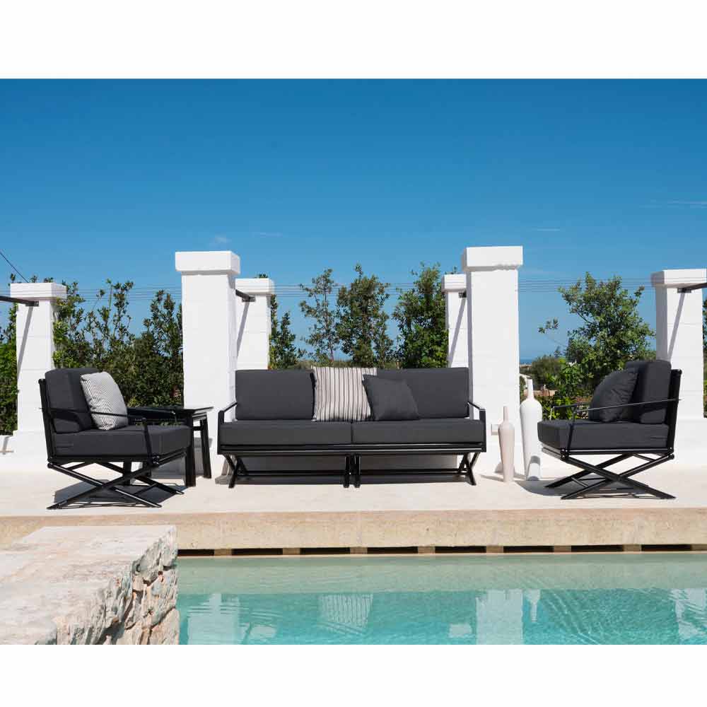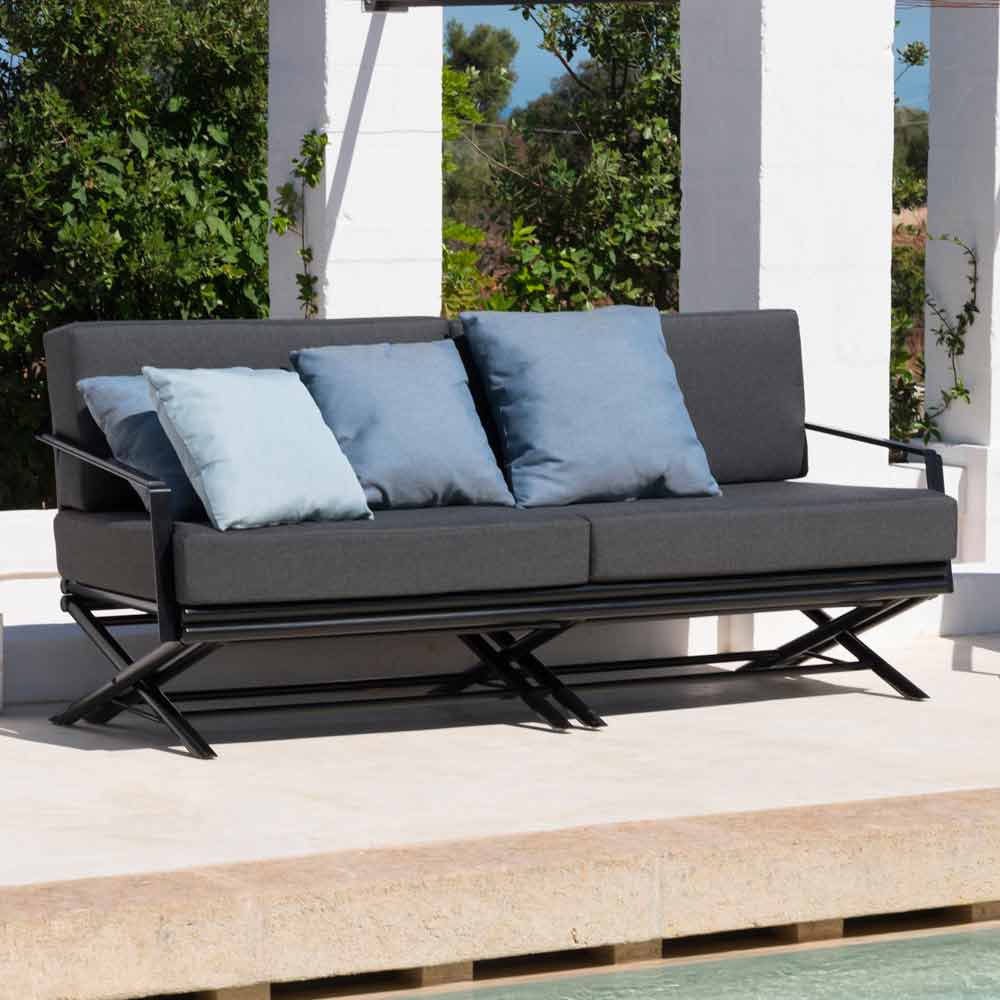 Sofá 3 lugares ao ar livre em madeira natural ou preta e almofadas em tecido, design de luxo made in Italy.