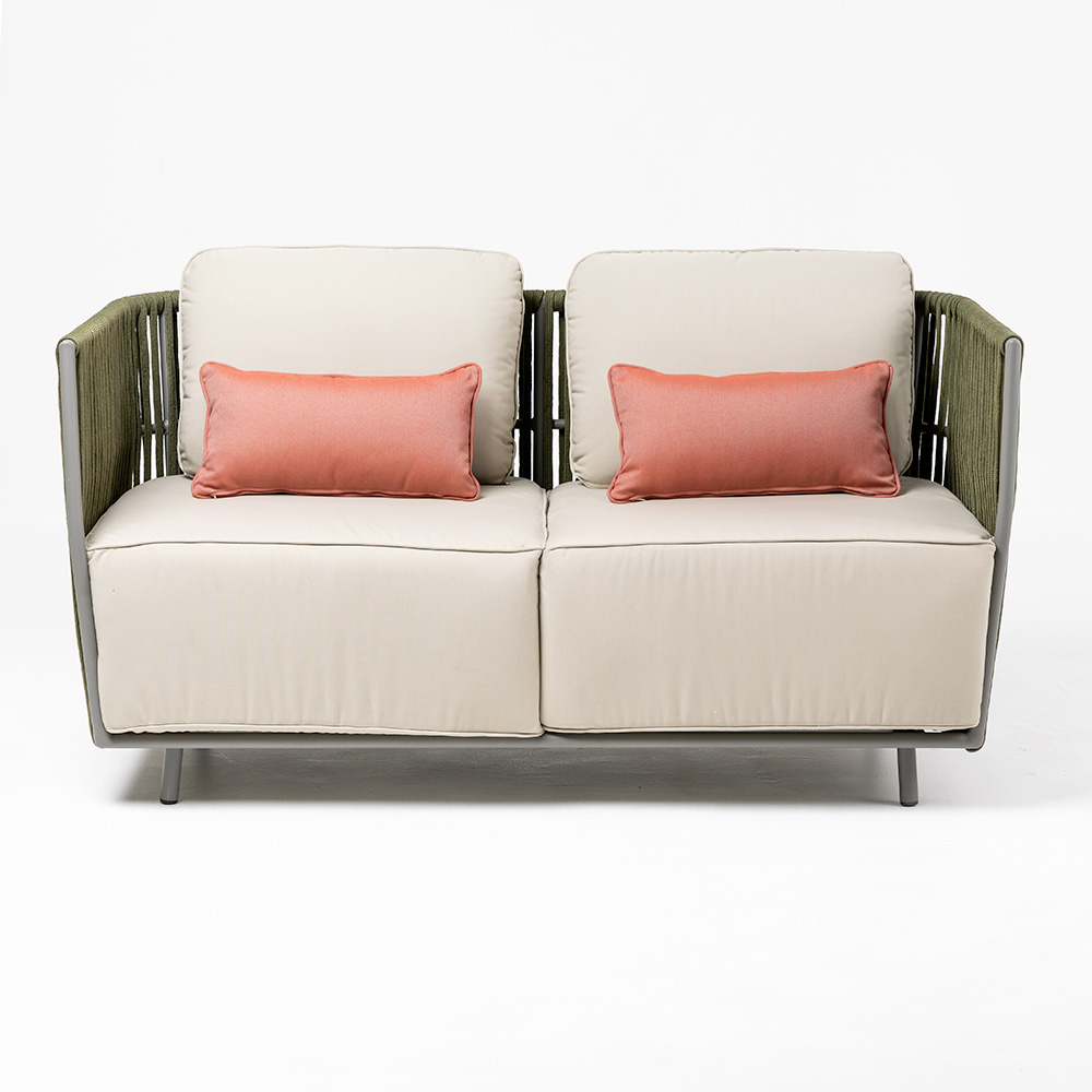 Este sofá com assentos grandes é fácil de manusear e resistente, mas ao mesmo tempo mantém um design limpo e essencial. Seu estilo moderno lhe confere um caráter forte, tornando-o perfeito para mobiliar espaços ao ar livre, tanto em ambientes privados quanto contratados.