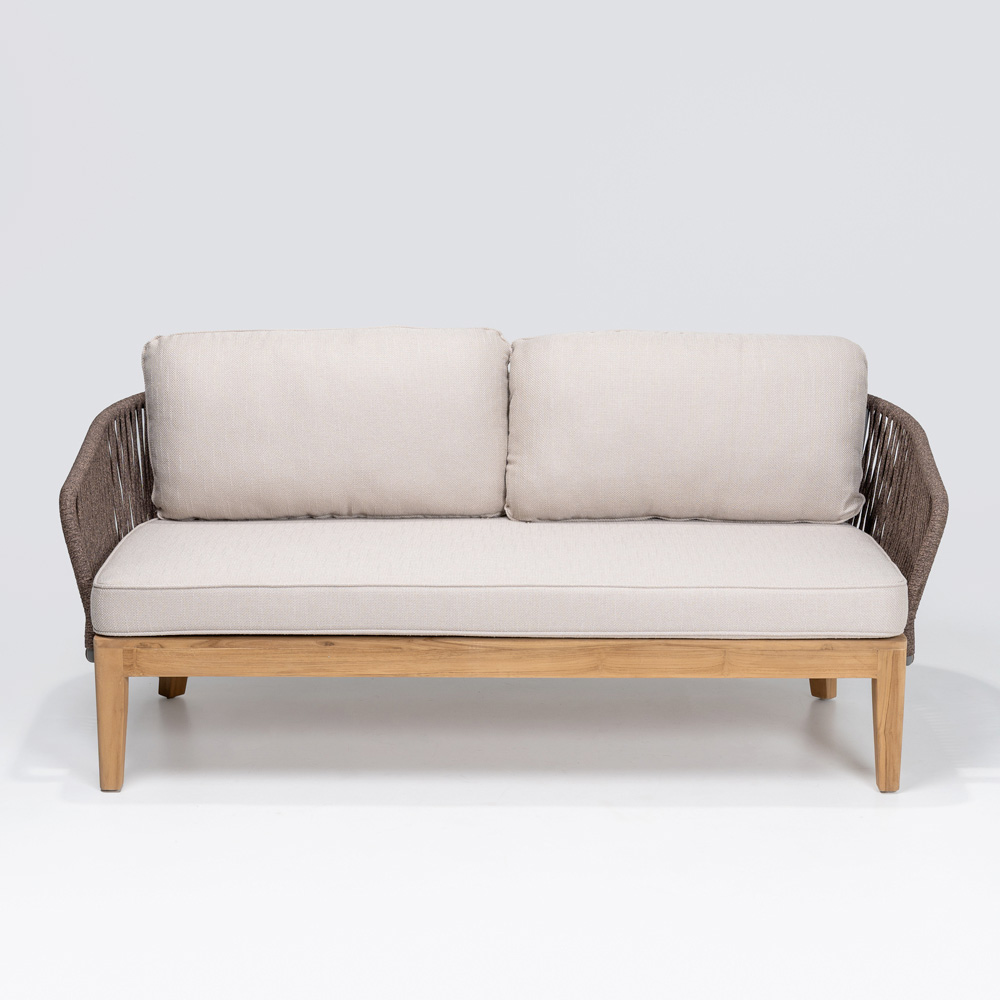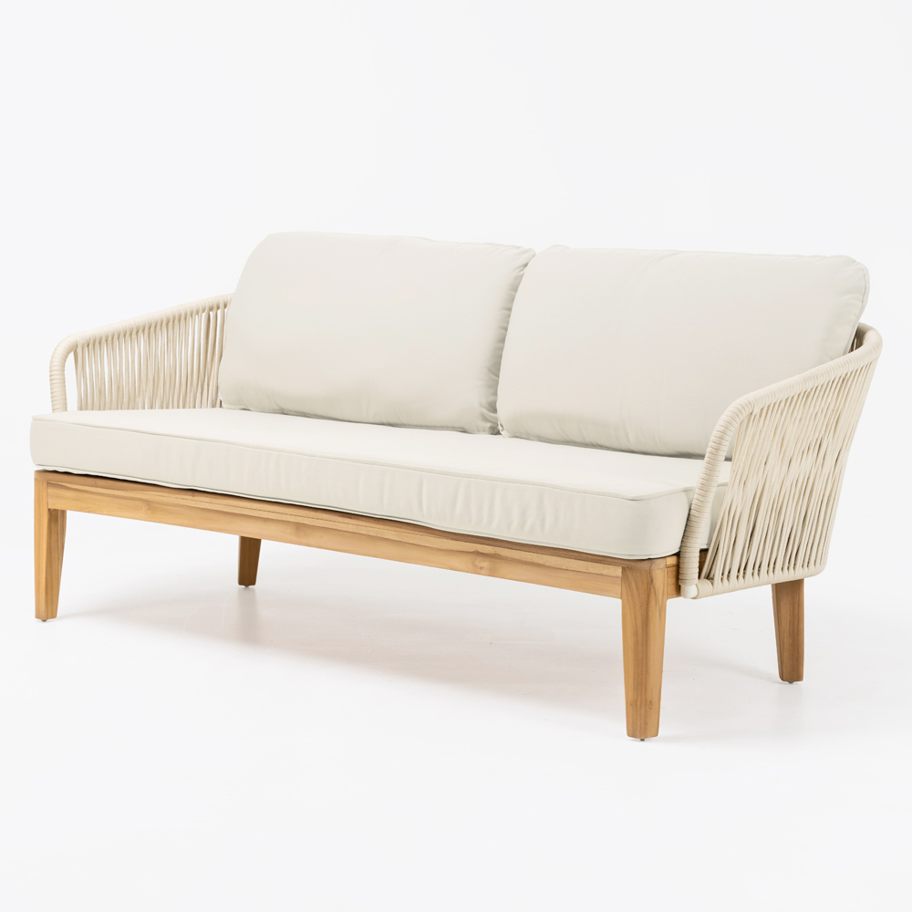 Sofá de exterior em madeira de teca e tecido de polietileno com almofadas.