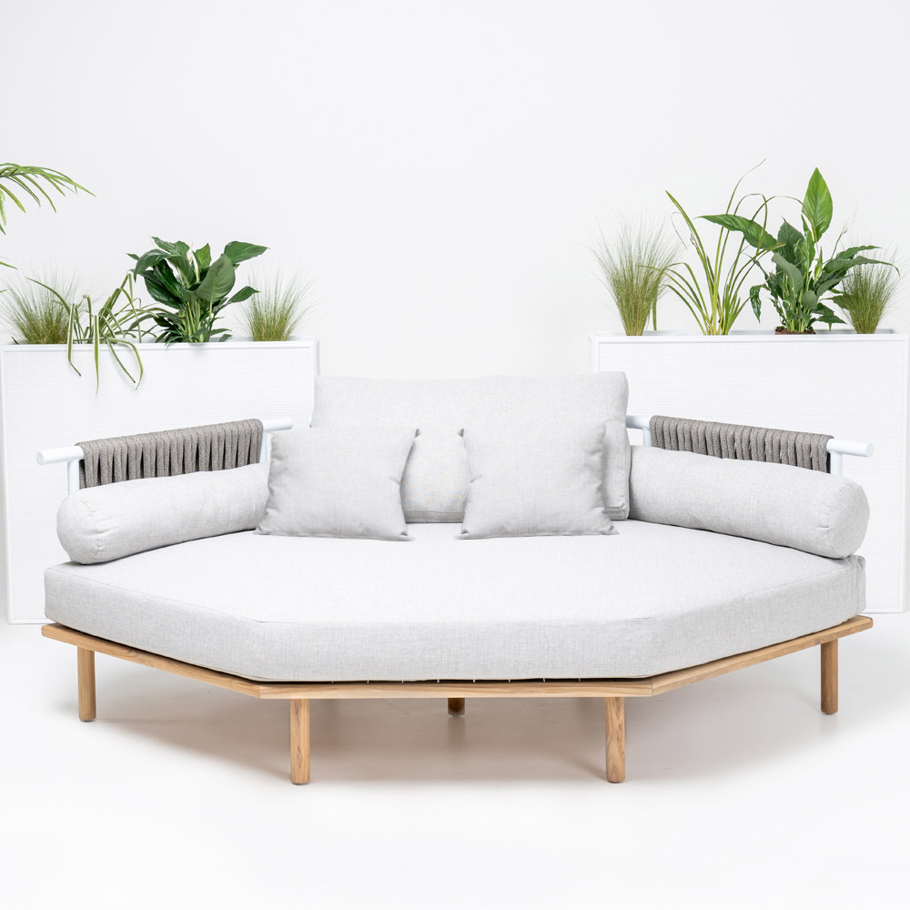Sofá de canto de jardim hexagonal em teca, encostos em alumínio e trama em Olefin/PP ROPE e almofada