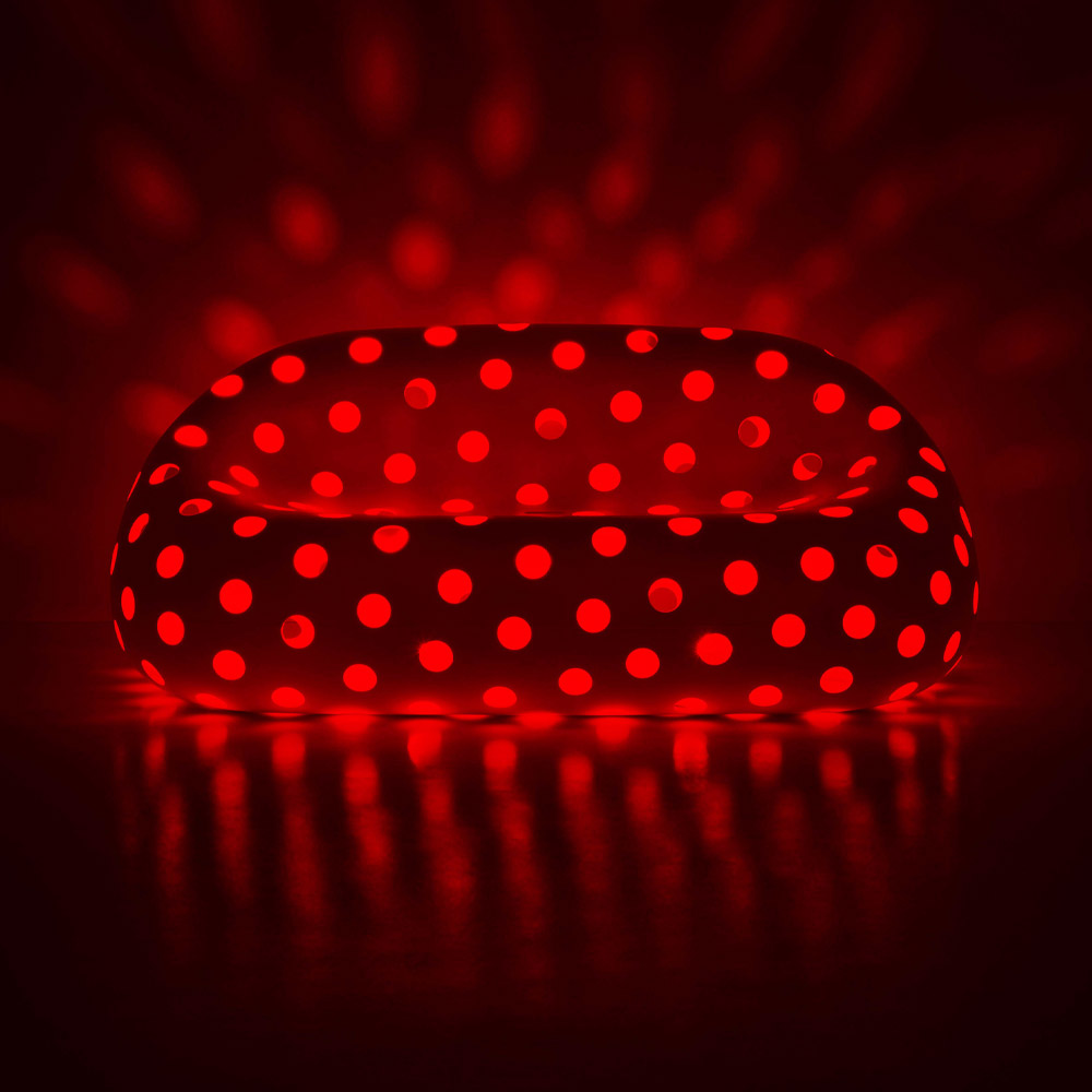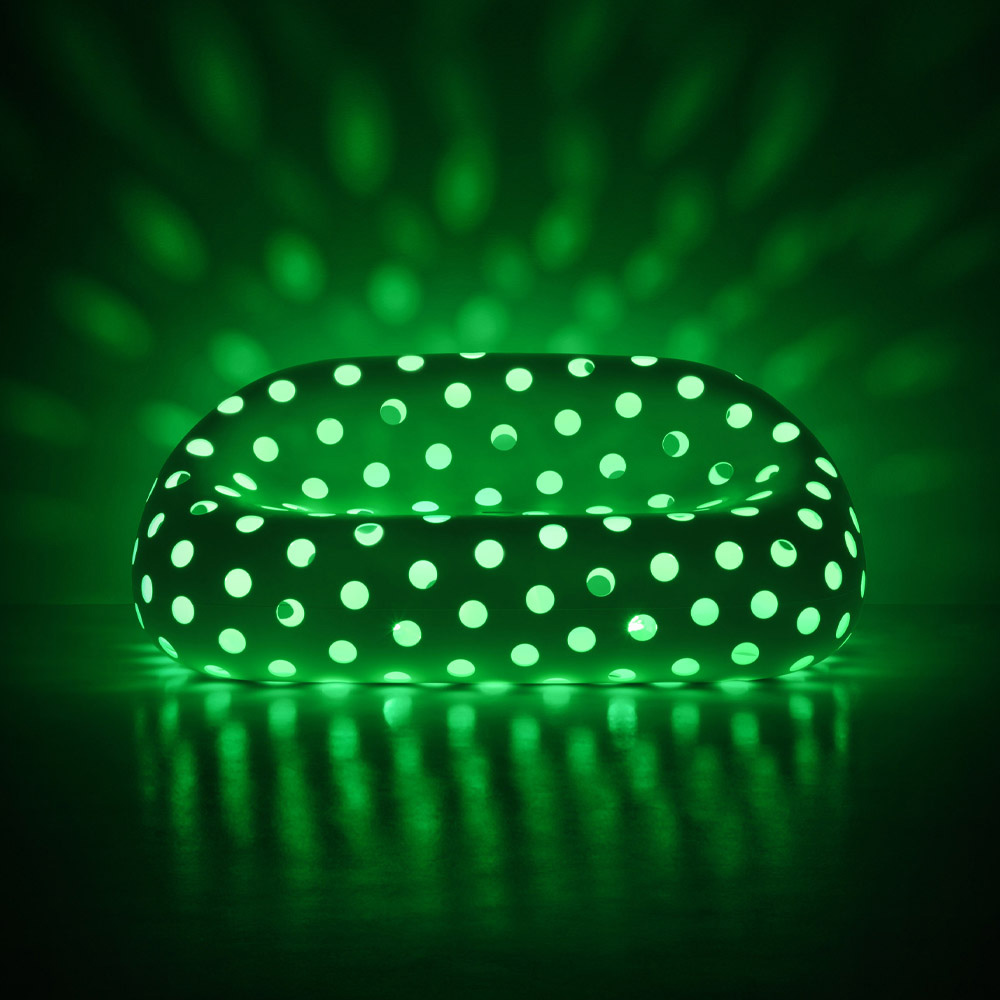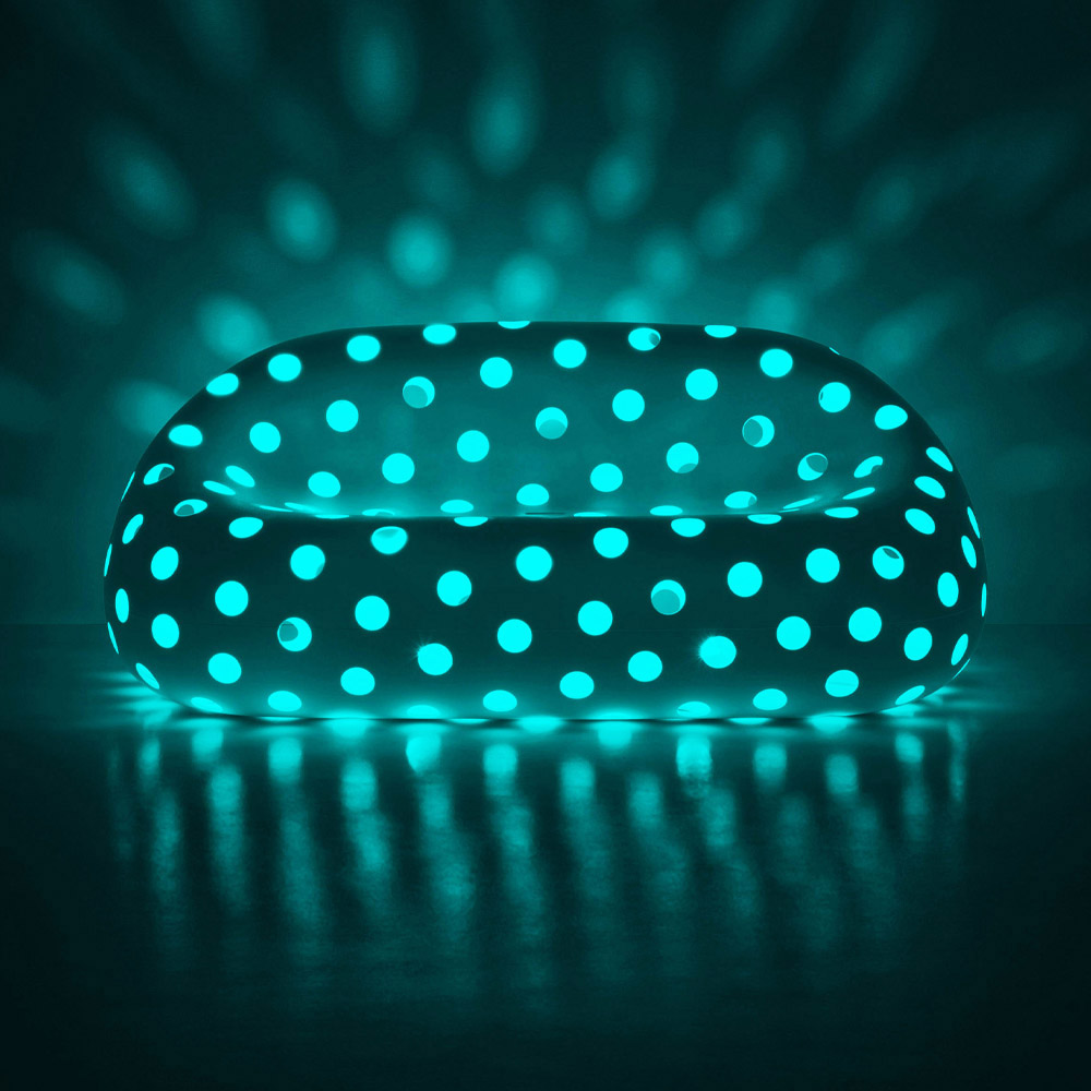 Sofá de jardim fabricado na Itália em polietileno branco opaco completo com kit de luz LED RGB colorido para uso externo. Uma ideia de mobiliário original cuja figura se caracteriza por linhas confortáveis e modernas que, juntamente com a iluminação LED, permitem tornar-se na combinação perfeita de funcionalidade e design . O seu acabamento mate torna-o particularmente resistente ao sol, aos choques e ao calor, mas também extremamente elegante e com uma estética requintada. O design único e inovador que enfatiza as formas tem um grande impacto cênico e o torna ideal para ambientes externos que precisam de uma solução de mobiliário com forte personalidade. A superfície perfurada confere uma leveza sem precedentes ao sofá, criando jogos de luz espetaculares graças à fonte de luz inserida no interior.