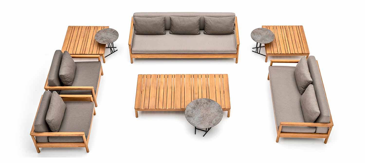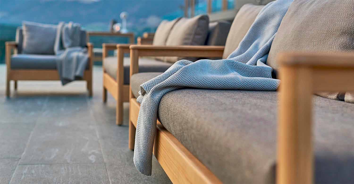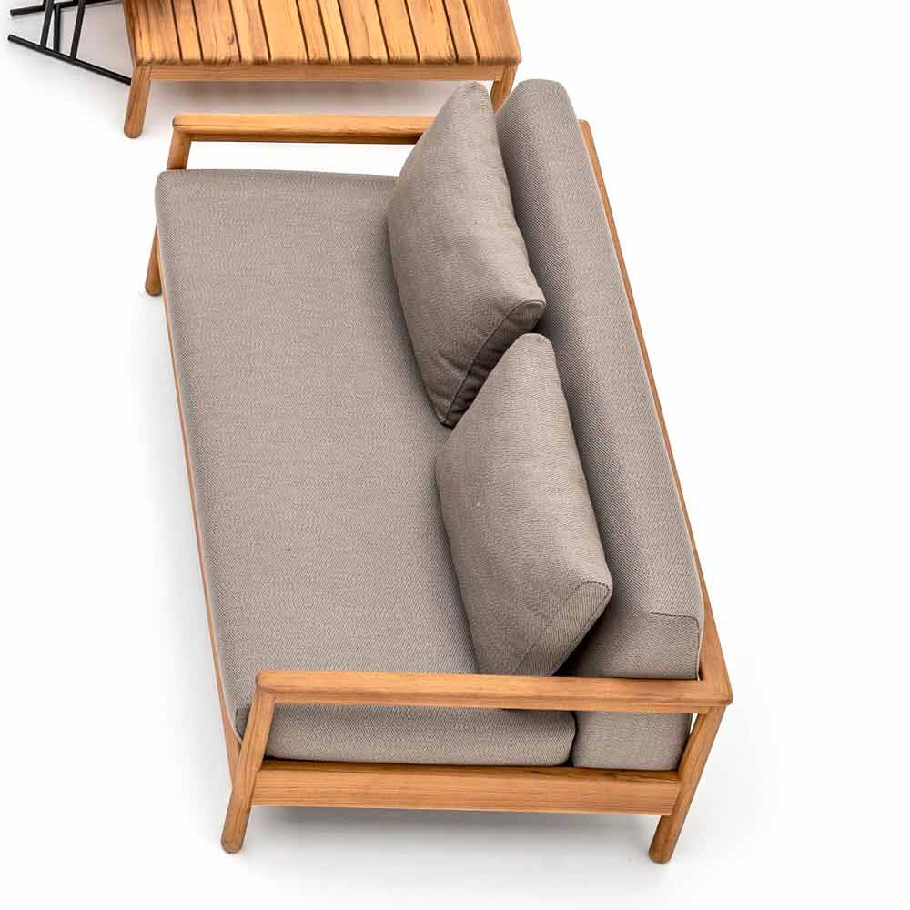 Bali é um grandioso sofá de jardim, caracterizado por uma estrutura de suporte visível em certiifacta de plantação de teca sólida e assentos e costas duplas cobertas em tecido e acolchoadas com borrachas Dryfeel.