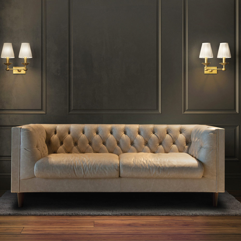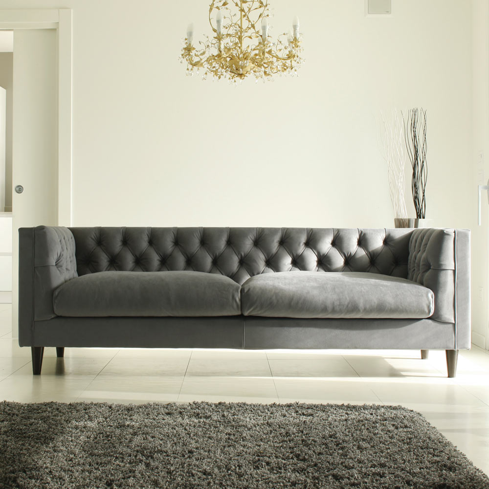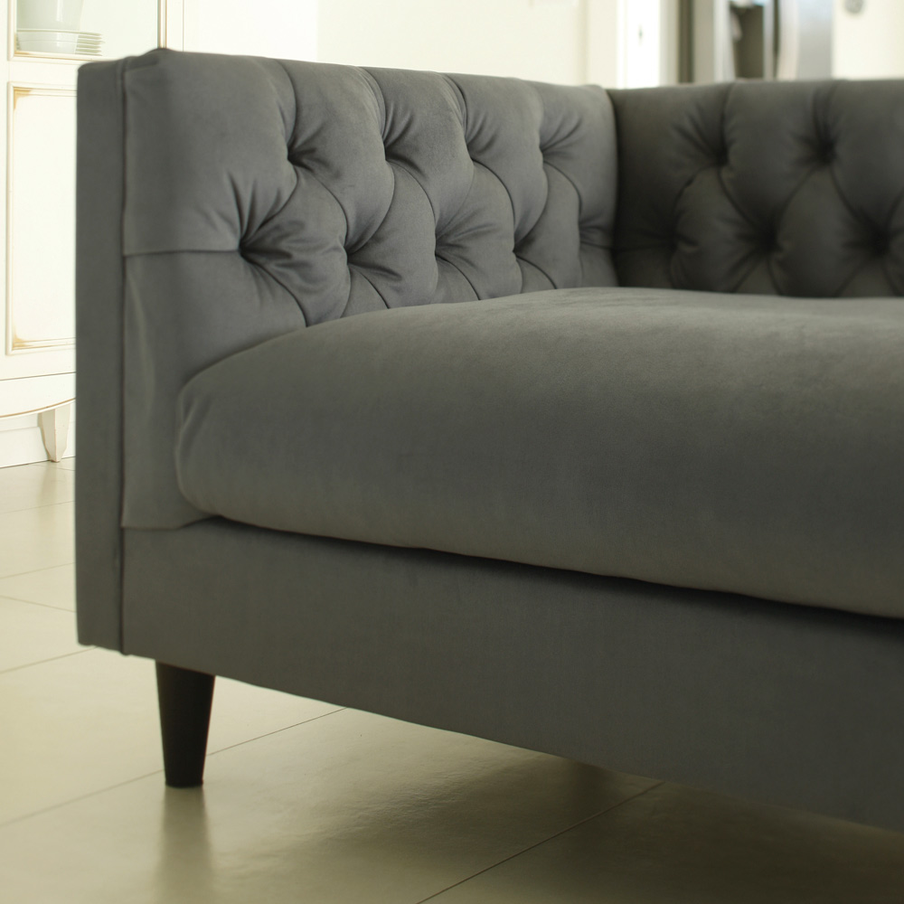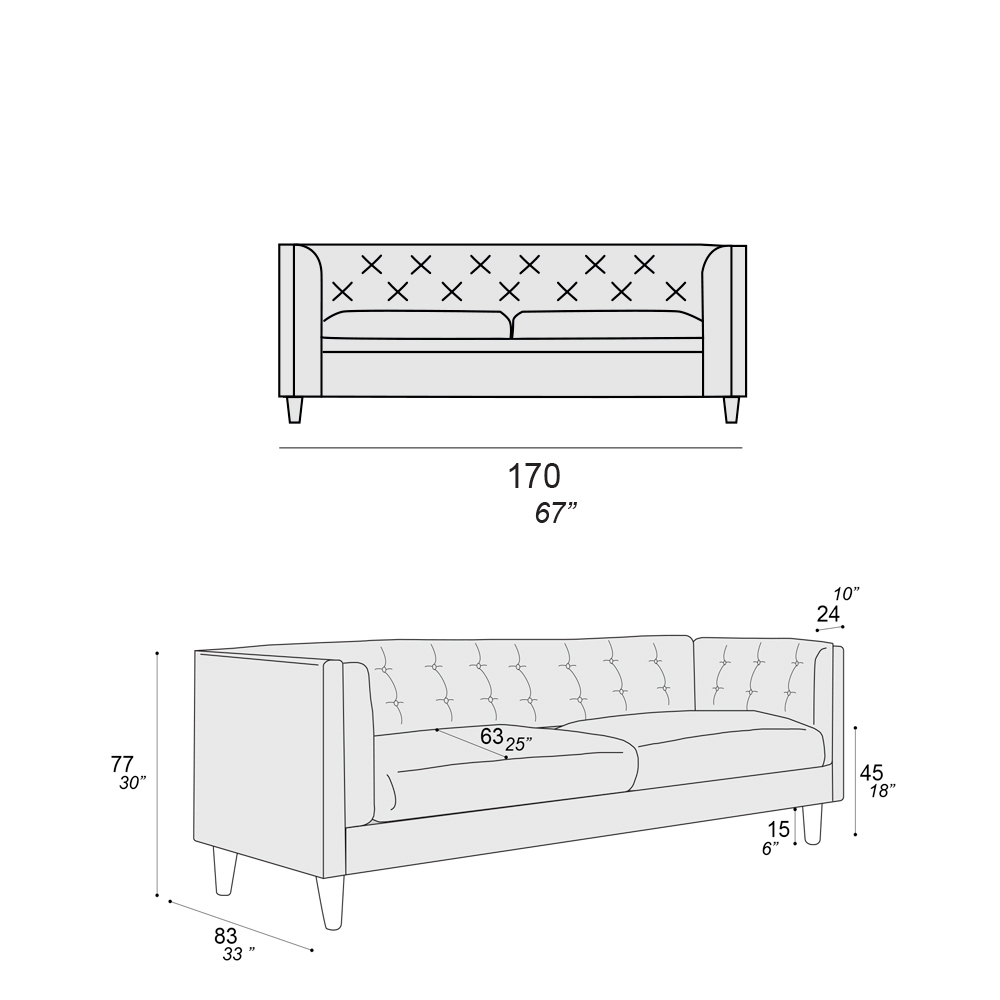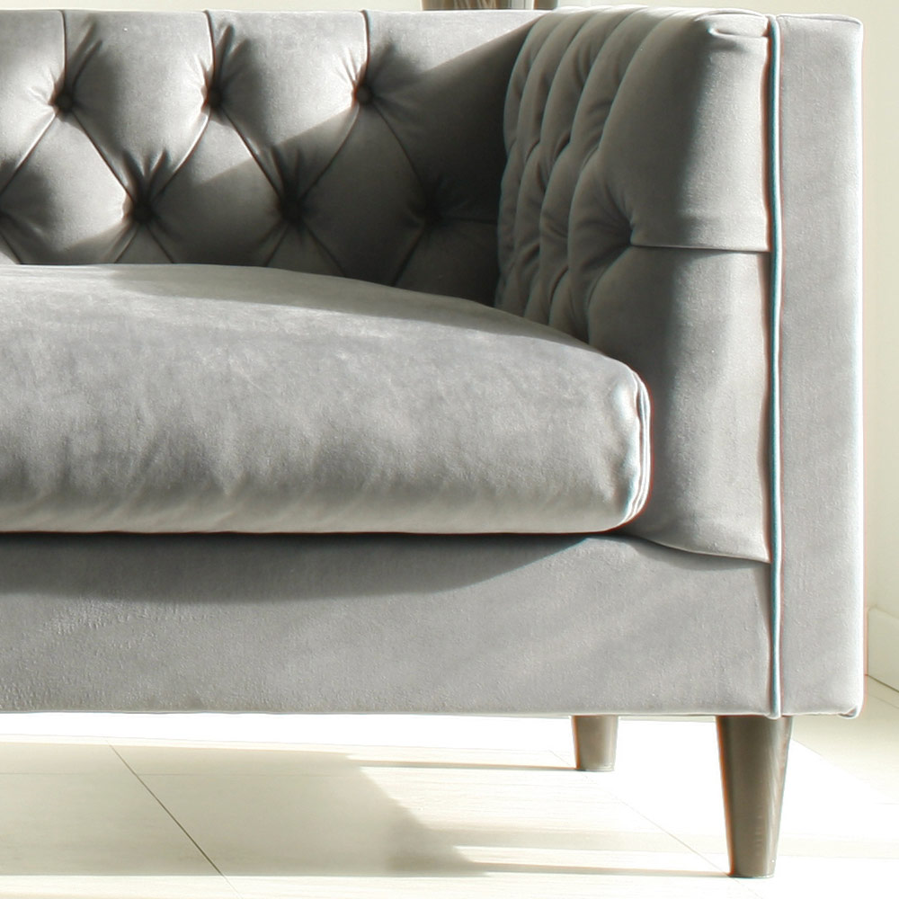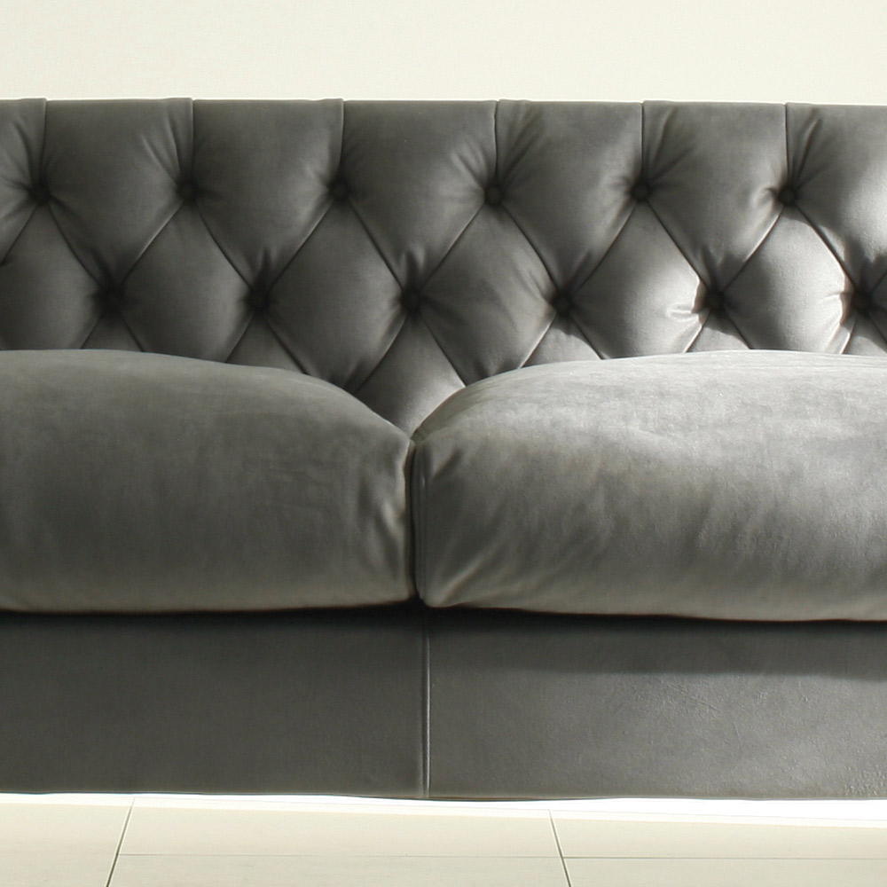 madeira de faia. O sofá combina o classicismo com um visual moderno e refinado. Seus tufos abotoados e braços arredondados evocam elegância, enquanto a estrutura de madeira e o estofamento generoso garantem conforto. O estofamento de qualidade, disponível em várias cores, enriquece o visual do sofá. As pernas finas de madeira adicionam um toque contemporâneo, tornando o sofá adequado para interiores tradicionais e modernos, dando-lhe uma atmosfera aconchegante e sofisticada.
