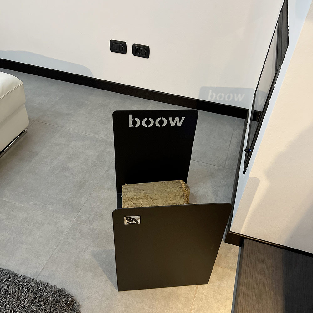Suporte de lenha para lareira em aço pintado a pó atóxico de alta qualidade. Desenhado, desenhado e feito à mão na Itália, com o objetivo de destacar não só a utilidade do porta-toras em si, mas também o seu valor estético.
