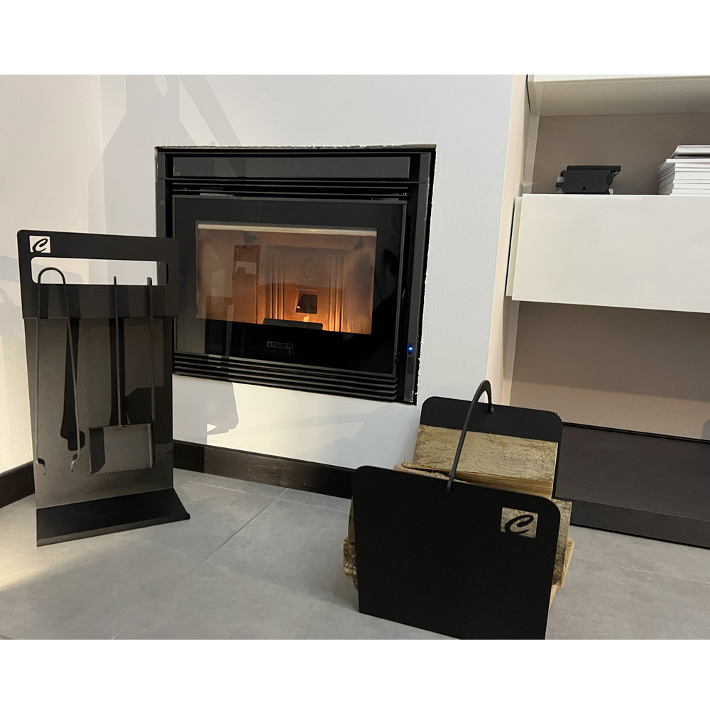Porta-lenha de design moderno e minimalista para lareira interior em aço preto, fabricado na Itália.