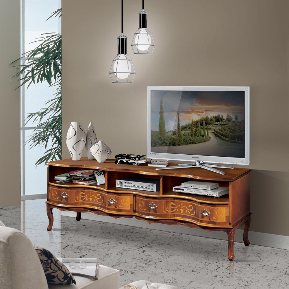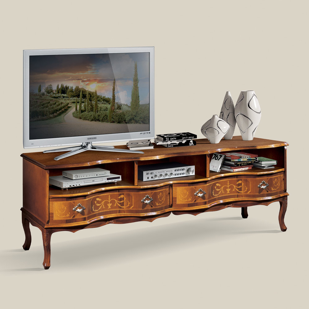 Suporte de TV de madeira em estilo clássico com compartimentos e gavetas, fabricado na Itália.