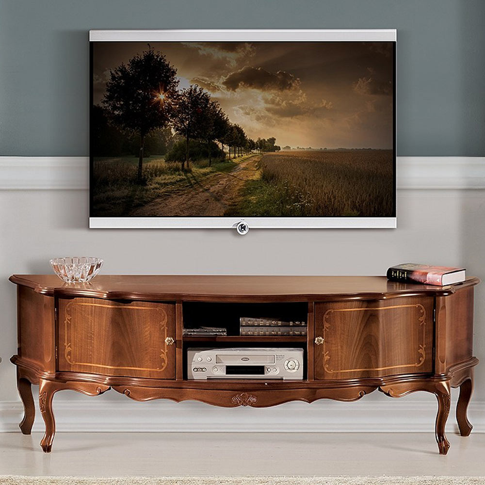 Suporte de TV clássico de madeira com portas e compartimentos, feito na Itália.