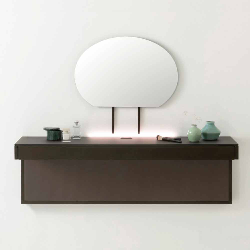 Moderno e elegante móvel suspenso (montagem mural) made in Italy com tampo em vidro acetinado anti-impressões digitais com acabamento em bronze e orifício para cabo, estrutura metálica pintada a castanho e painel vertical amovível em acrílico . Também é completo com uma gaveta frontal removível posicionada sob a parte superior e iluminação LED.