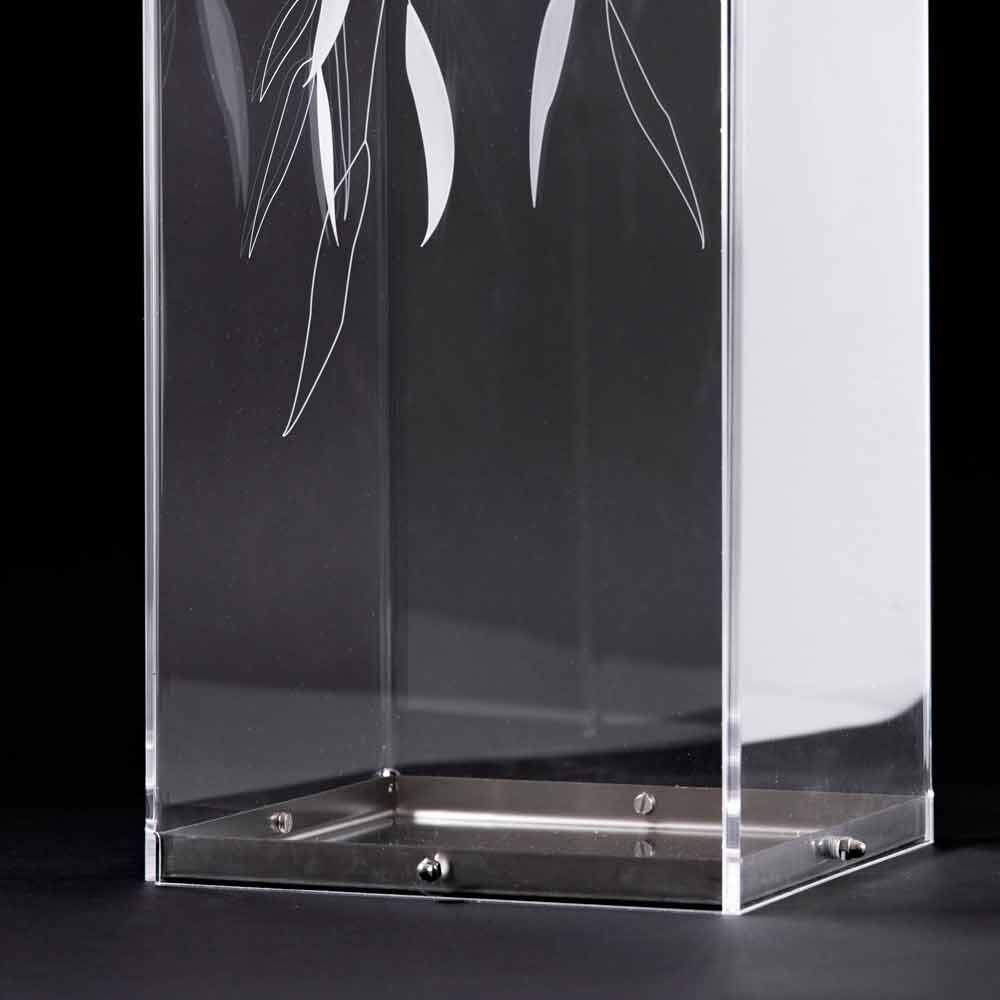 O porta-guarda-chuvas em plexiglass transparente é caracterizado pelas decorações marcadas a laser nas folhas e na base em aço inoxidável.