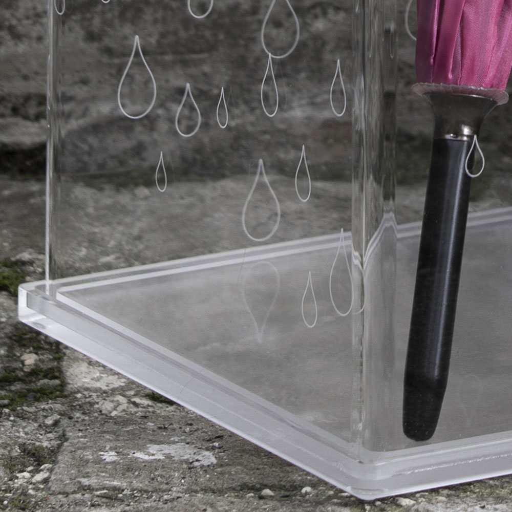 Este porta-guarda-chuva retangular possui uma estrutura inteiramente feita de cristal acrílico transparente lapidado e gravado a laser com decorações representando gotas de água, para uma espessura de 3 mm e 10 mm para a base.