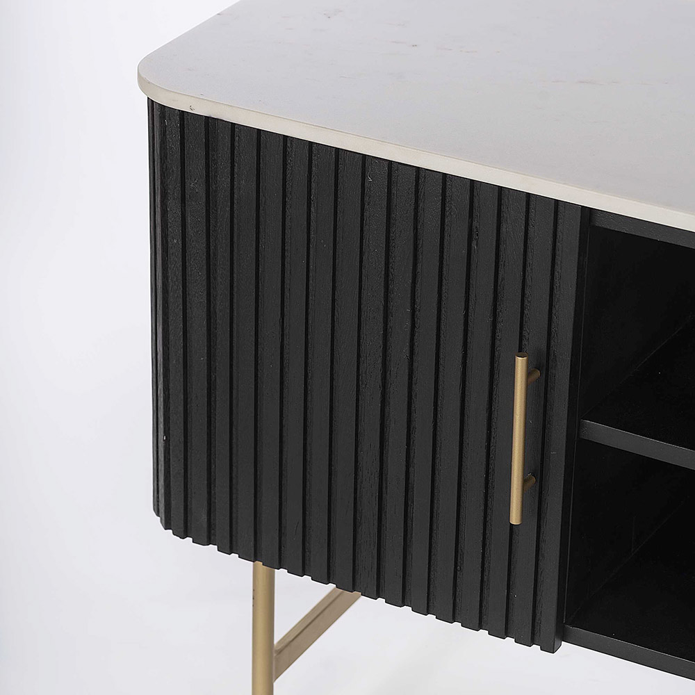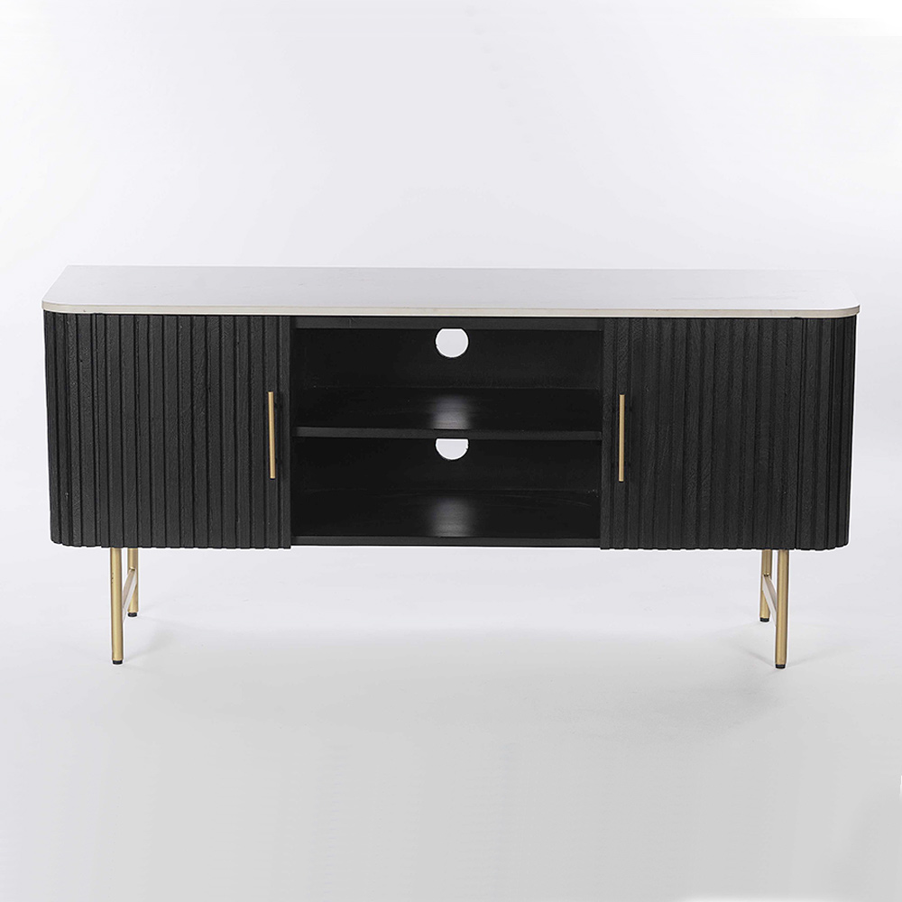 Este stande de TV é a essência da elegância contemporânea, combinando design moderno e funcionalidade . A estrutura de madeira preta ranhurada dá um efeito tridimensional sofisticado, perfeitamente equilibrado pelo tampo liso que adiciona um toque refinado. As finas mas robustas pernas de metal dourado dão leveza visual e garantem estabilidade.