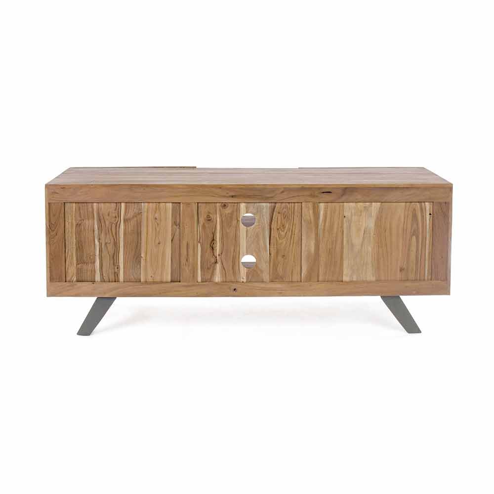 Móvel tv com estrutura em madeira de manga e aplicações em metal.