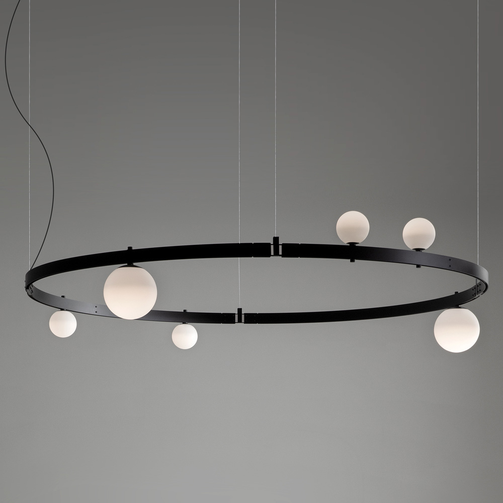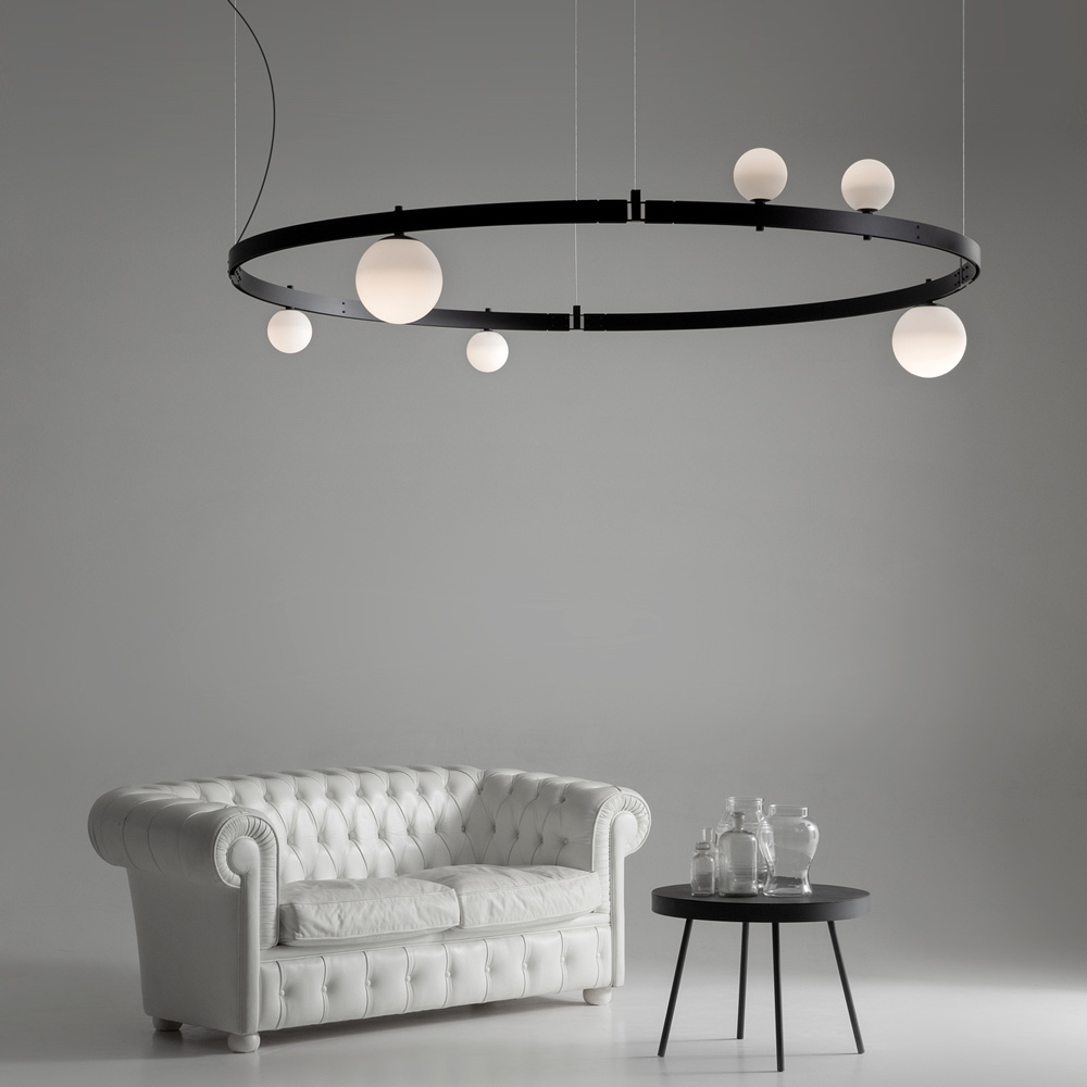 A barra de apoio circular lembra as estruturas de engenharia do passado e as estruturas modulares eletrificadas suportam corpos de iluminação ( esferas de vidro soprado de dois tamanhos diferentes) que podem ser colocadas em quantidade e disposição livre, sem o uso de cabos de energia elétrica, para máxima liberdade de expressão.