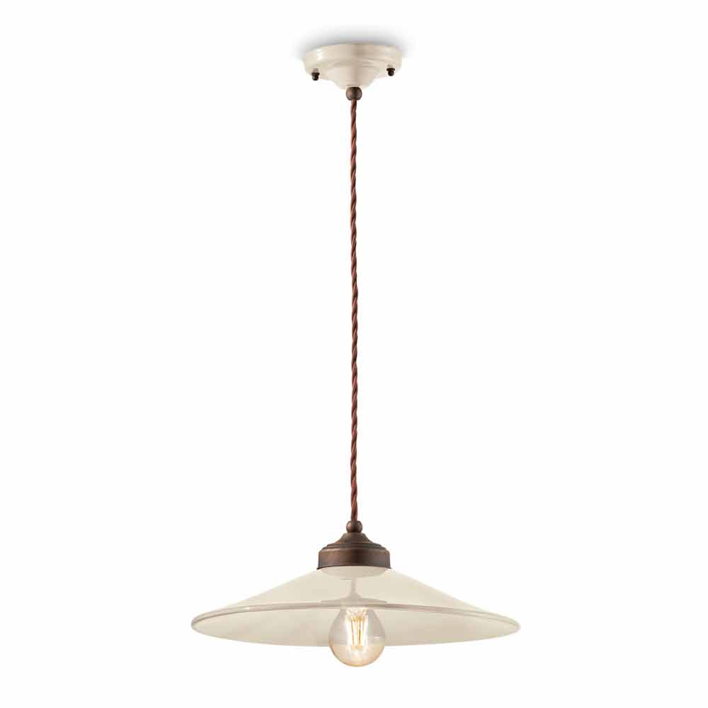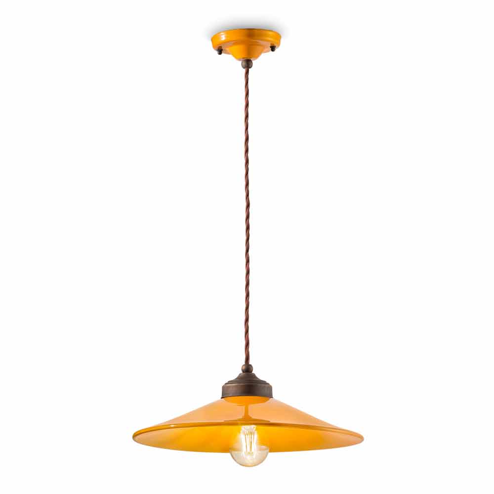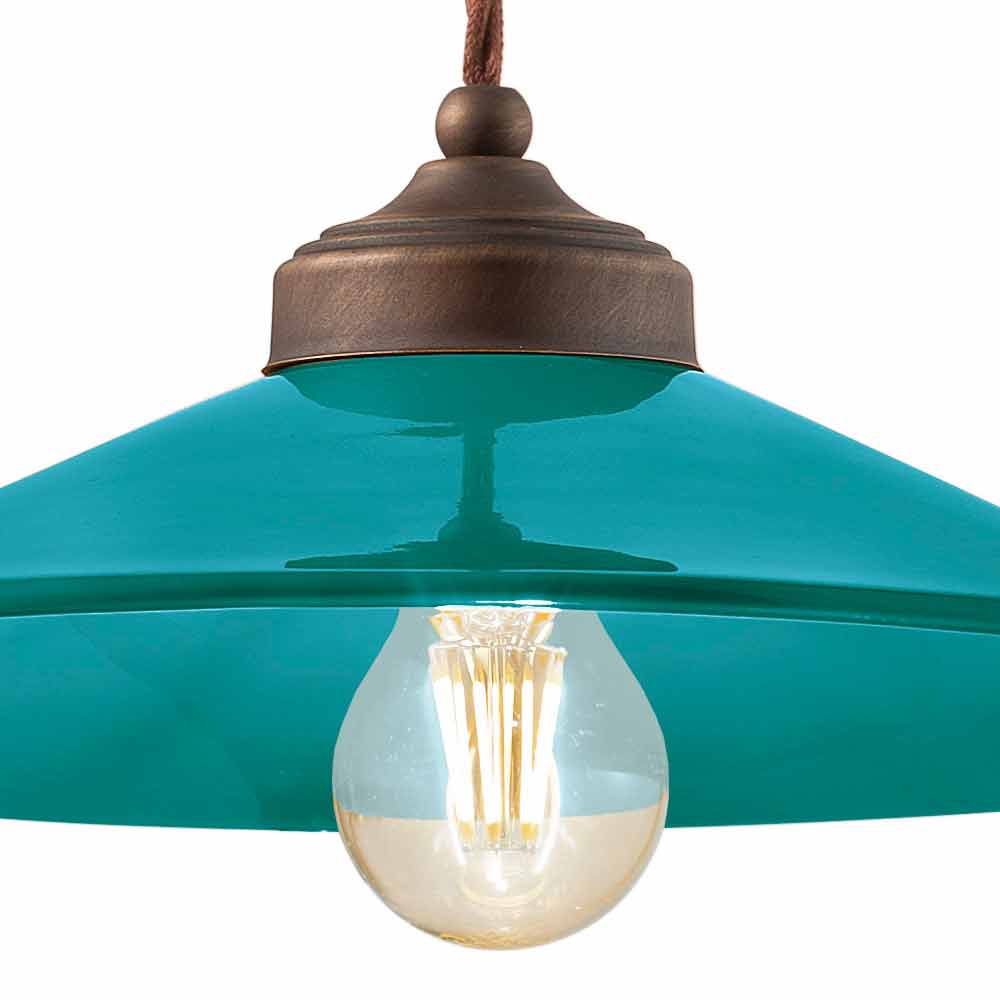 Esta bela suspensão consiste em uma estrutura de latão antigo com um difusor feito de cerâmica colorida brilhante, disponível em diferentes cores.