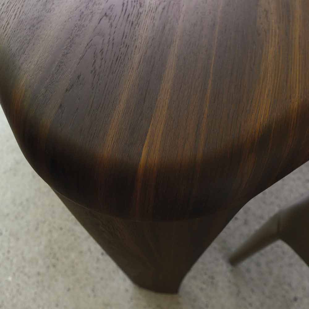 Uma mesa feita de madeira, seguindo um padrão livre, onde as linhas são suavemente curvadas e sem nenhuma borda.