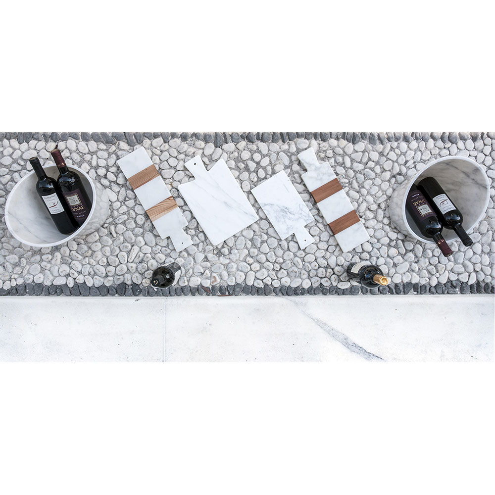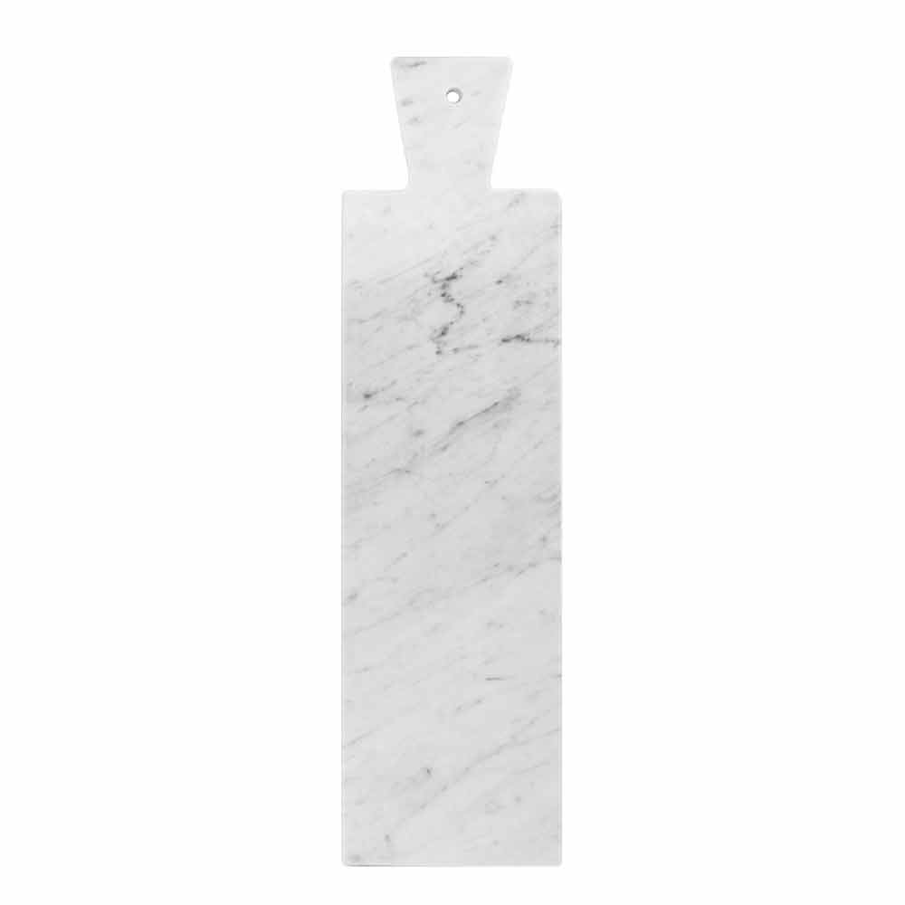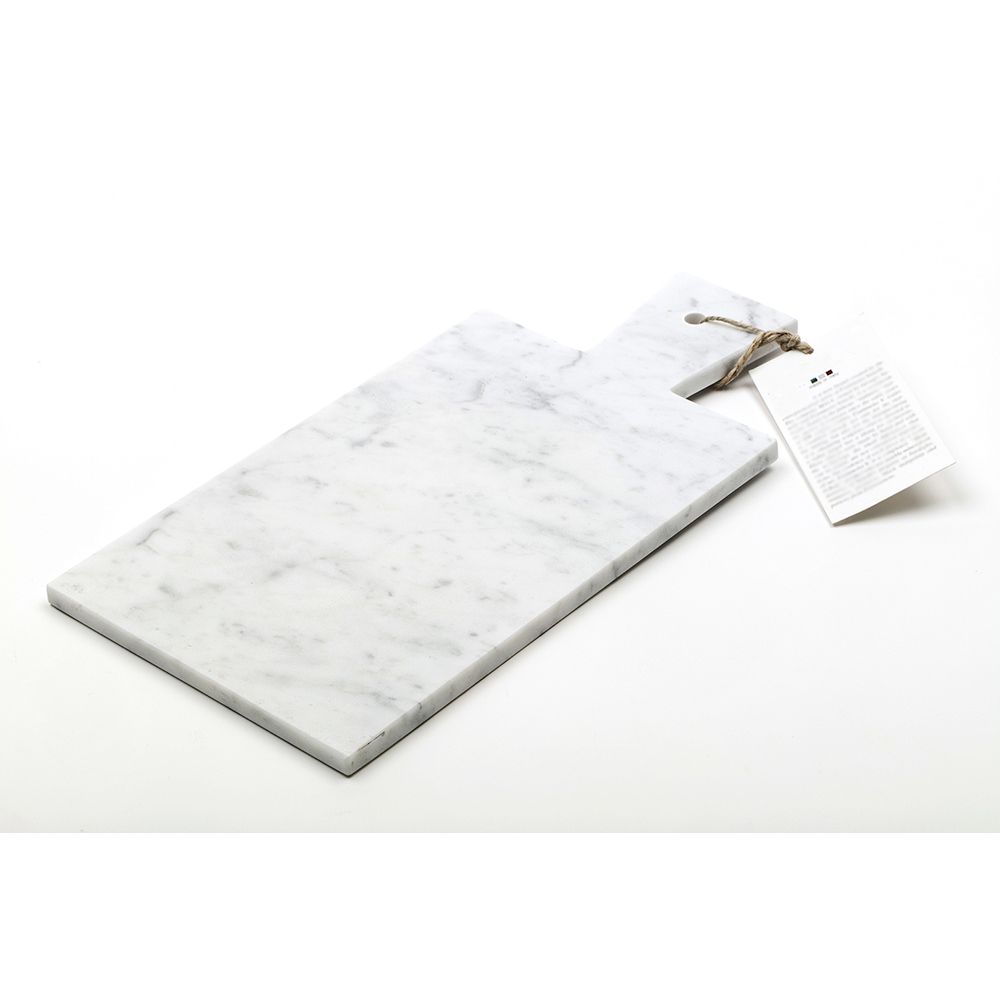 Tábua de corte retangular moderna que é caracterizado pelo mármore branco de Carrara de alta qualidade usada para sua fabricação. Inclui um prático orifício na pega que pode ser usado para pendurar. Deve ser considerada uma peça única, pois cada bloco de mármore é diferente em veios e tonalidades.