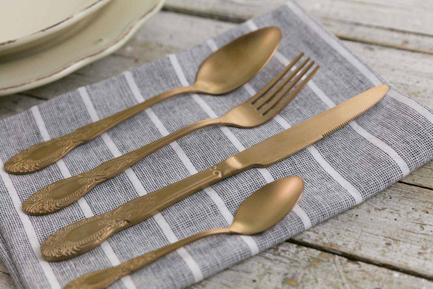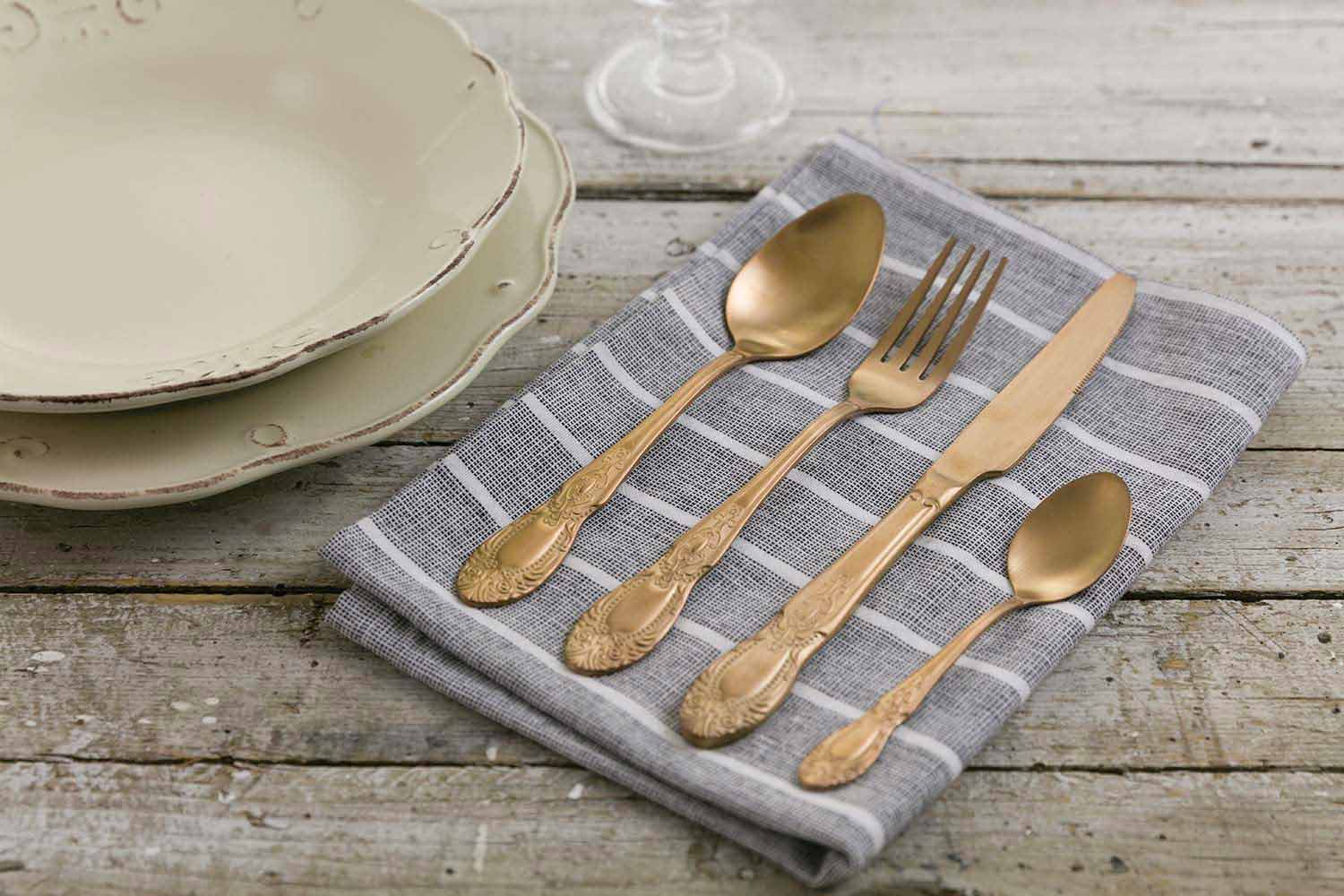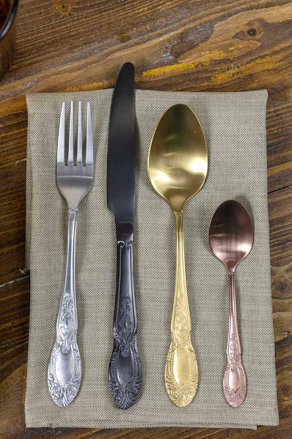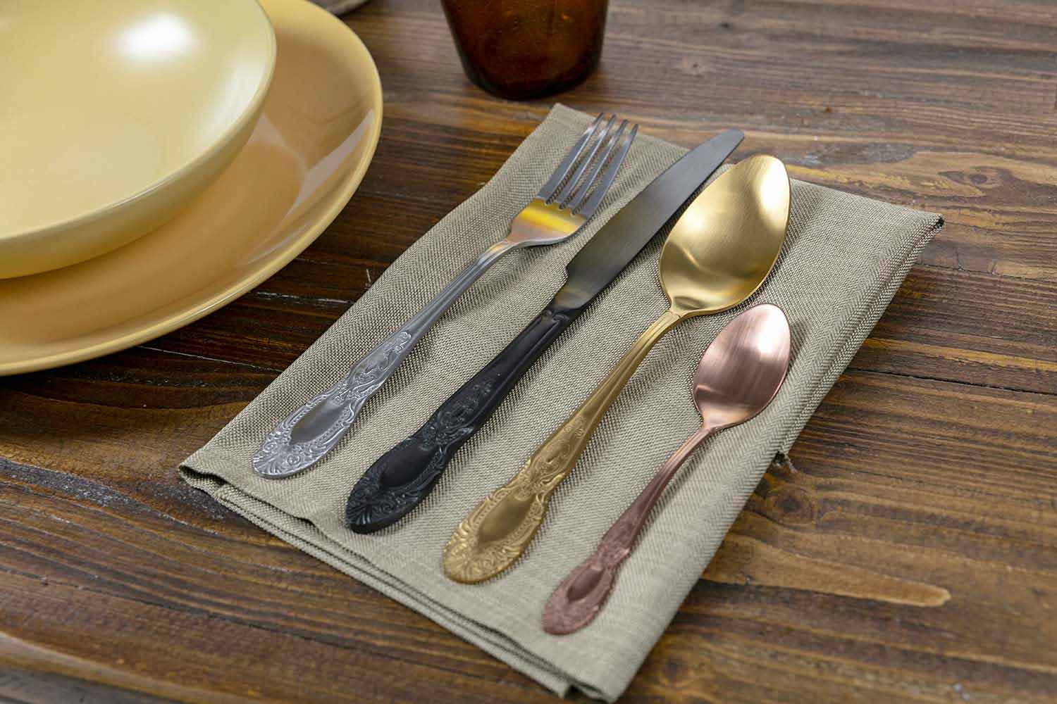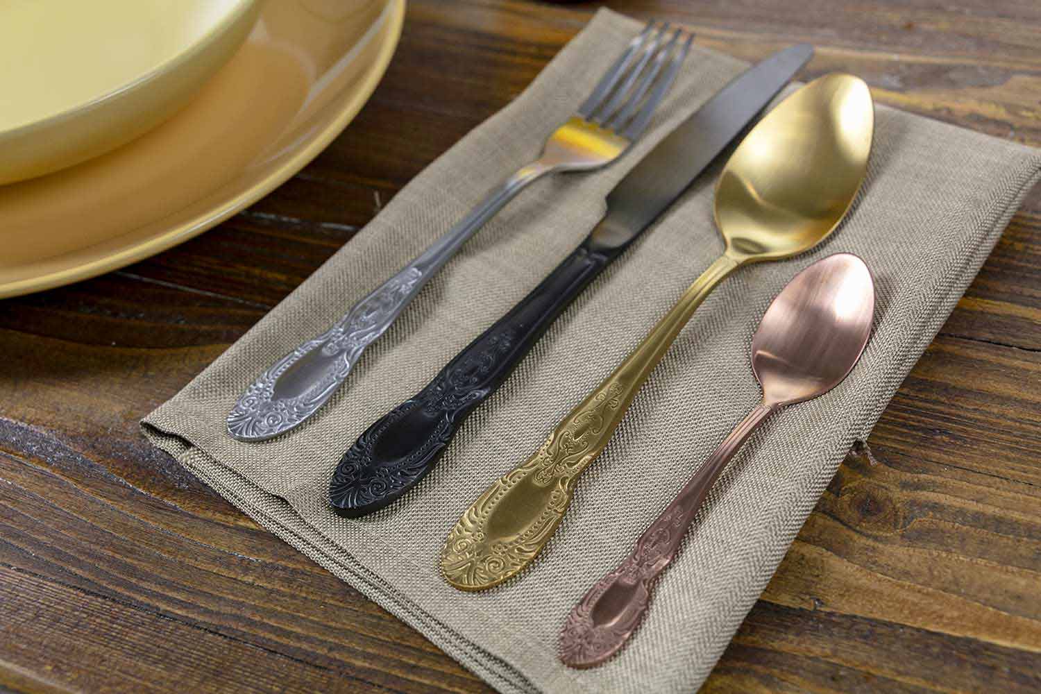 Conjunto de talheres de 24 peças em aço acetinado colorido, completo com design.