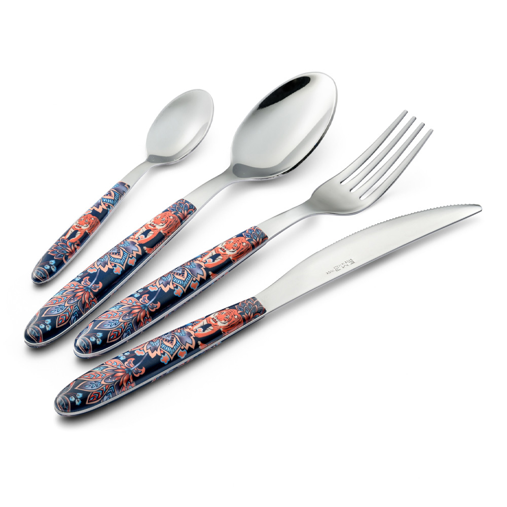 Talheres de aço inox e cabo de plástico colorido com tigre, 24 peças made in Italy.