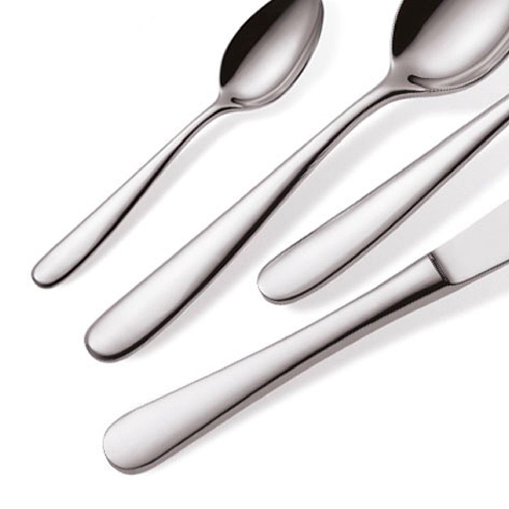 Conjunto completo de talheres em aço inoxidável polido, design minimalista moderno, 24 peças made in Italy.