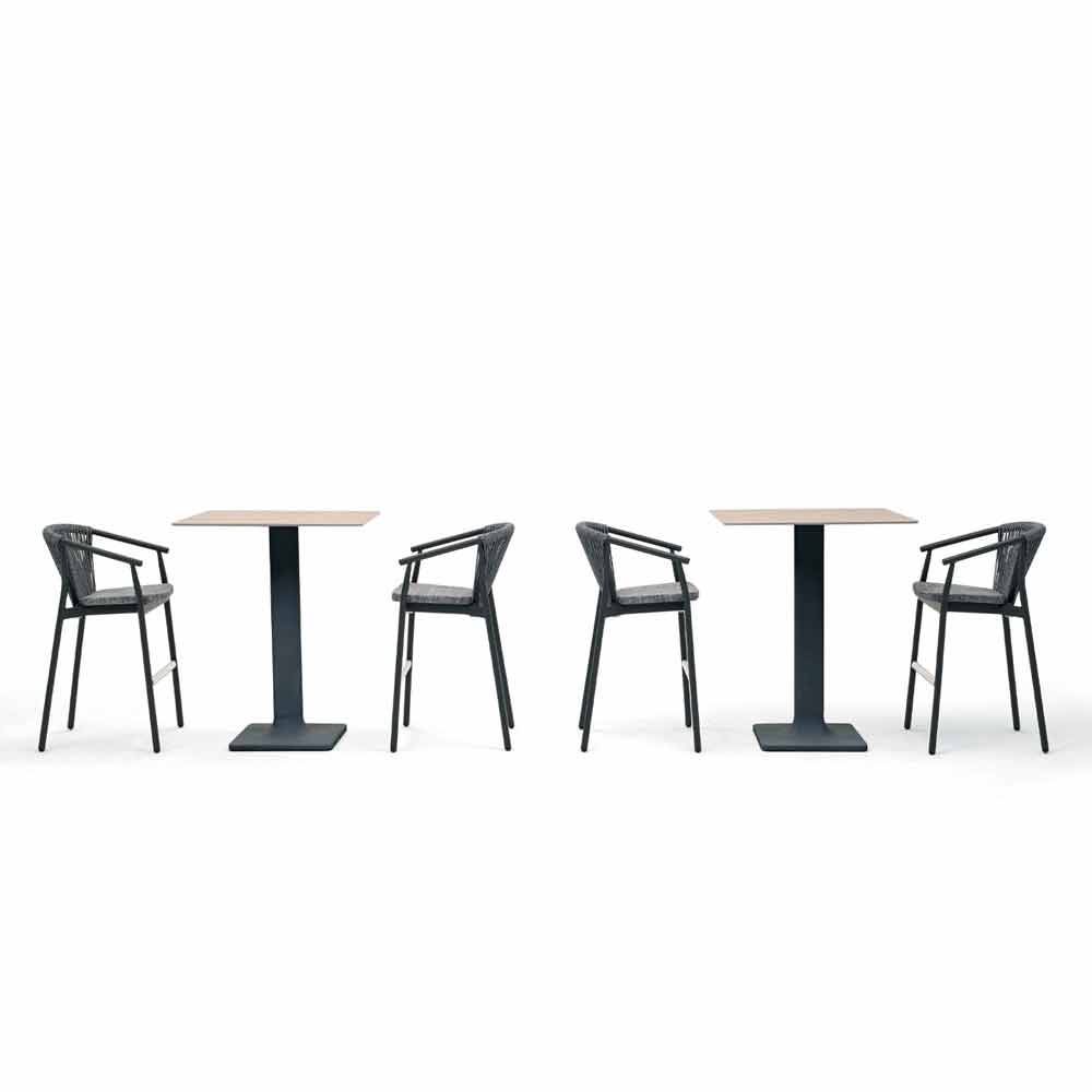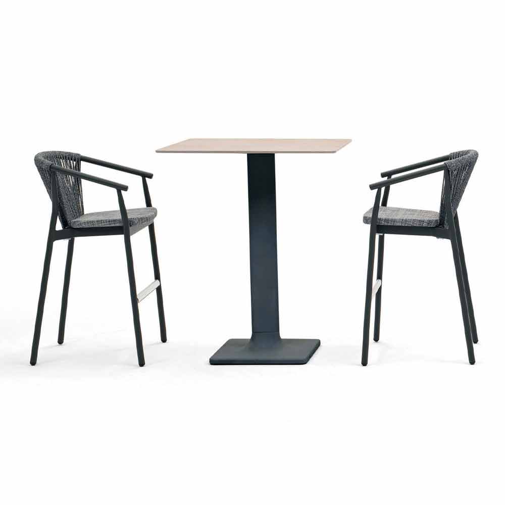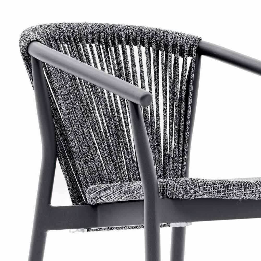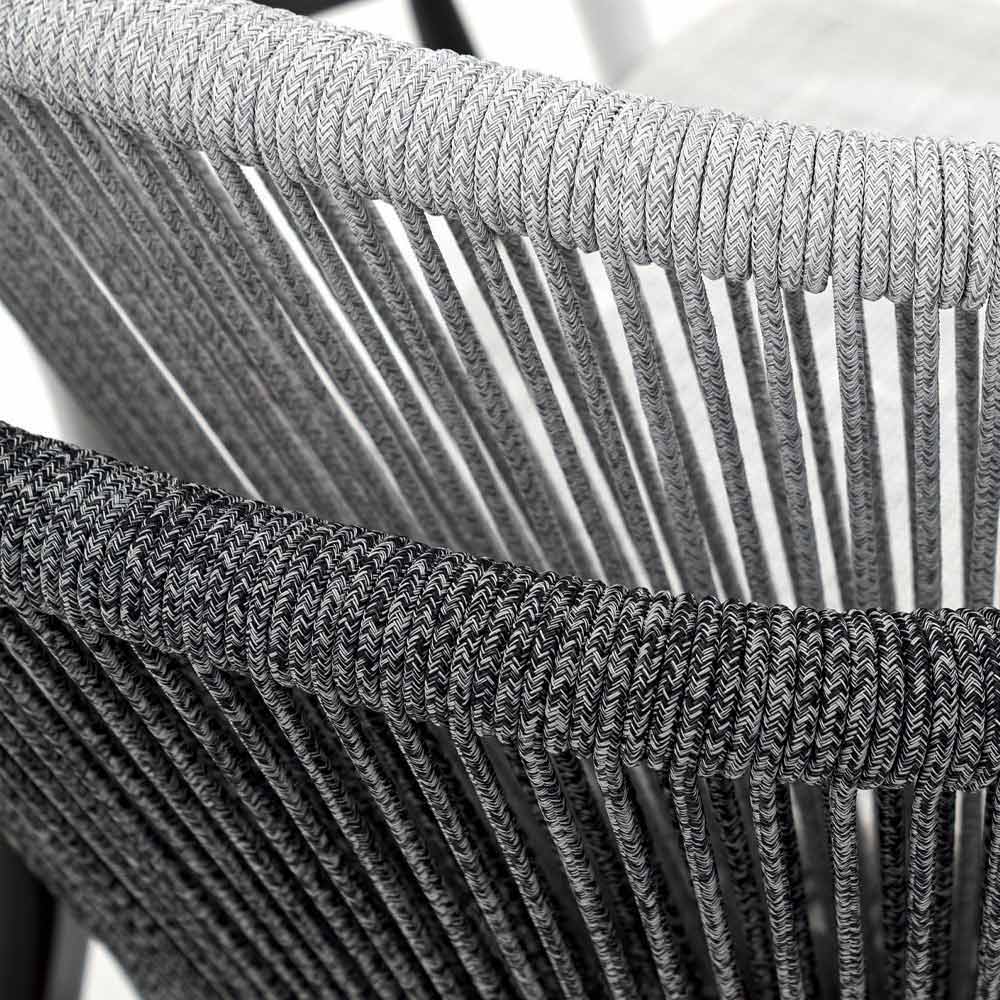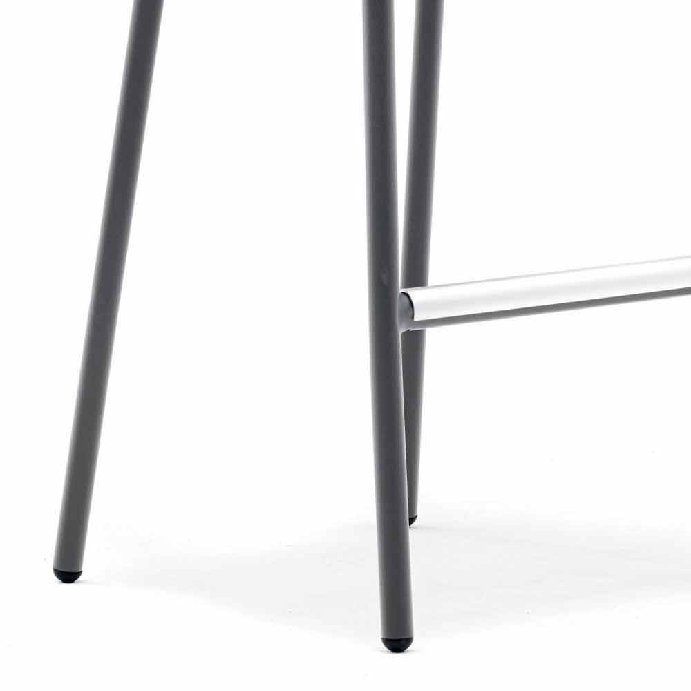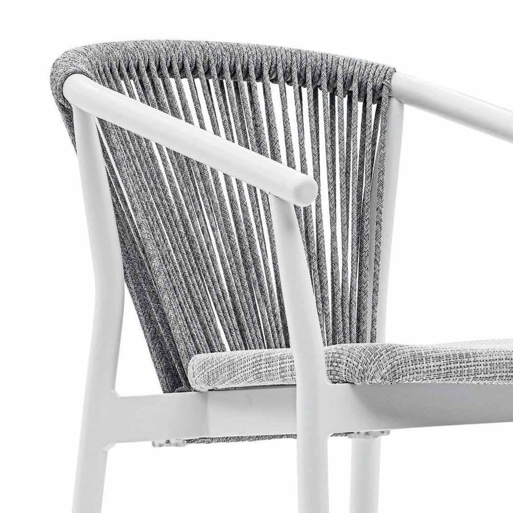 Banqueta exterior empilhável de design moderno com base em alumínio e assento em tecido técnico colorido branco ou cinza.
