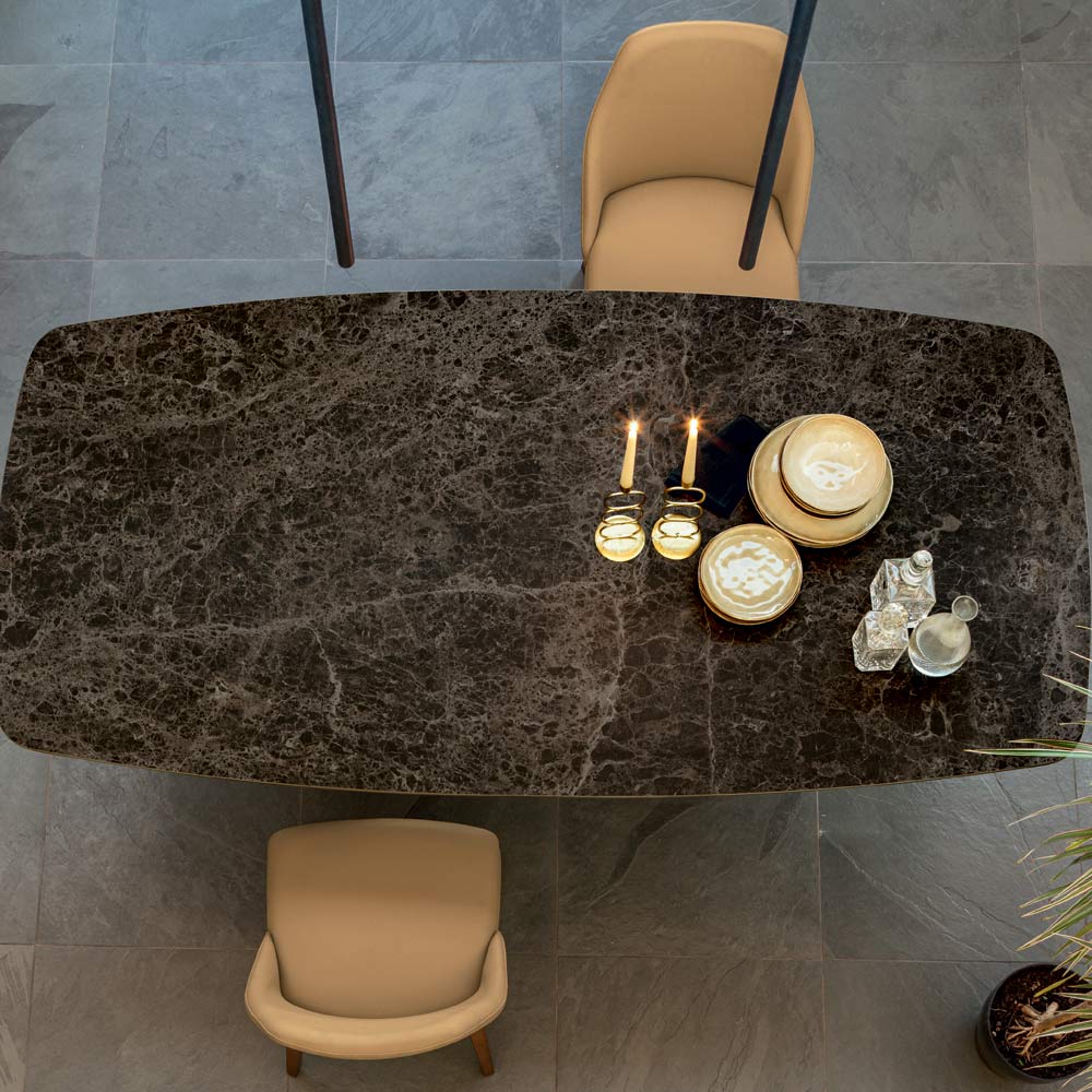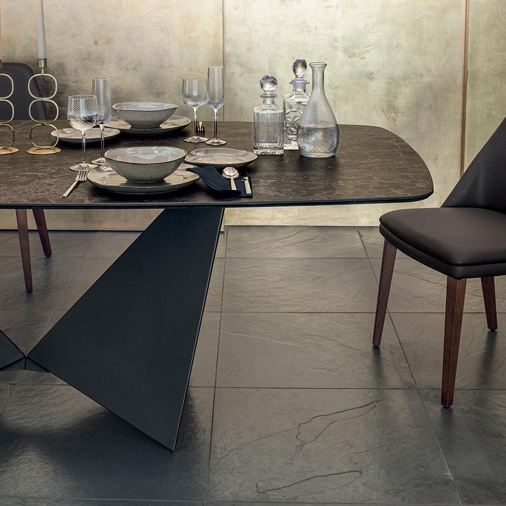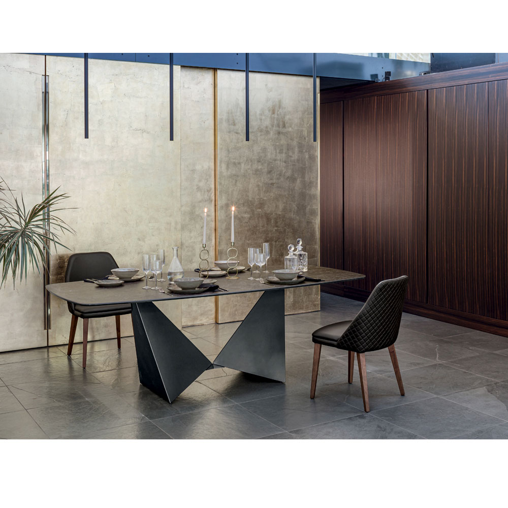 Mesa de jantar com base metálica e tampo em cerâmica mate com vários acabamentos made in Italy.