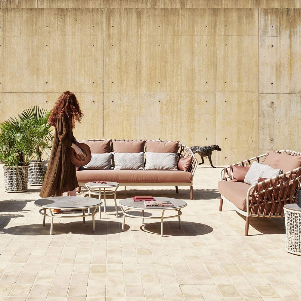 Mesa de jardim redonda com estrutura de alumínio e tecelagem de corda Made in Italy.
