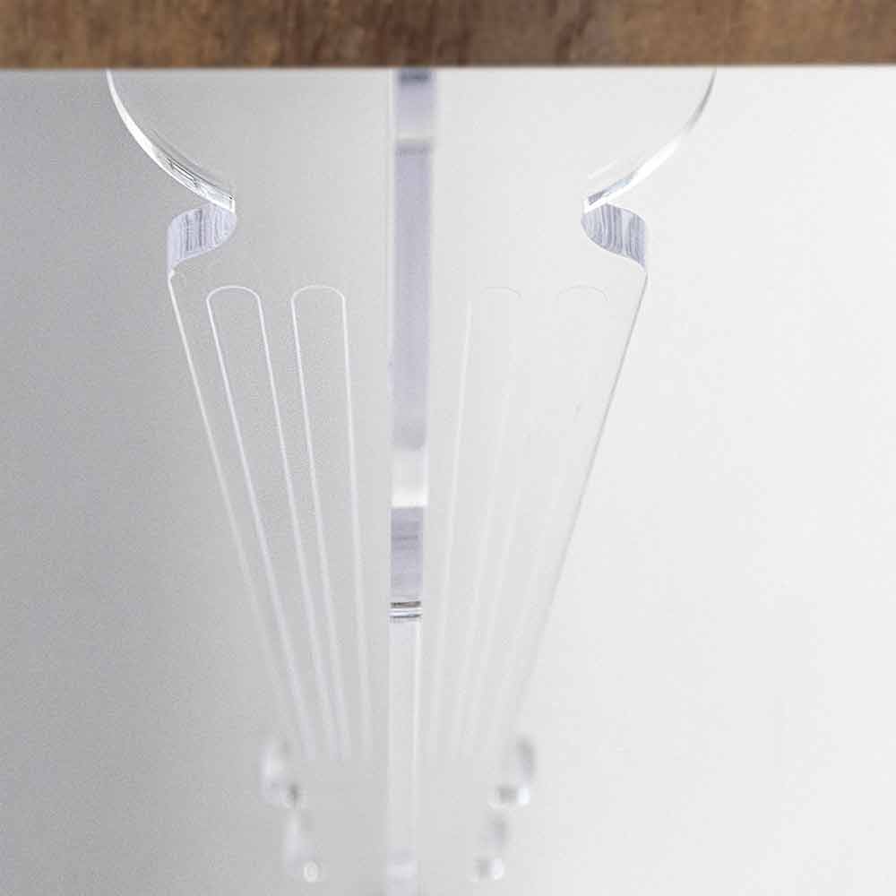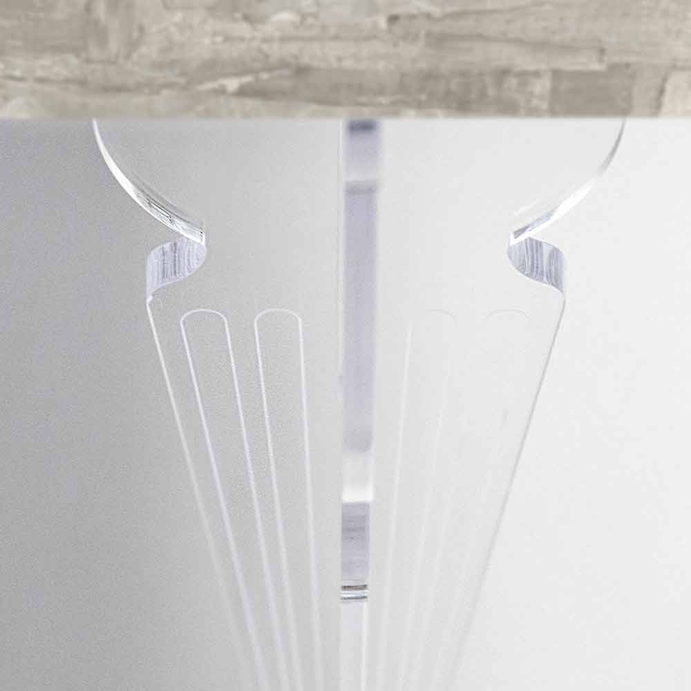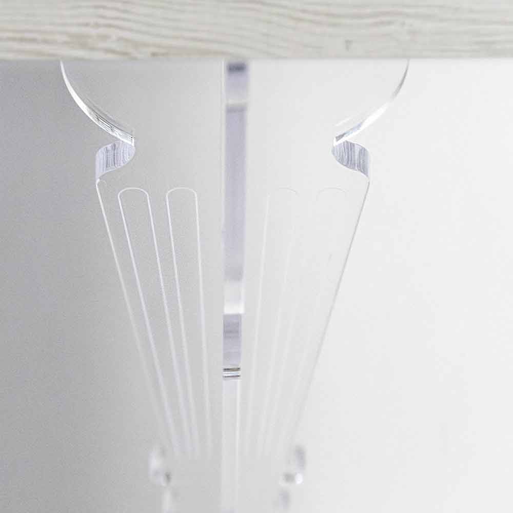 pernas torneadas em puro PMMA plexiglass de polímero acrílico virgem aliadas ao tampo em essência de madeira melamínica, com acabamento escovado fosco natural, criam um efeito de