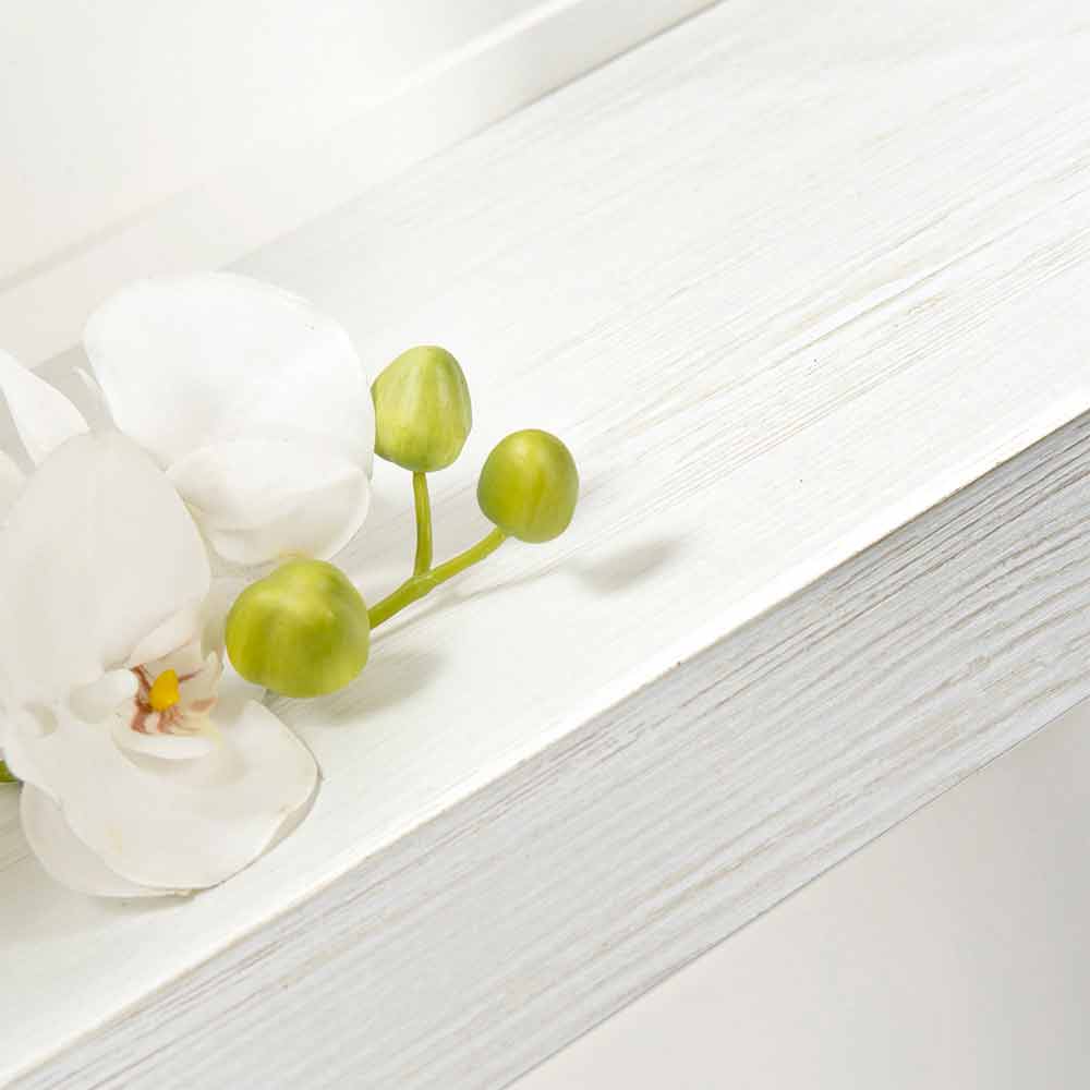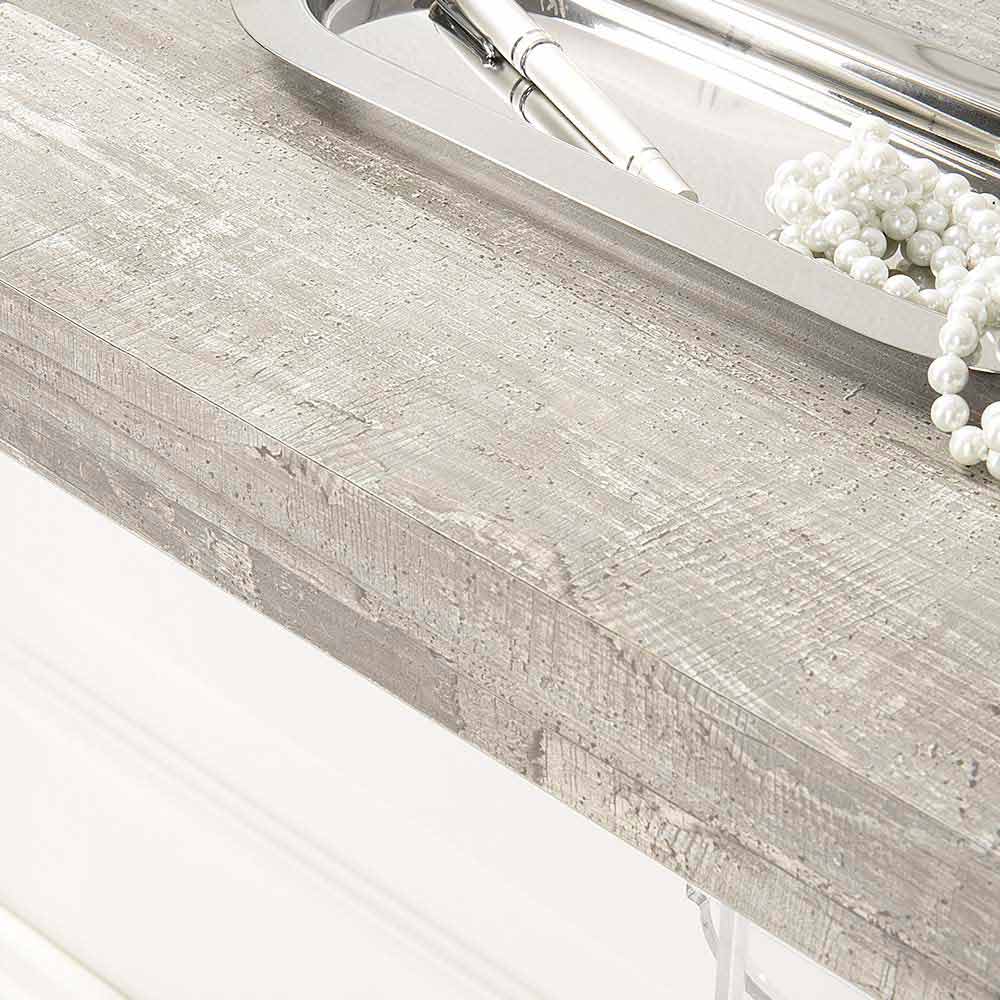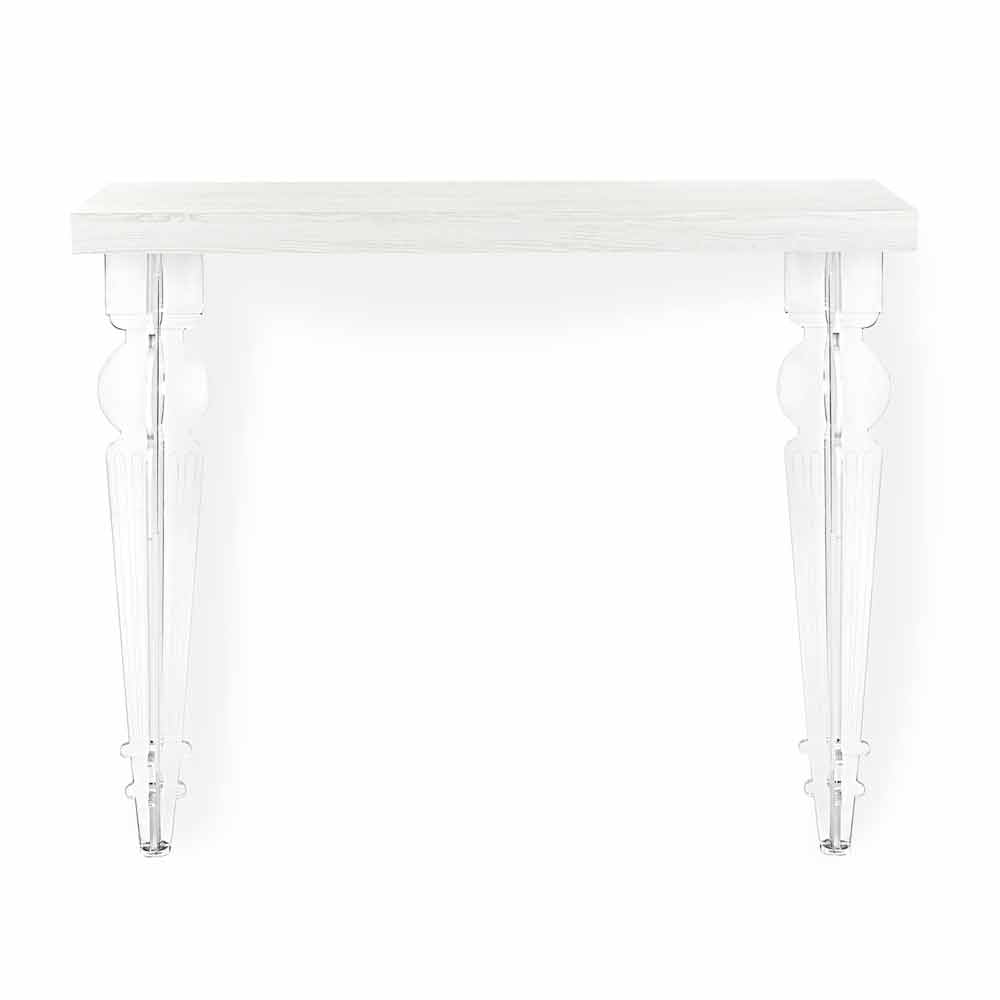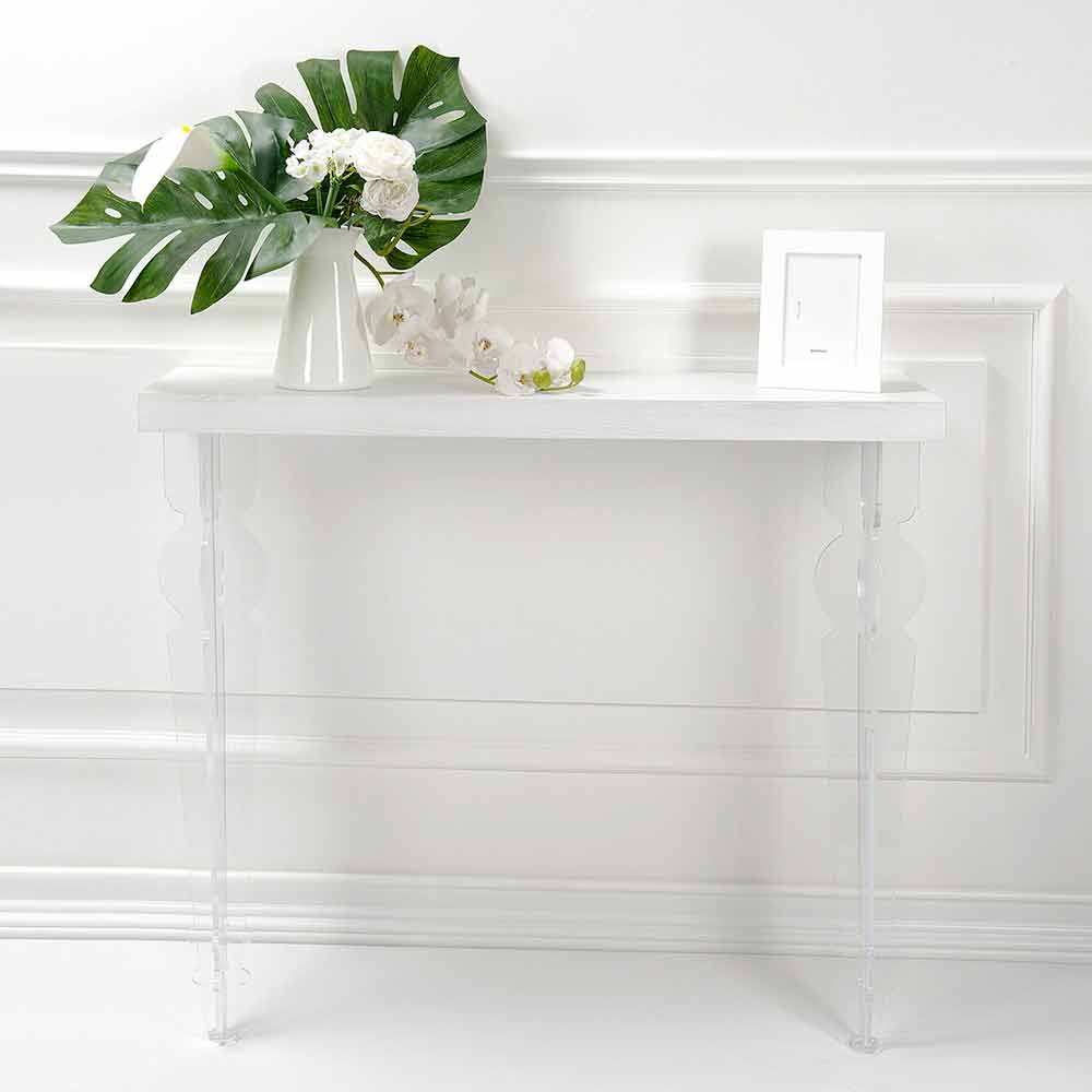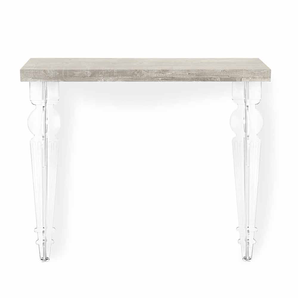 Mesa consola mural em madeira branca, cinza ou corten com pés torneados em plexiglass, design made in Italy.