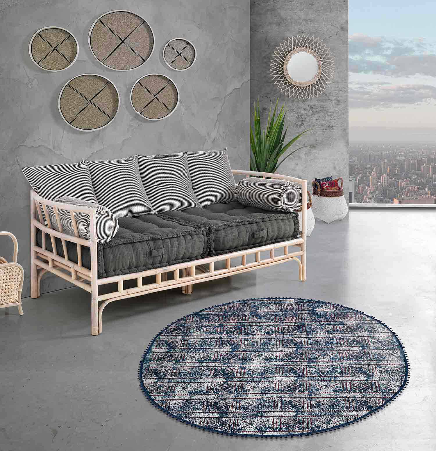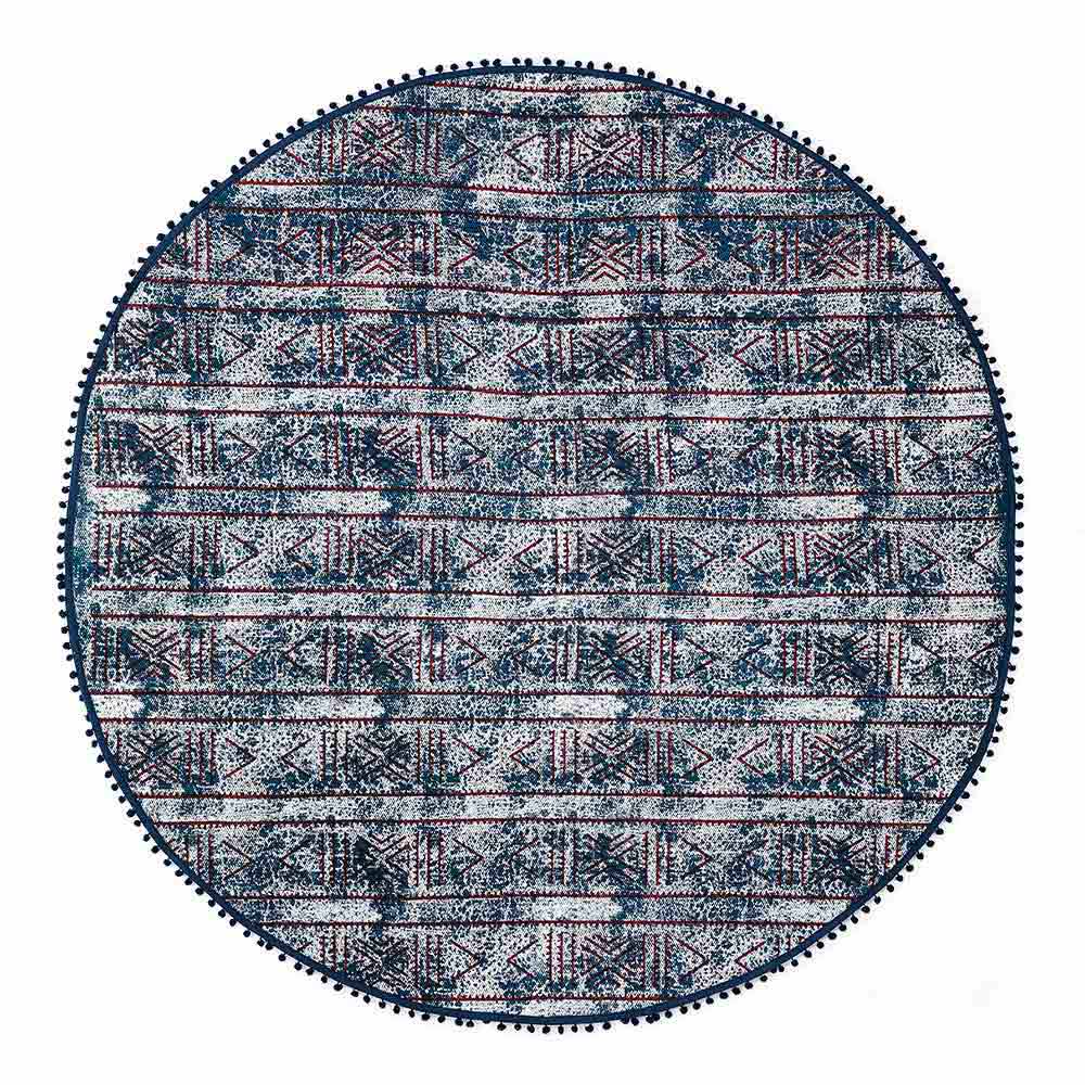 Tapete redondo de design étnico em tecido de algodão kilim.