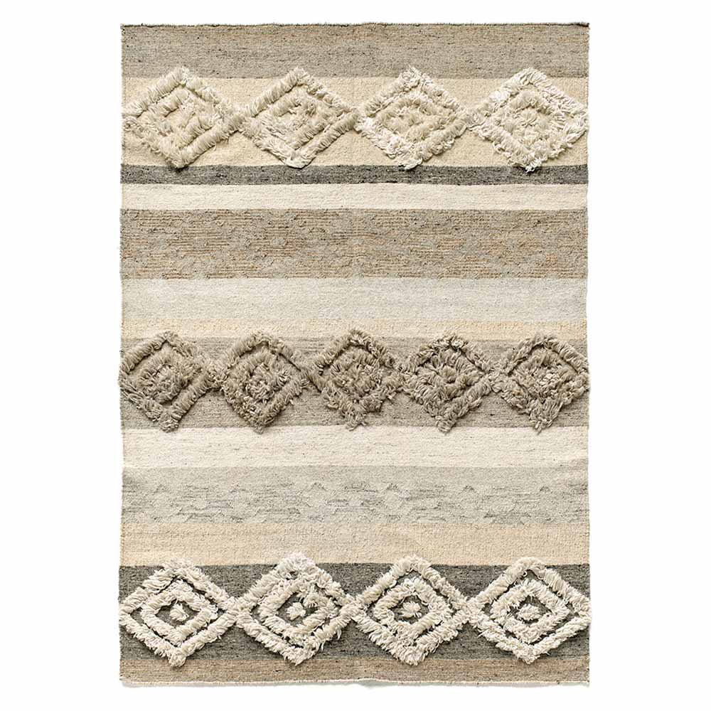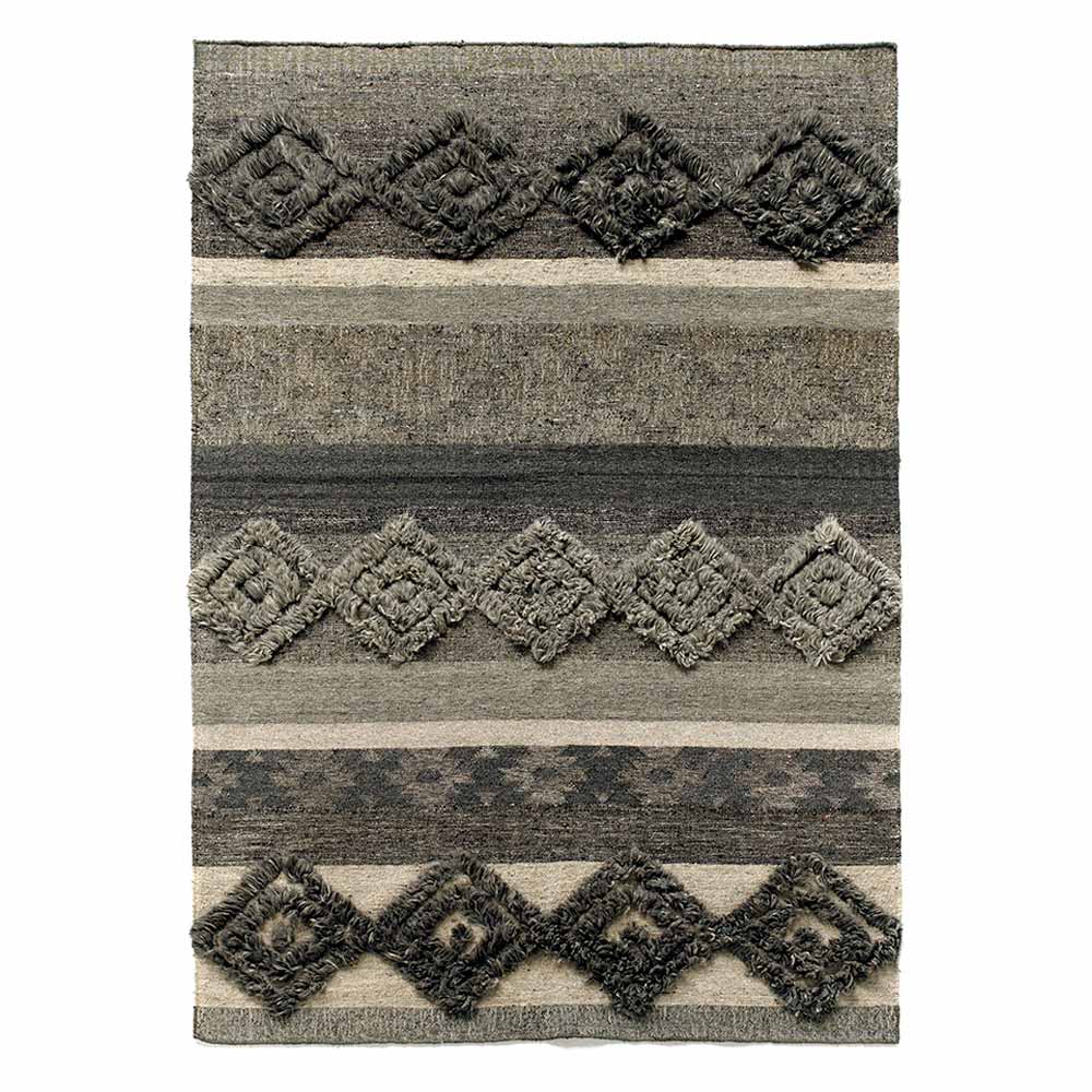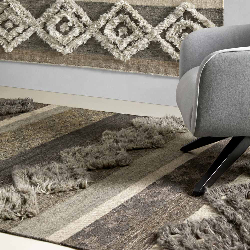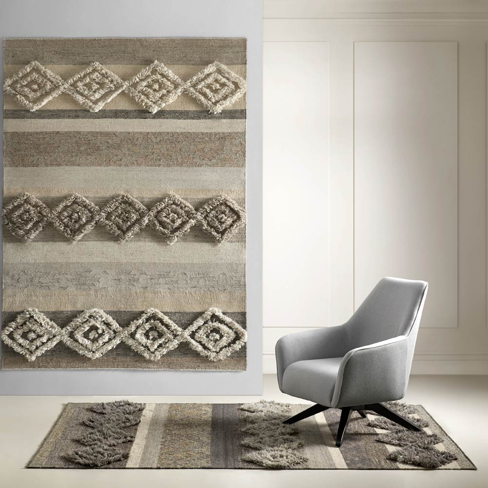 viscose e é chamado de "kilim" ou um tapete sem pêlo que não é trançado, mas sim tecido à mão por tecelões experientes. Comparado com um tapete clássico, é mais leve e menos encorpado e é perfeito como elemento decorativo para enriquecer a decoração de qualquer divisão graças à textura particular e aos padrões geométricos que o caracterizam. A combinação das cores disponíveis com os materiais e técnicas utilizadas permitem obter um produto final de