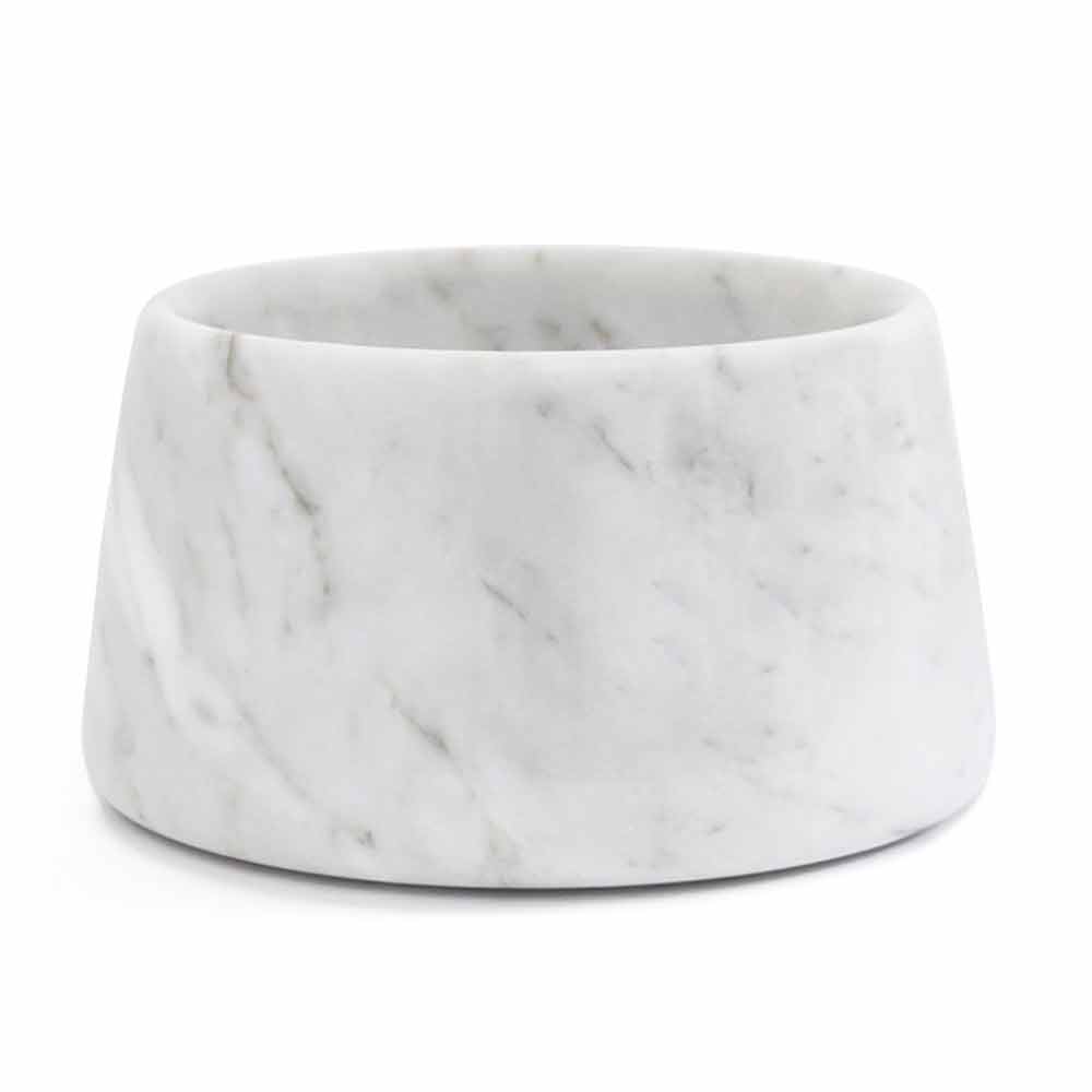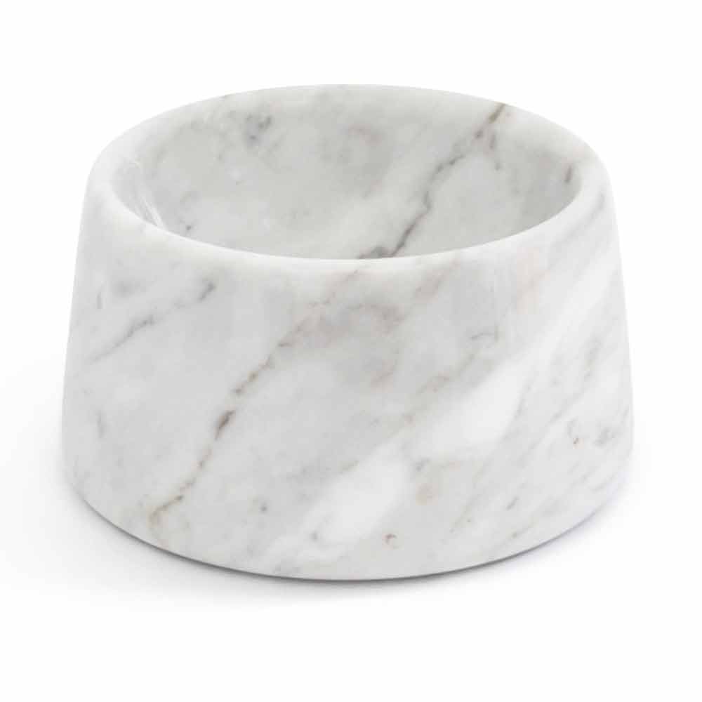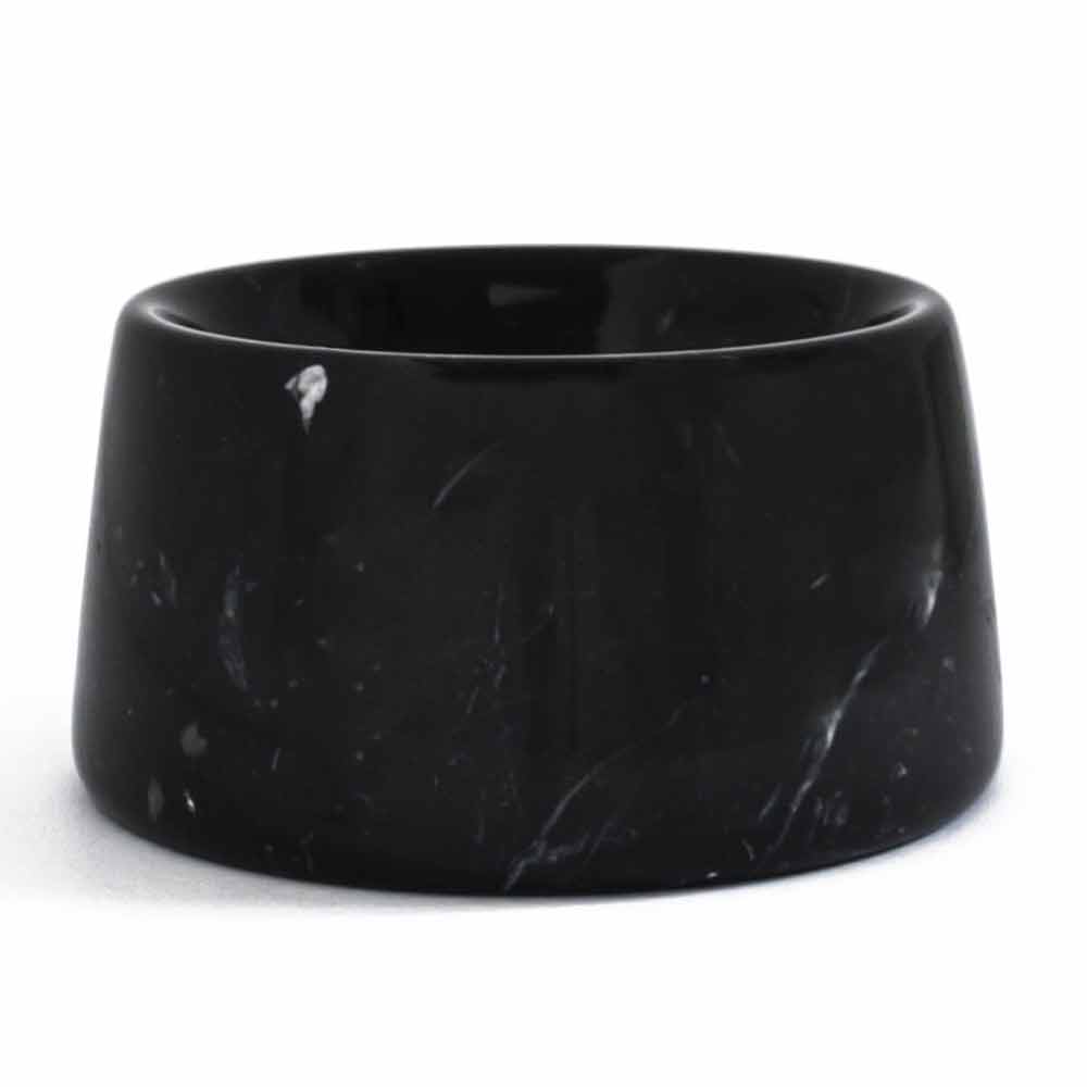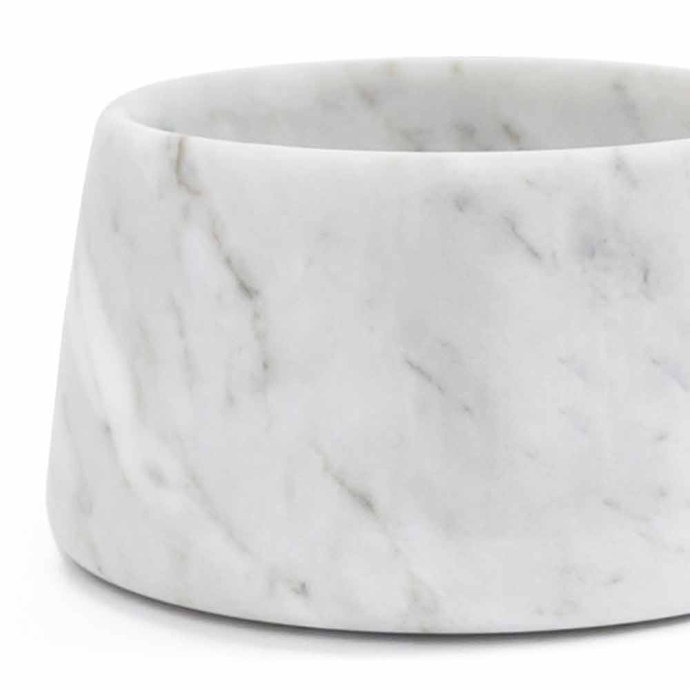 Maravilhosa tigela para cães e gatos caracterizada pelo mármore branco ou preto de que é composta. É uma peça única pois cada bloco de mármore utilizado difere dos demais pelos veios e tonalidades.