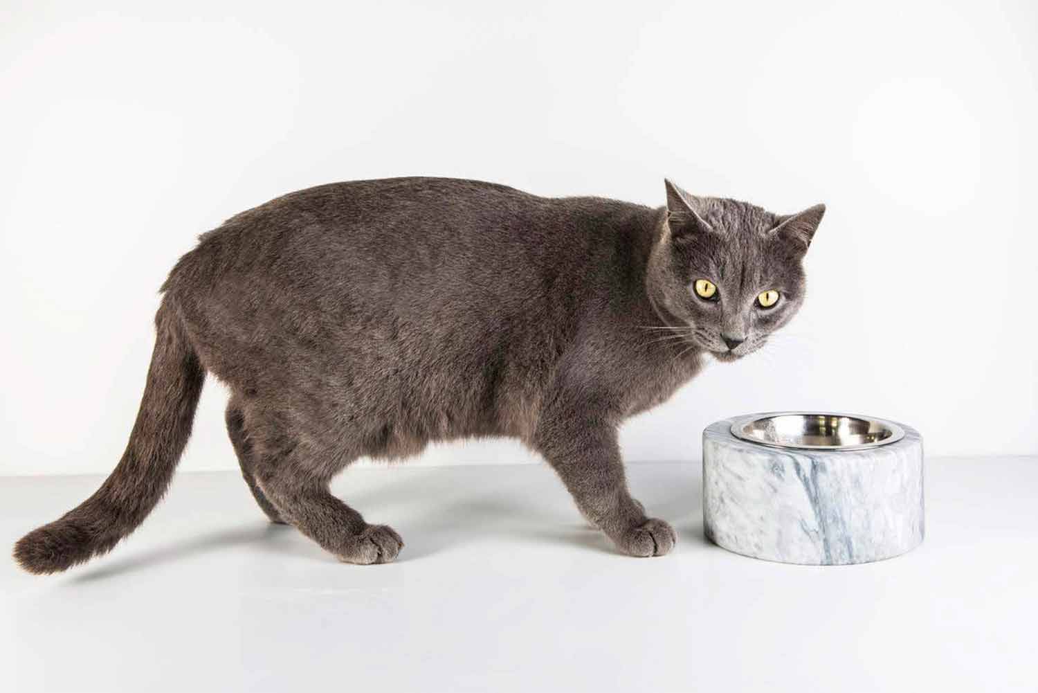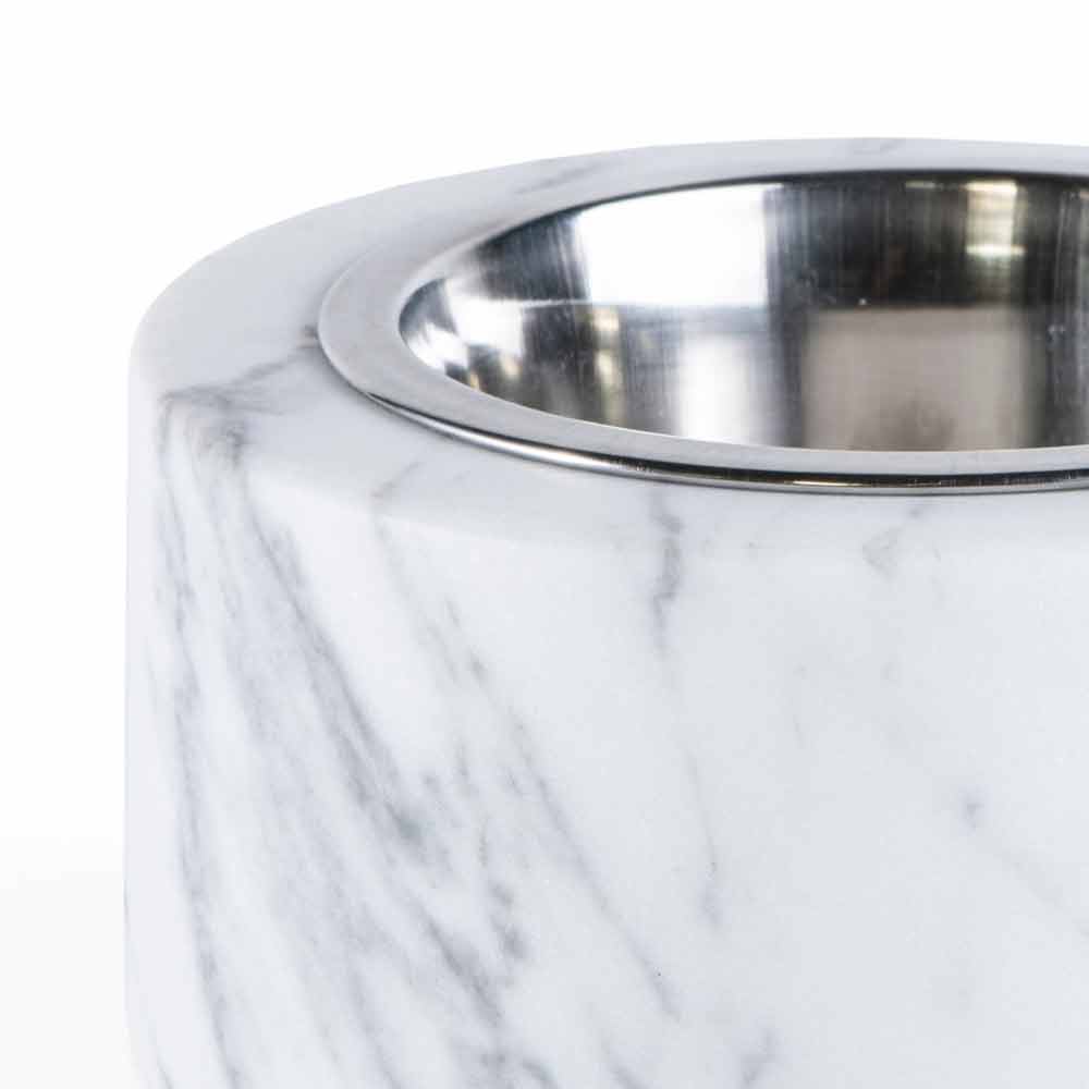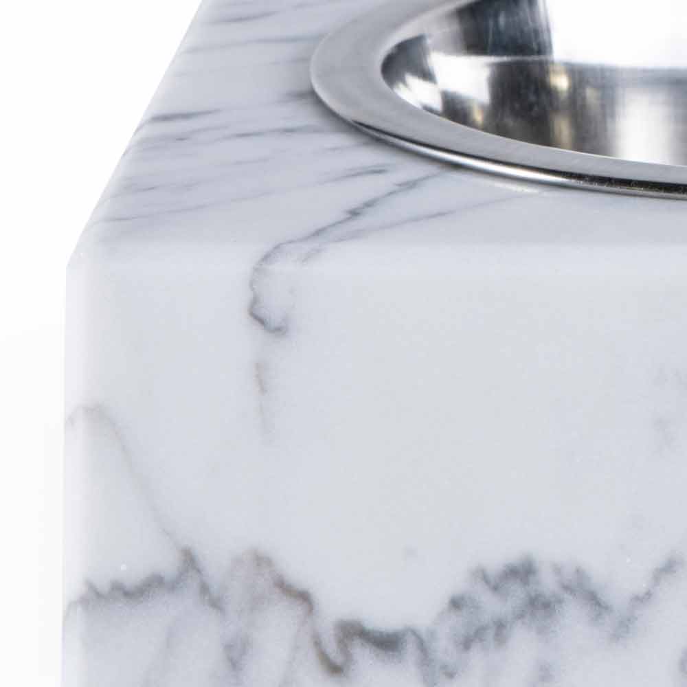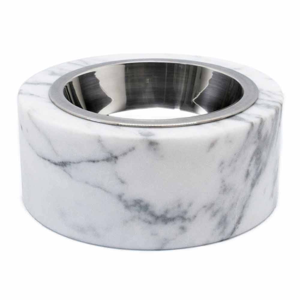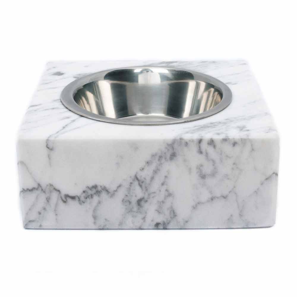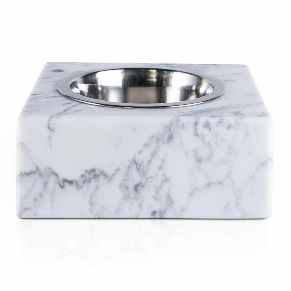 Tigela para cães e gatos caracterizada pelo mármore branco de Carrara de que é composta. É uma peça única pois cada bloco de mármore utilizado difere dos demais pelos veios e tonalidades.