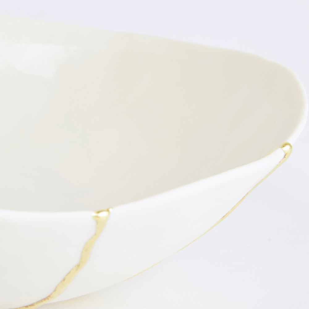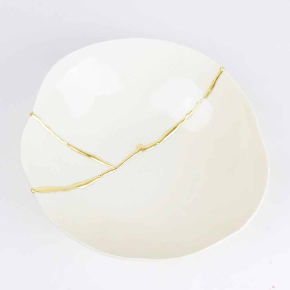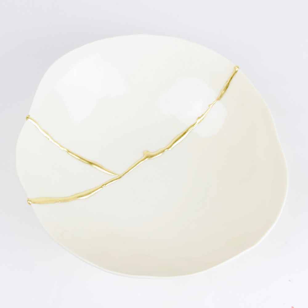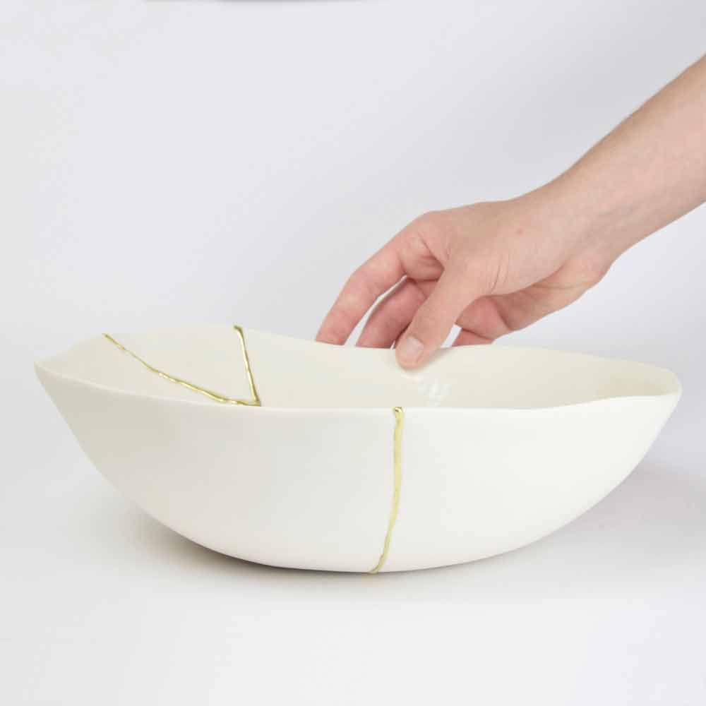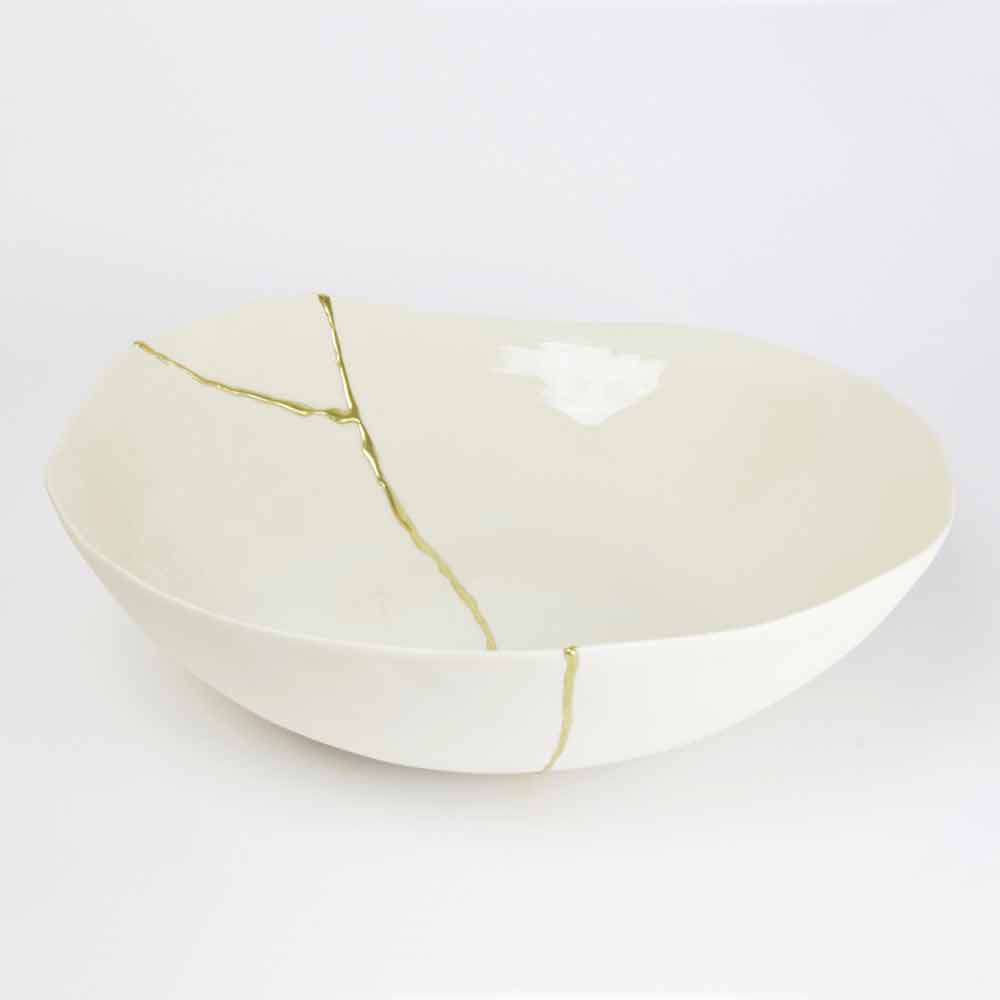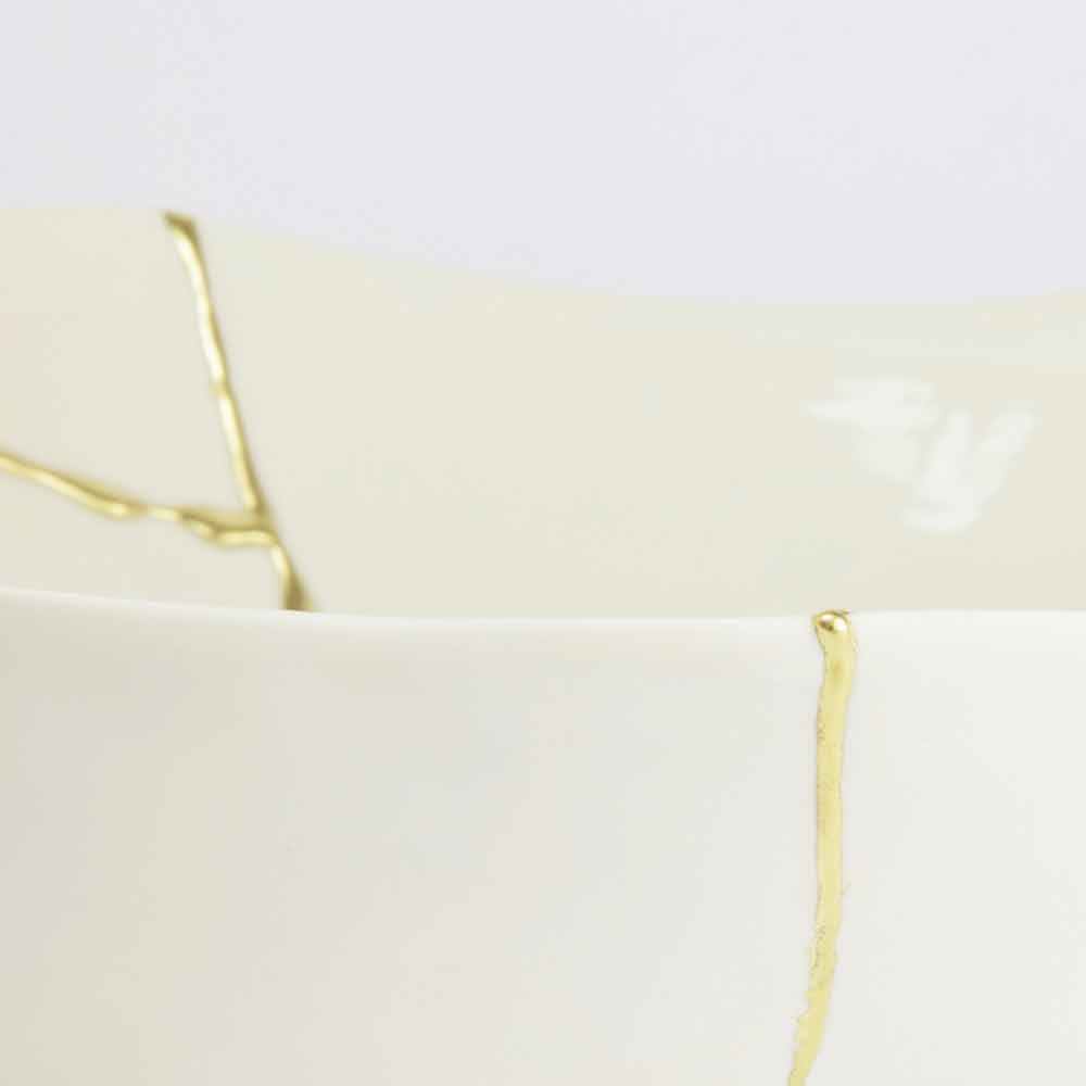 Feitas da mais fina porcelana branca , essas tigelas refletem a filosofia japonesa kintsugi que consiste em realçar, e não ocultar, as feridas da vida, pois fazem parte da nossa história e contribuem para nos tornar o povo que somos hoje. Assim, qualquer objeto que saia danificado pelo cozimento no forno é reparado usando folha de ouro 22 quilates como cola, o que cria uma cicatriz preciosa maravilhosa.