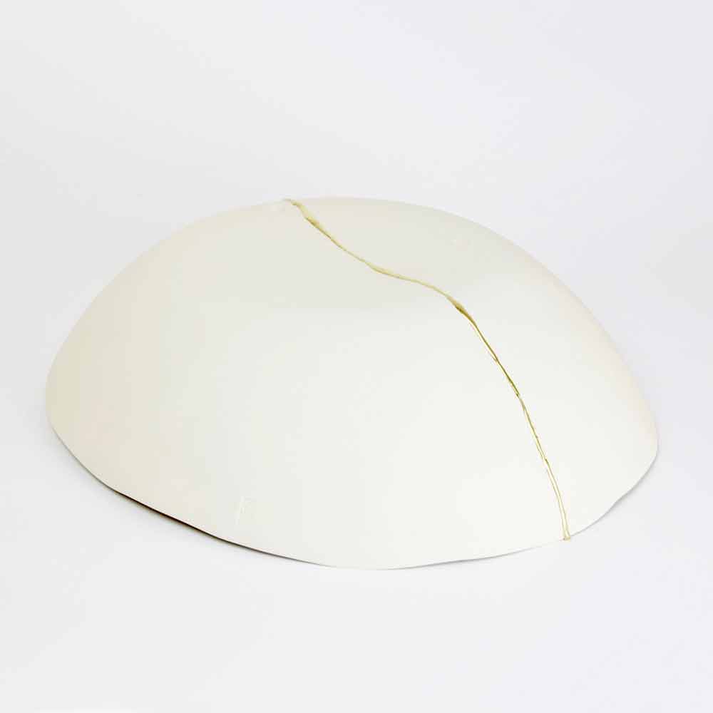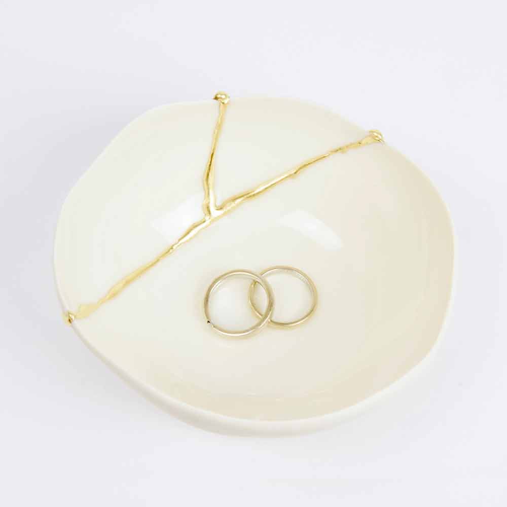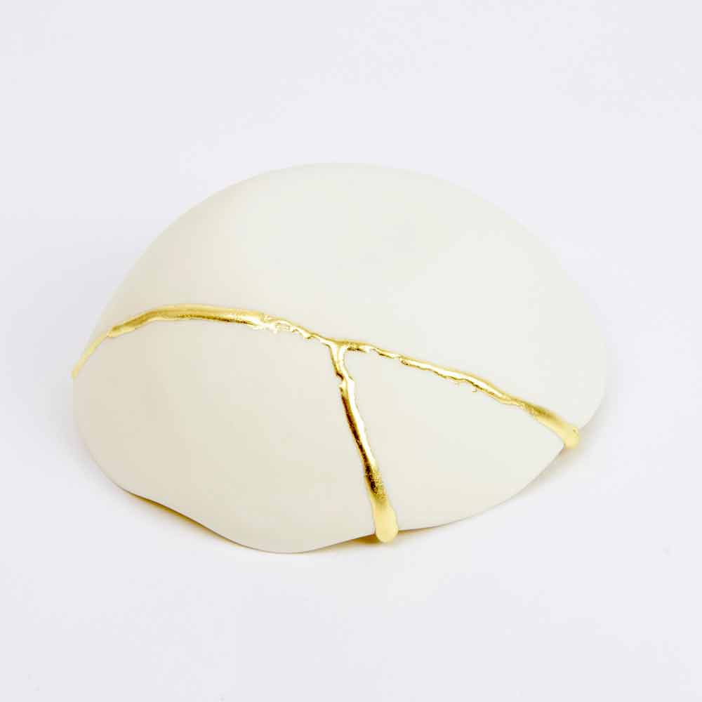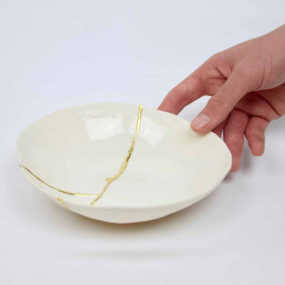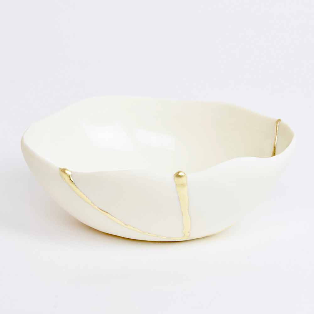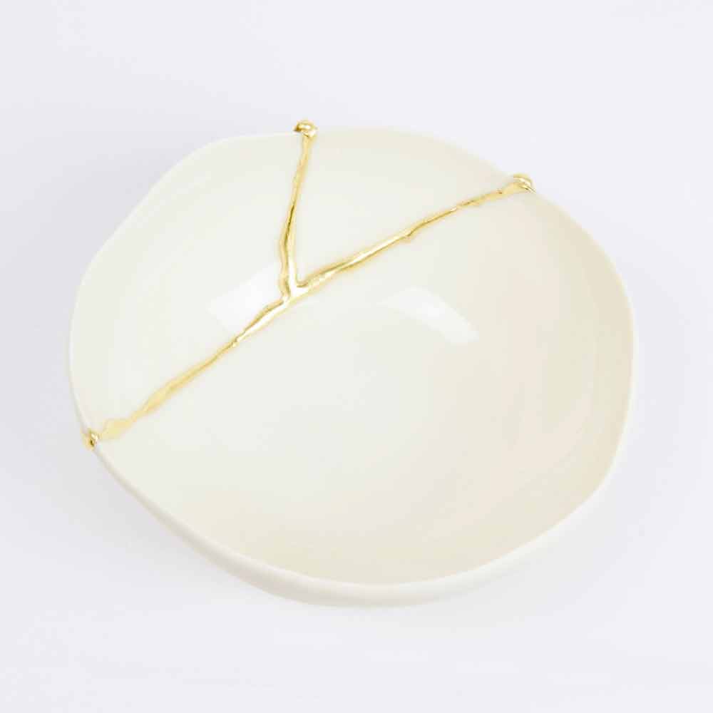 Feitas da mais fina porcelana branca , essas tigelas refletem a filosofia japonesa kintsugi que consiste em realçar, e não ocultar, as feridas da vida, pois fazem parte da nossa história e contribuem para nos tornar o povo que somos hoje. Assim, qualquer objeto que saia danificado pelo cozimento no forno é reparado usando folha de ouro 22 quilates como cola, o que cria uma cicatriz preciosa maravilhosa.