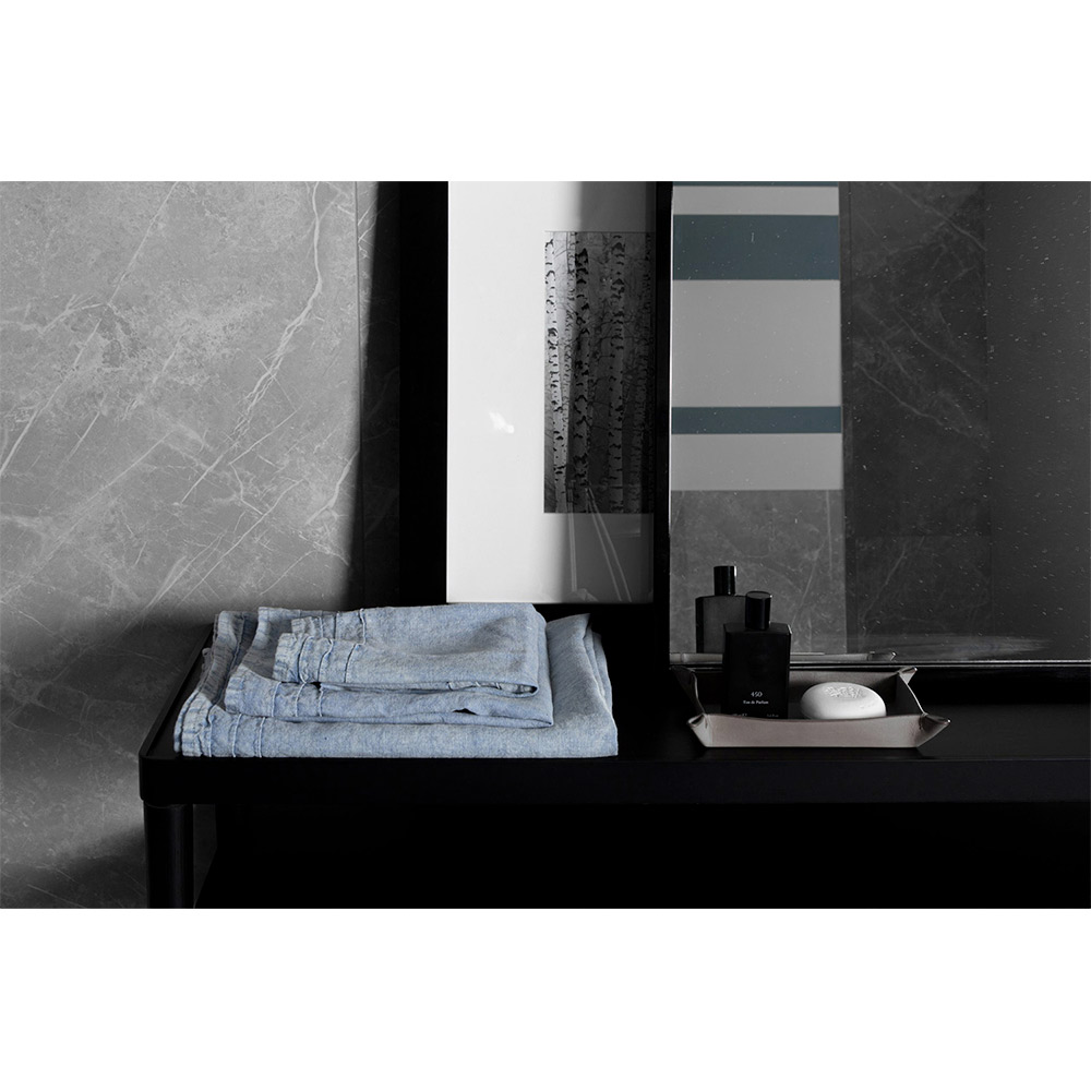 Toalha de banho leve, azul, pesada, de linho, com rebordo decorado, luxo e design made in Italy.