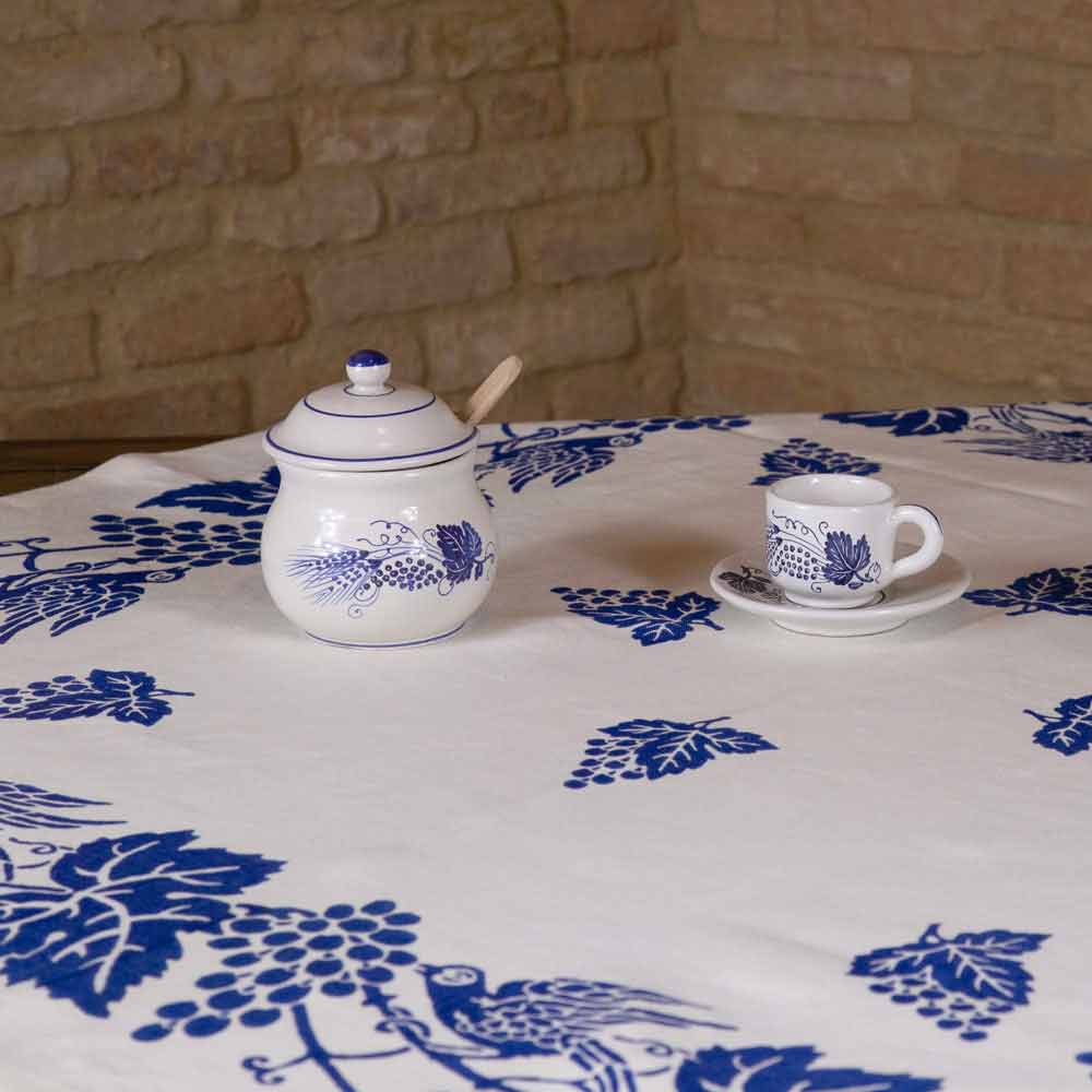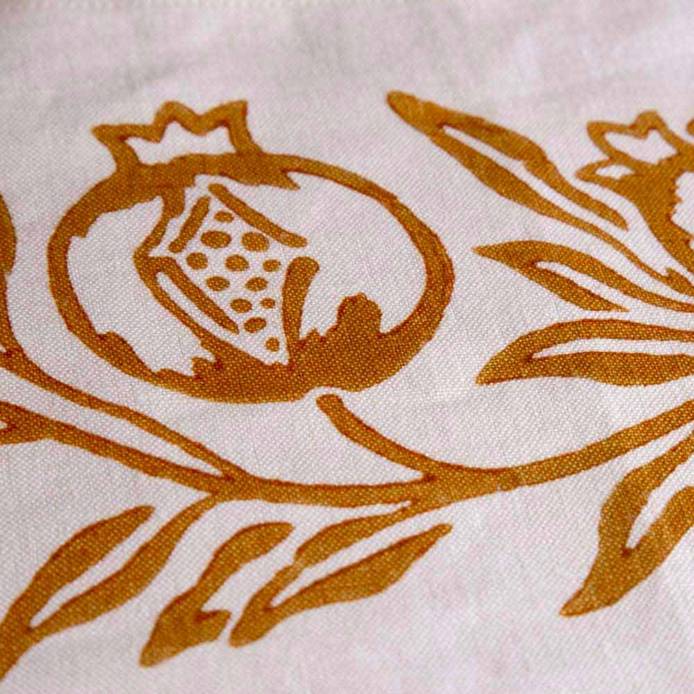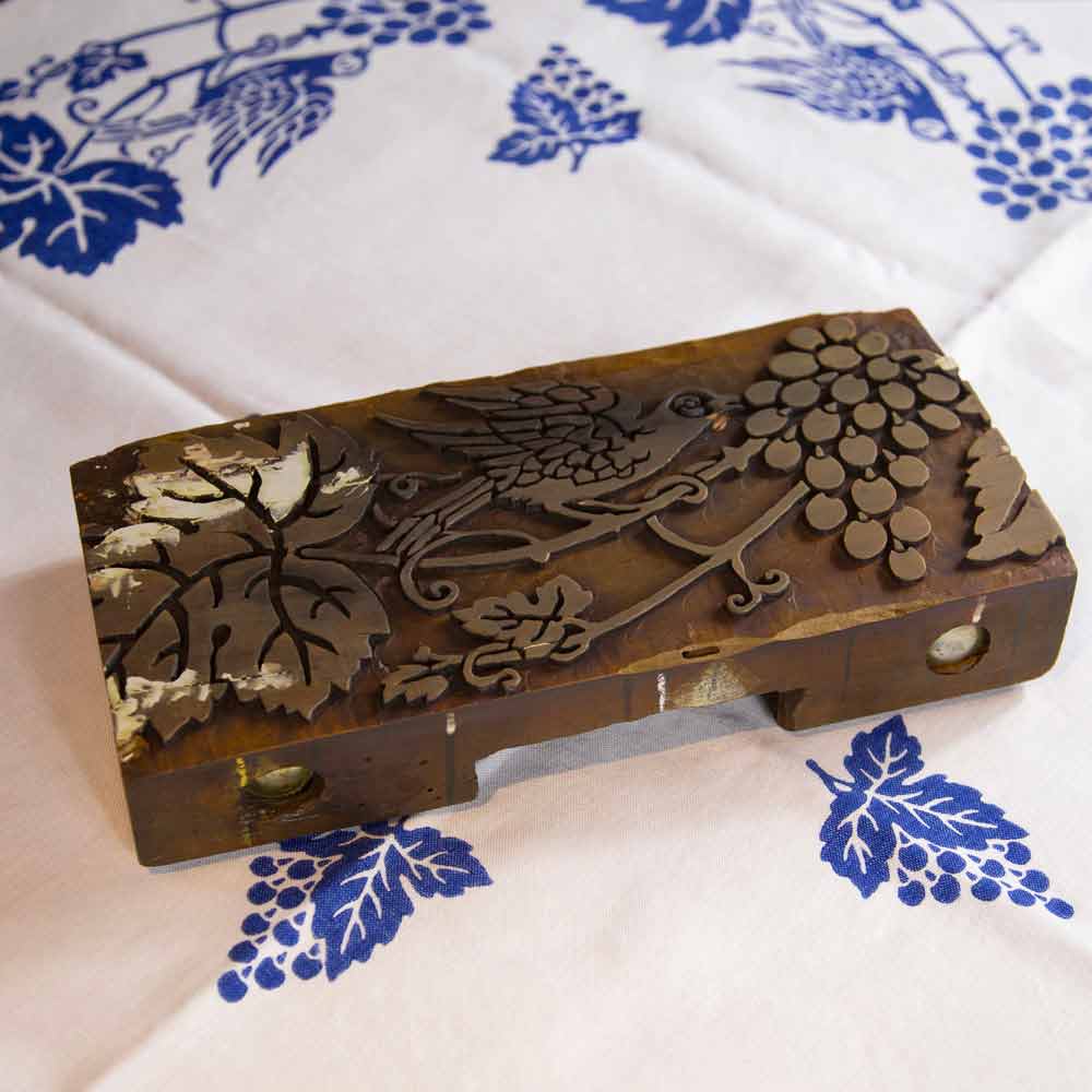 - 2 impressões possíveis disponíveis: Ferrugem, com design antigo de romã , um símbolo de abundância e prosperidade; Azul, com um desenho tradicional antigo de Bird que bica as uvas.