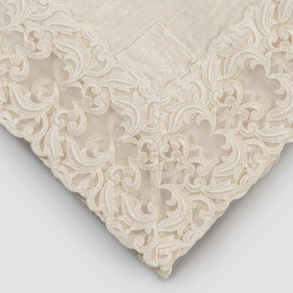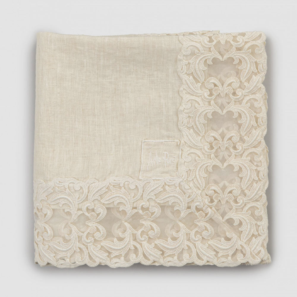 Toalha de mesa quadrada de linho com renda Farnese, refinada peça made in Italy.