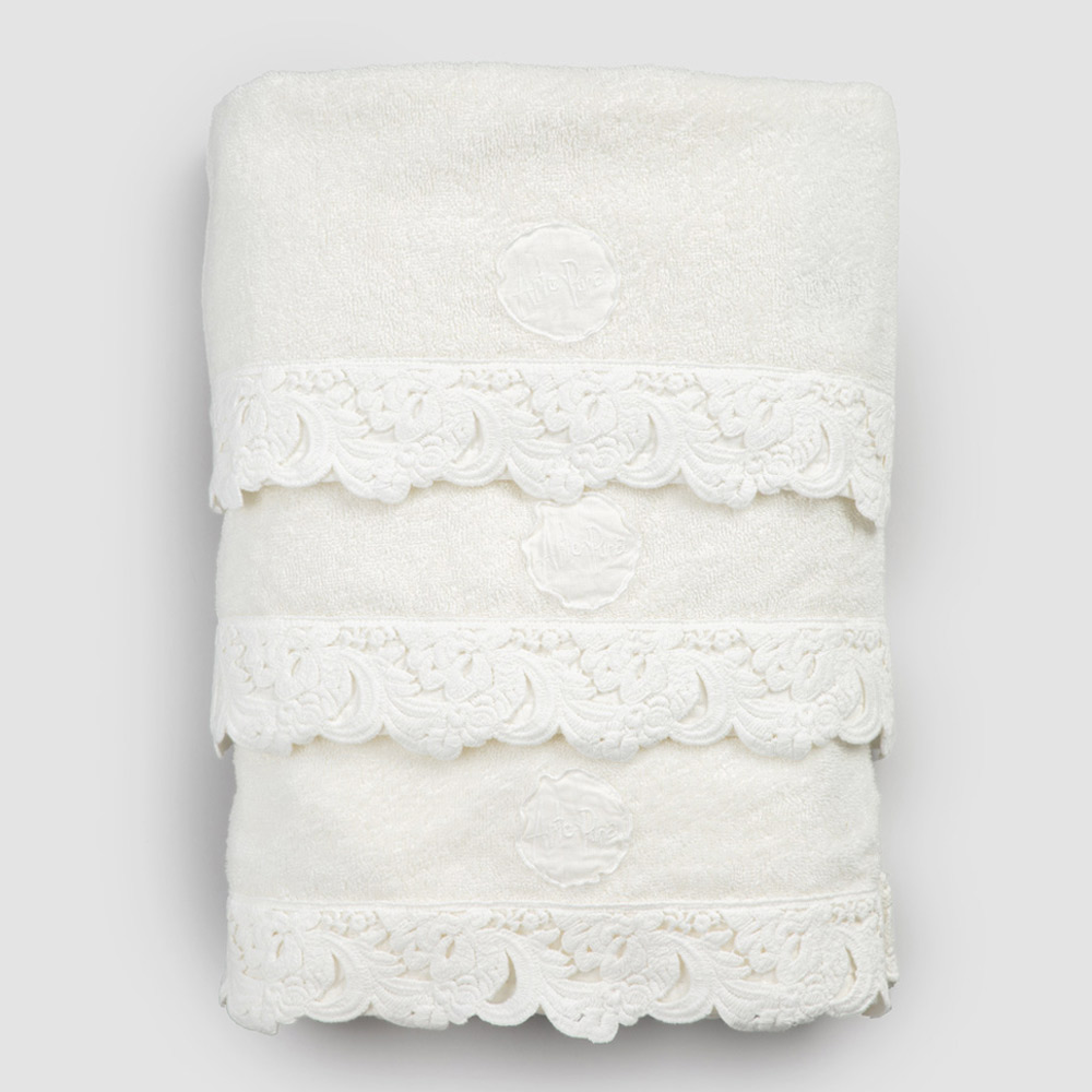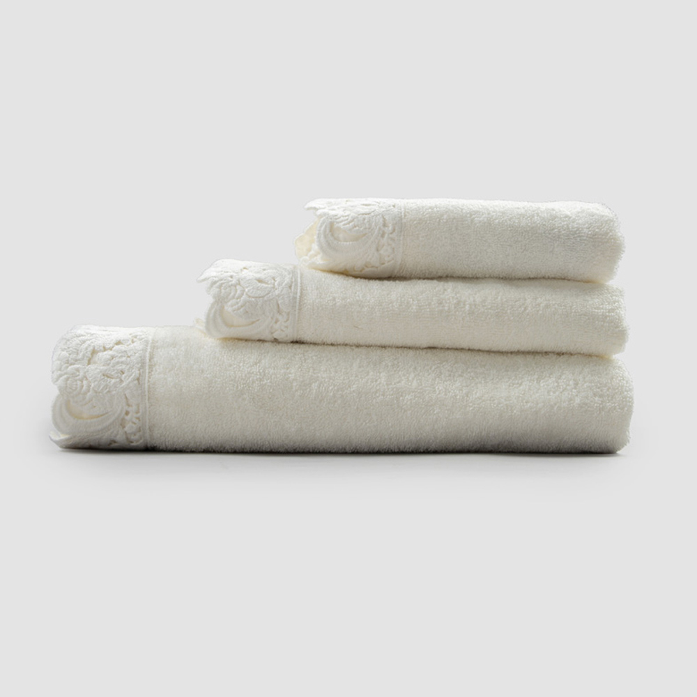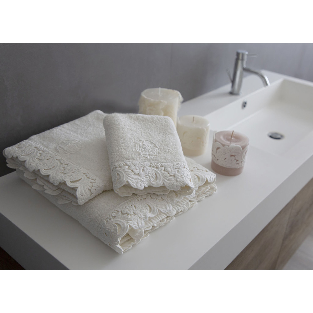 Serviço de toalhas de rosto e convidados e toalha de banho esponja com renda, luxo artesanal made in Italy.