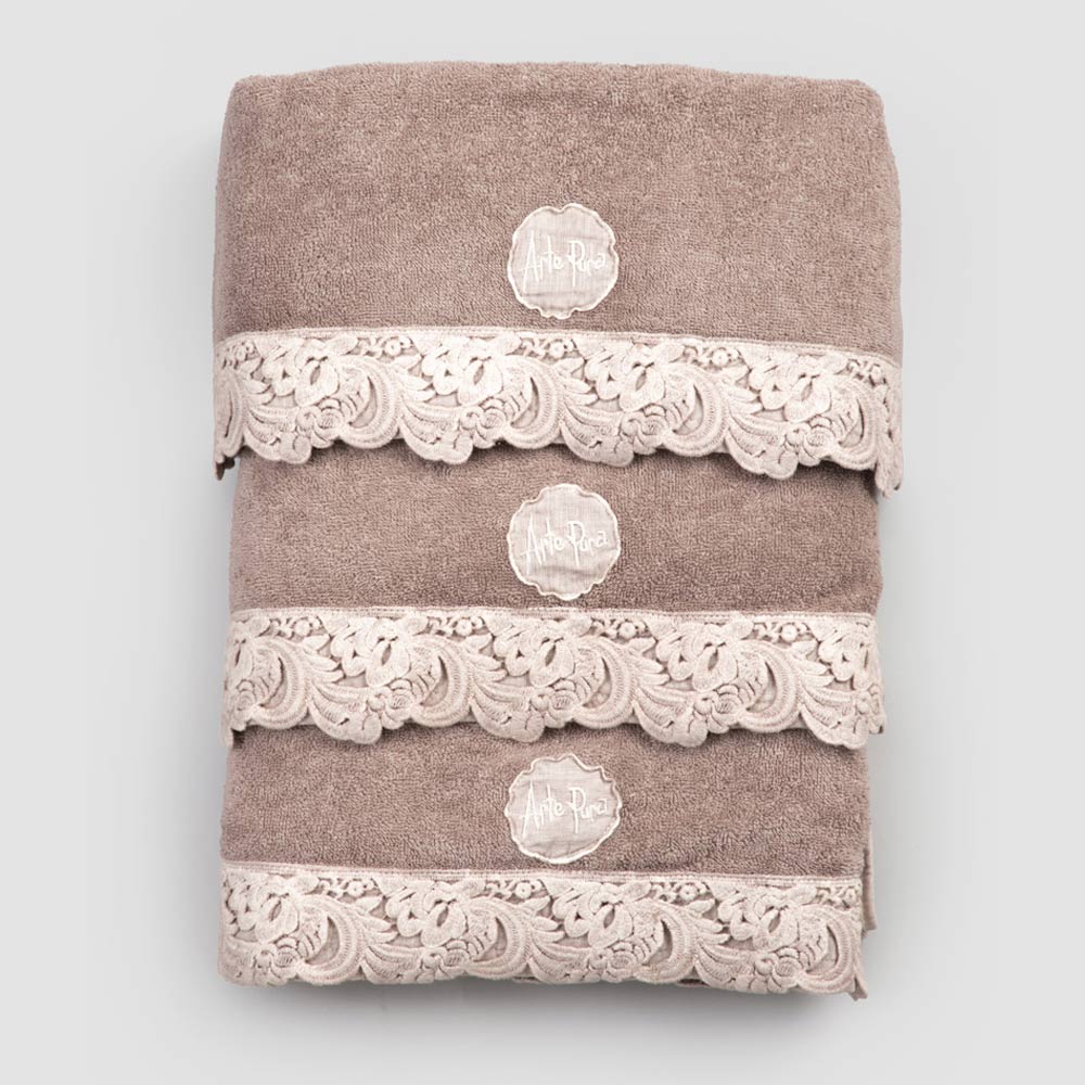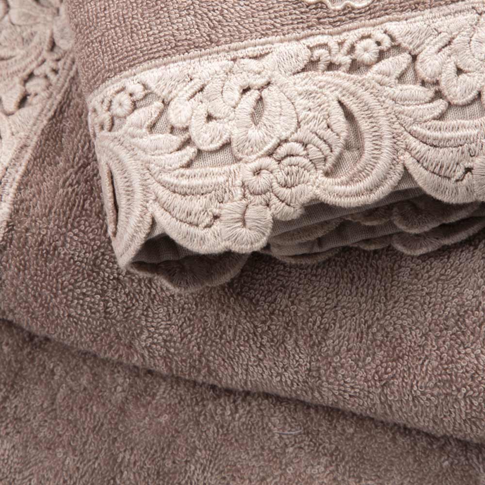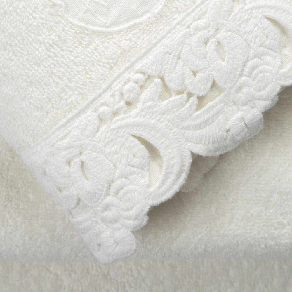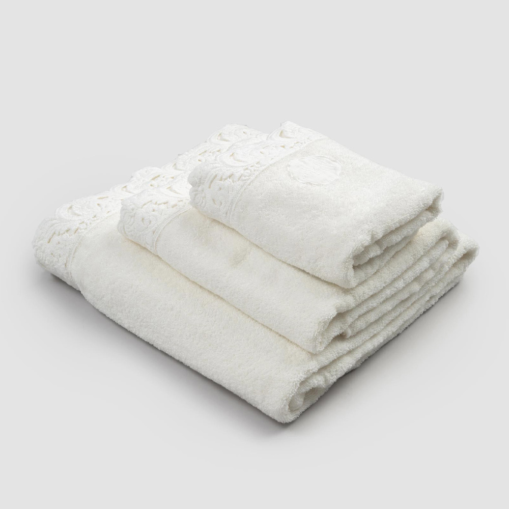 Serviço de toalhas de rosto e convidados e toalha de banho esponja com renda, luxo artesanal made in Italy.