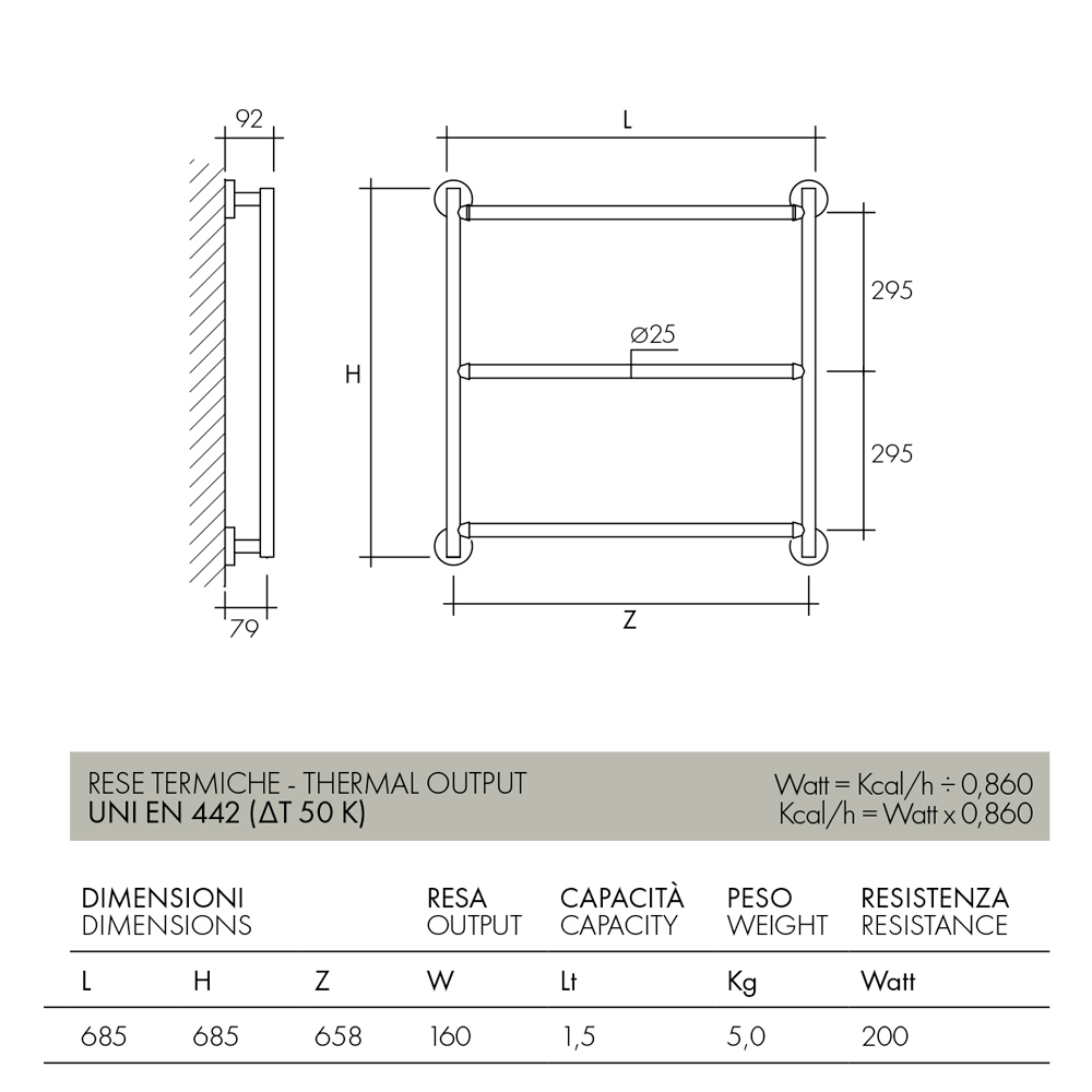 L. 685 mm, H. 685 mm, distância entre eixos 658 mm; Aquecedor elétrico 200 Watt; Capacidade 1,5 Lt; Peso 5,0 Kg