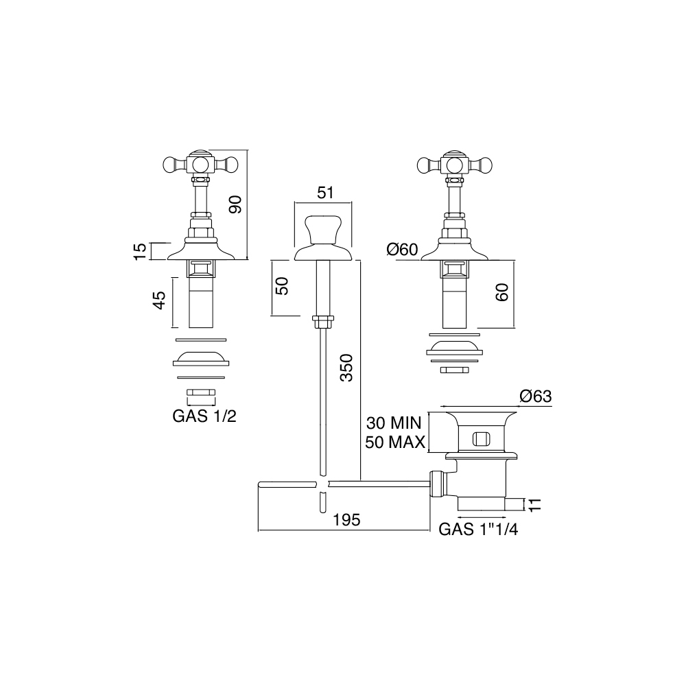 batorneira de bidé de 3 furos com descarga e bica interna, feita de latão.