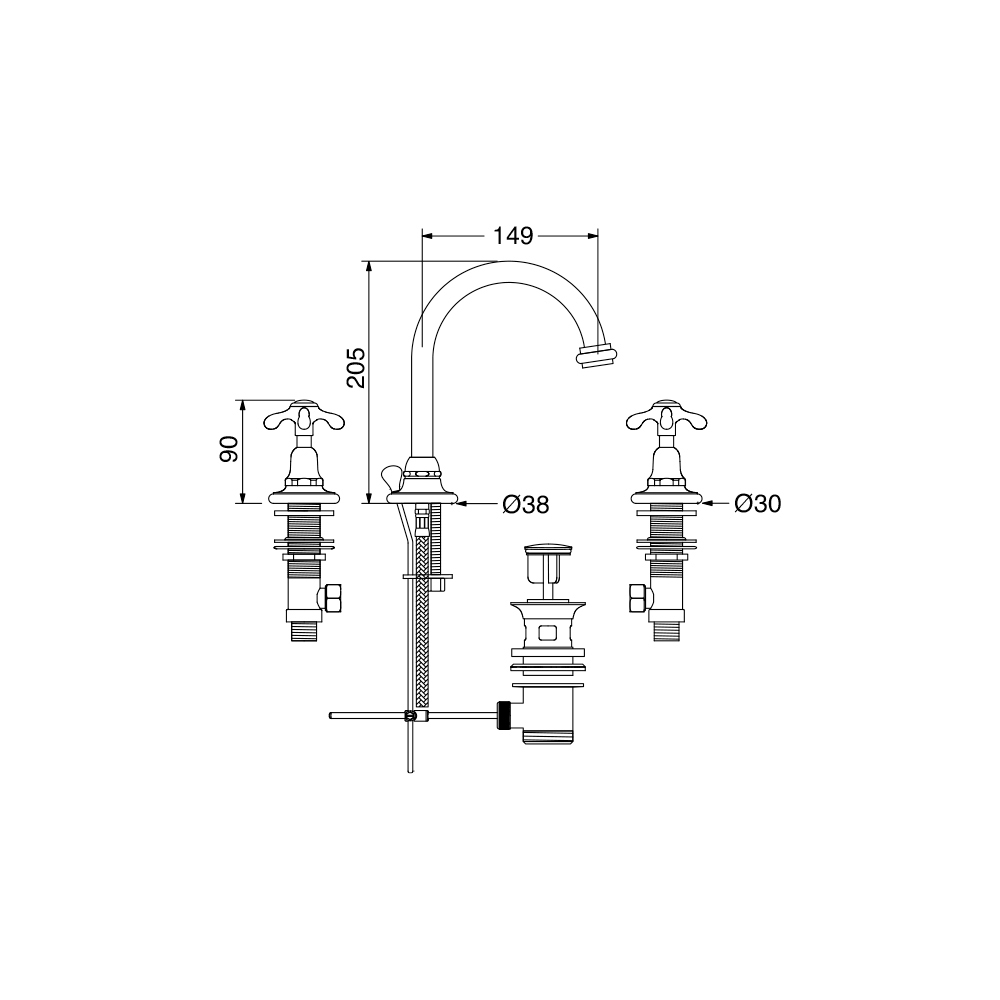 torneira de latão de 3 furos para lavatório de bica alta com ralo..