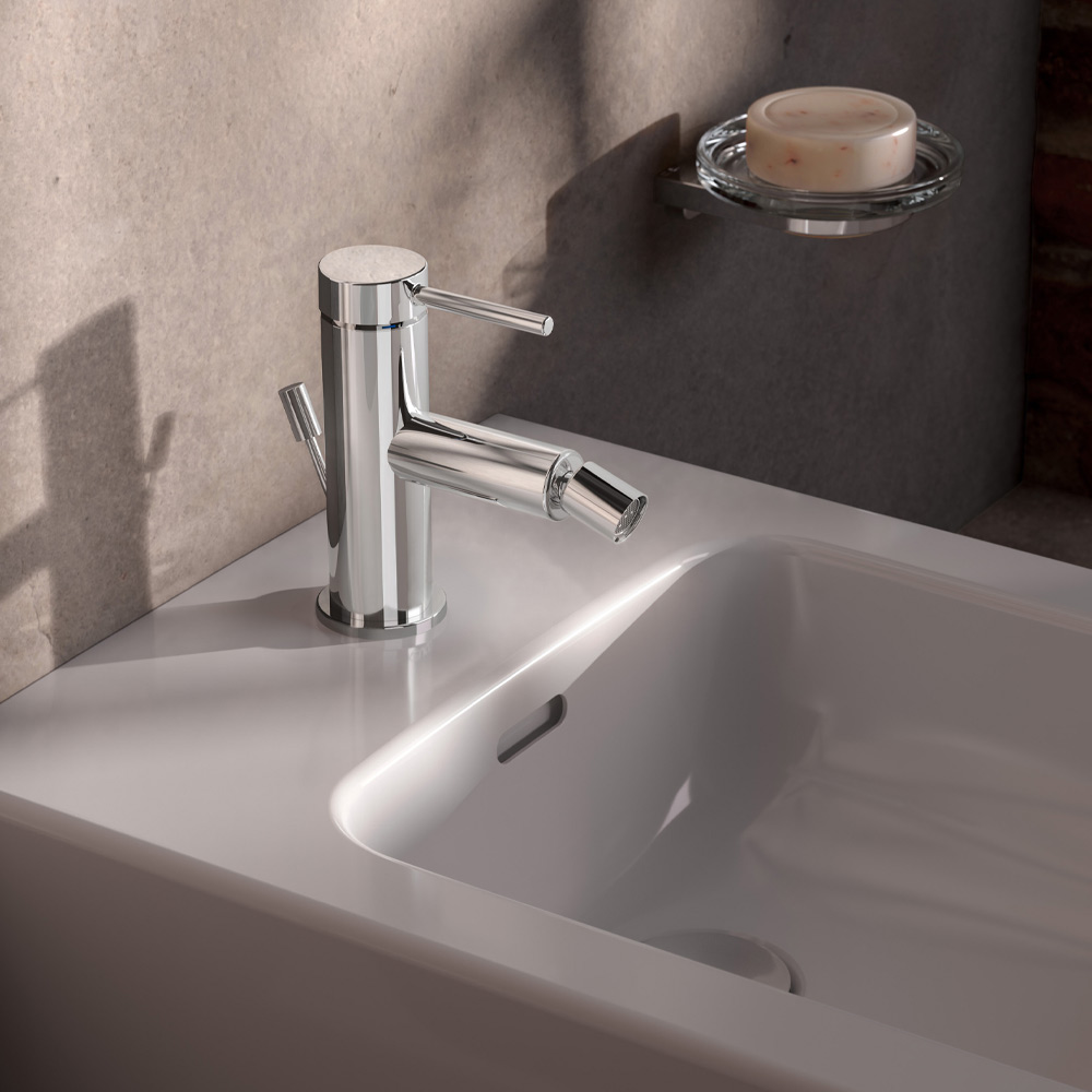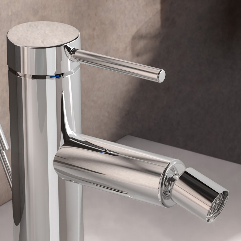 misturador monocomando para bidé possui um design com perfeita sincronia entre o cabo e a bica.