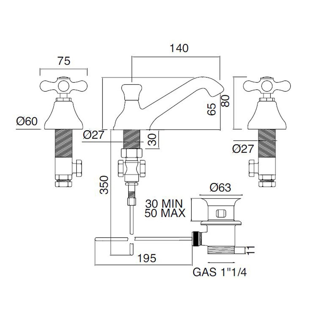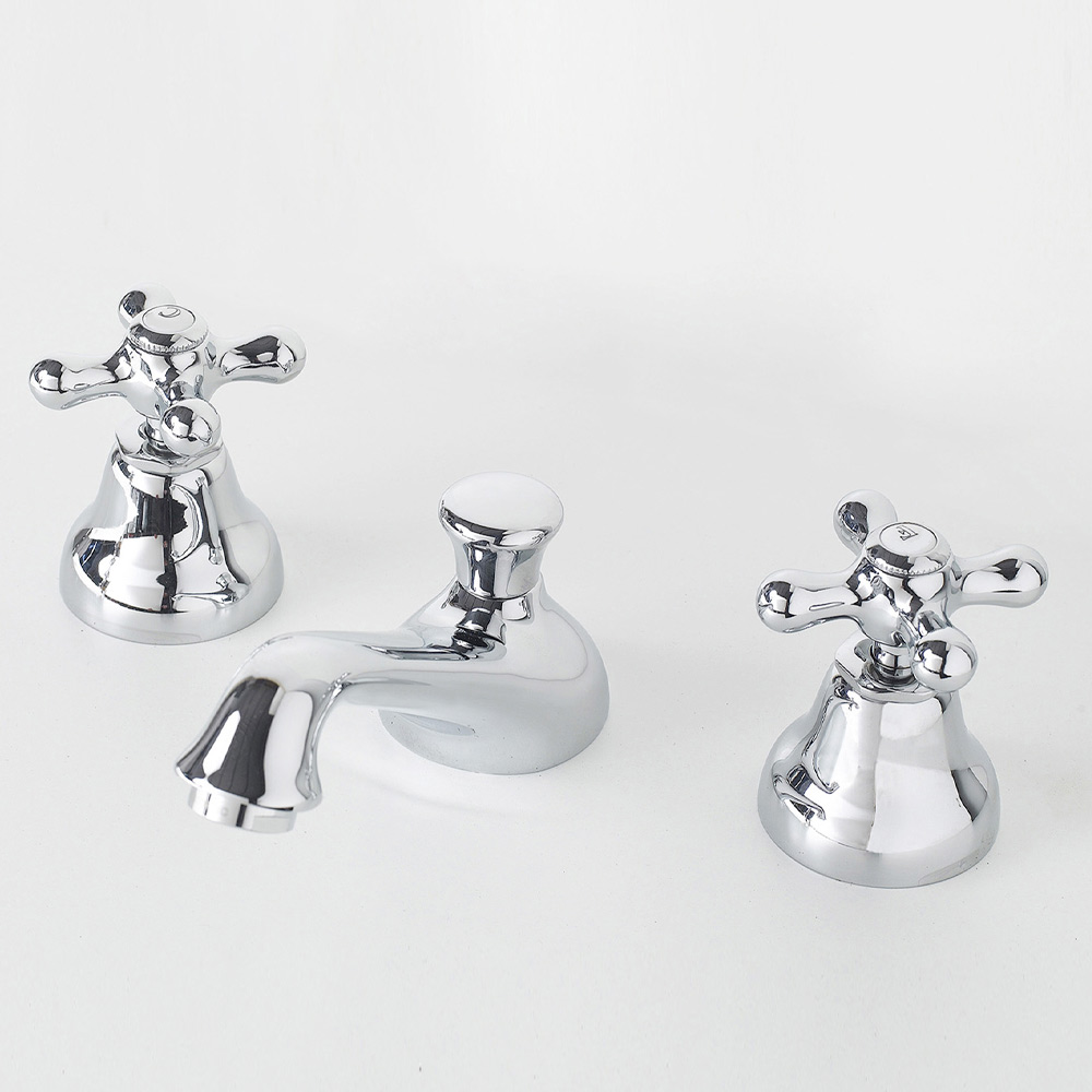 Torneira de lavatório de 3 furos com ralo em latão, peça artesanal fabricada em Itália.