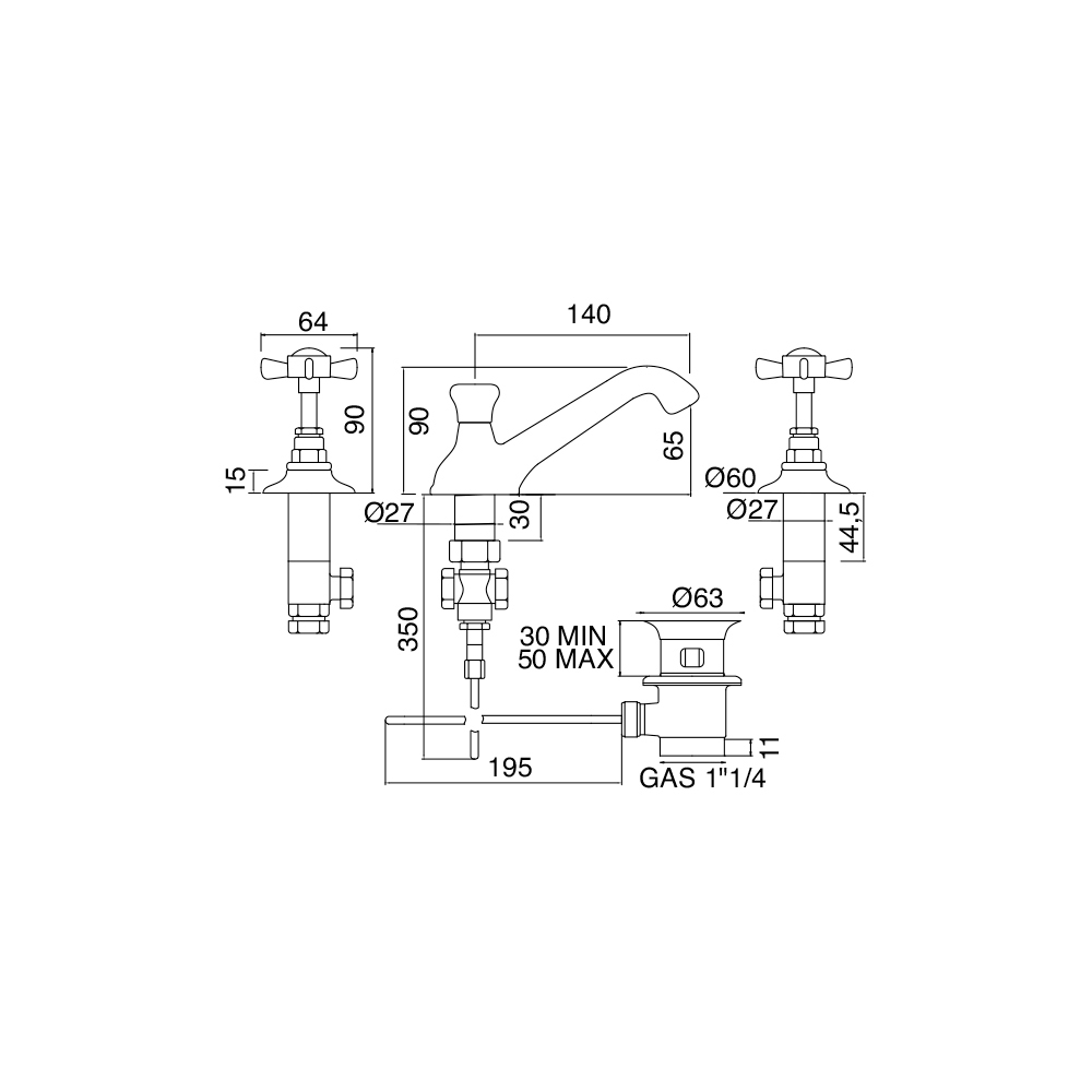 Torneira de lavatório de 3 furos Katerina com design vintage em latão, fabricada em Itália.