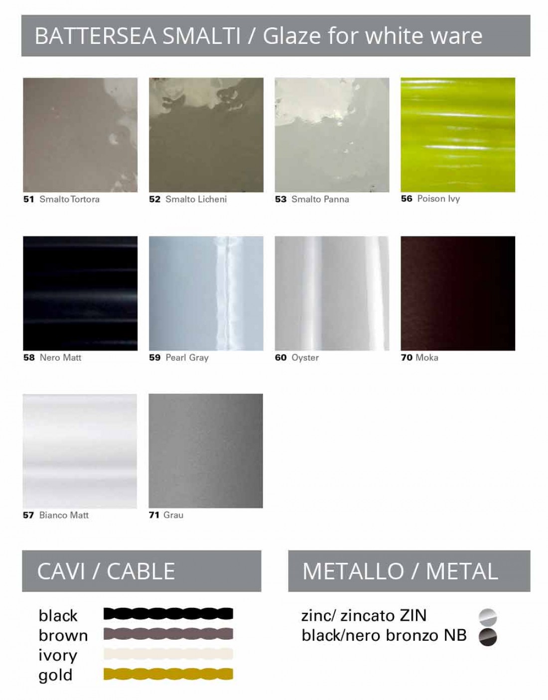 Você pode personalizar o Battersea escolhendo a cor do abajur, da mola de metal e do cabo elétrico. Escreva na caixa apropriada as cores escolhidas.