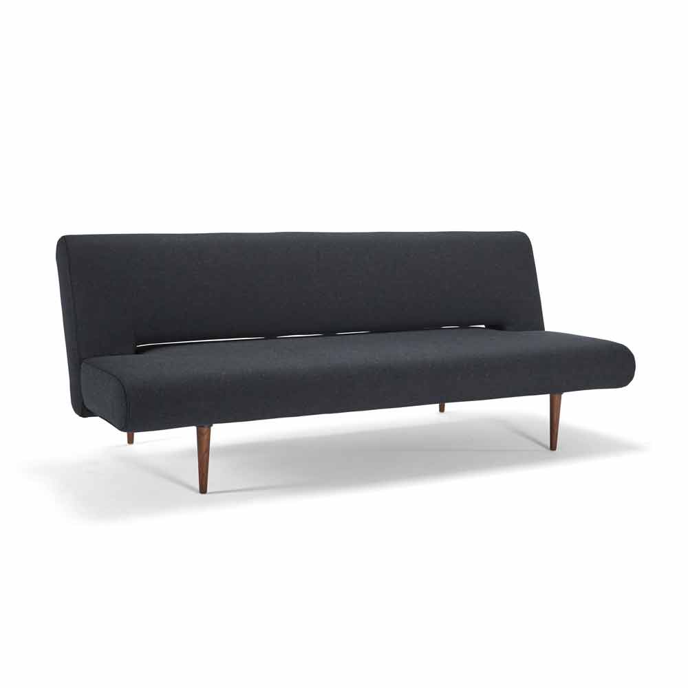 Unfurl é o sofá-cama que vem com uma estrutura de aço preto fosco e pernas de madeira manchadas de escuro.