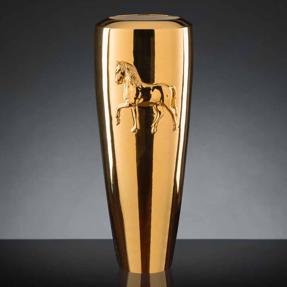 Vaso ornamental alto feito de cerâmica com acabamento em ouro 24k brilhante feito à mão na Itália por artesãos que são especialistas no setor há gerações. Um móvel único cuja estrutura é marcada por formas simples enriquecidas pela decoração frontal que realça a sua singularidade. A cor particular escolhida também o torna extremamente elegante, capaz de completar o mobiliário envolvente com personalidade. A utilização de cerâmica e artesanato agregam seu valor e valor para dar vida a um resultado exclusivo e de alta qualidade . Um projeto ideal para os mais variados ambientes, desde decoração até hotéis, restaurantes, áreas comerciais, spas, mas também como cenário para eventos e casamentos.
