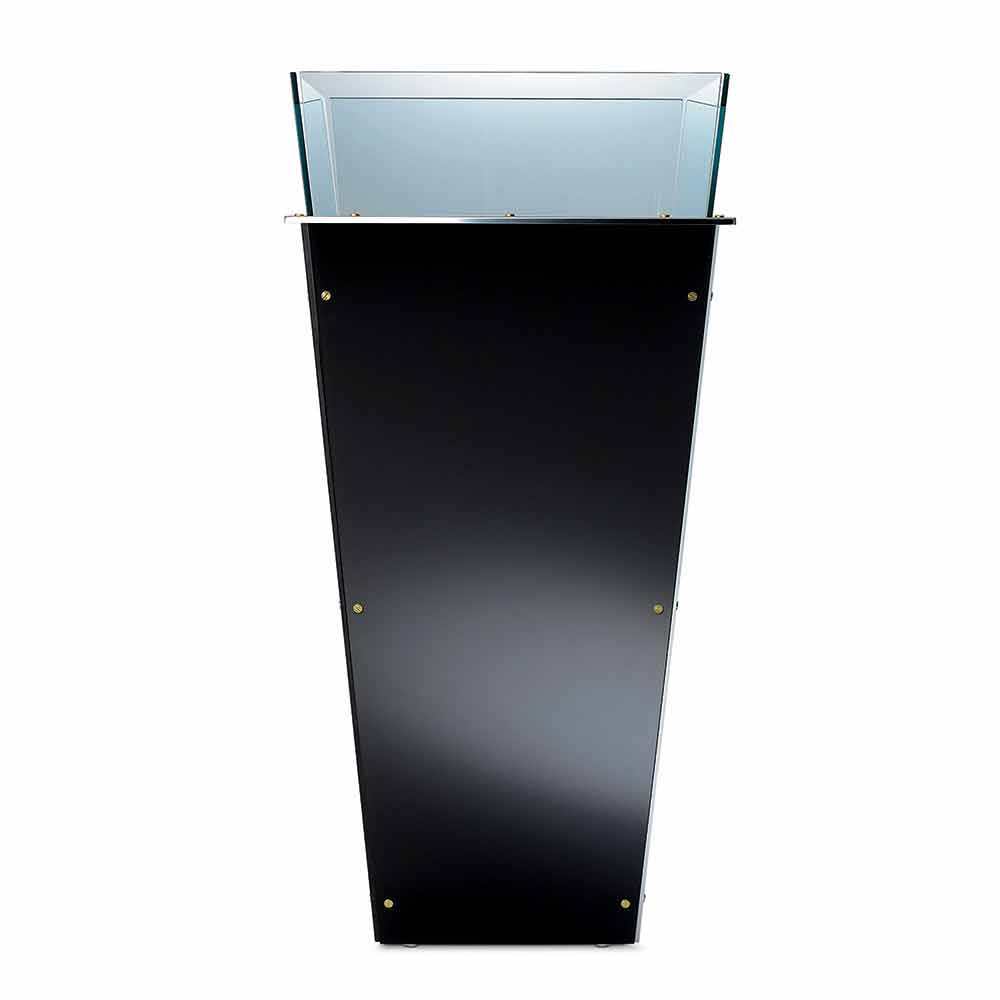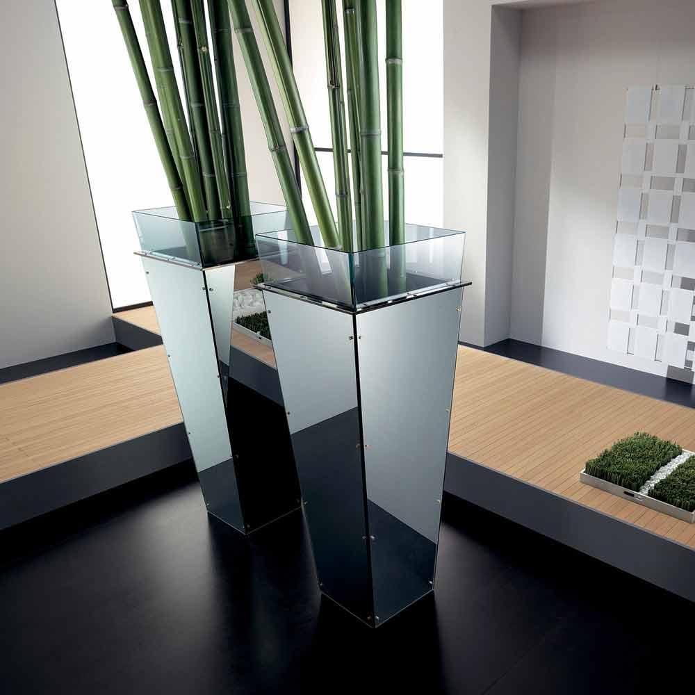 Este vaso autoportante disponível em diferentes tamanhos é caracterizado por painéis laterais intercambiáveis em vários acabamentos, tais como: vidro lacado preto, vidro lacado branco, espelho ou couro.